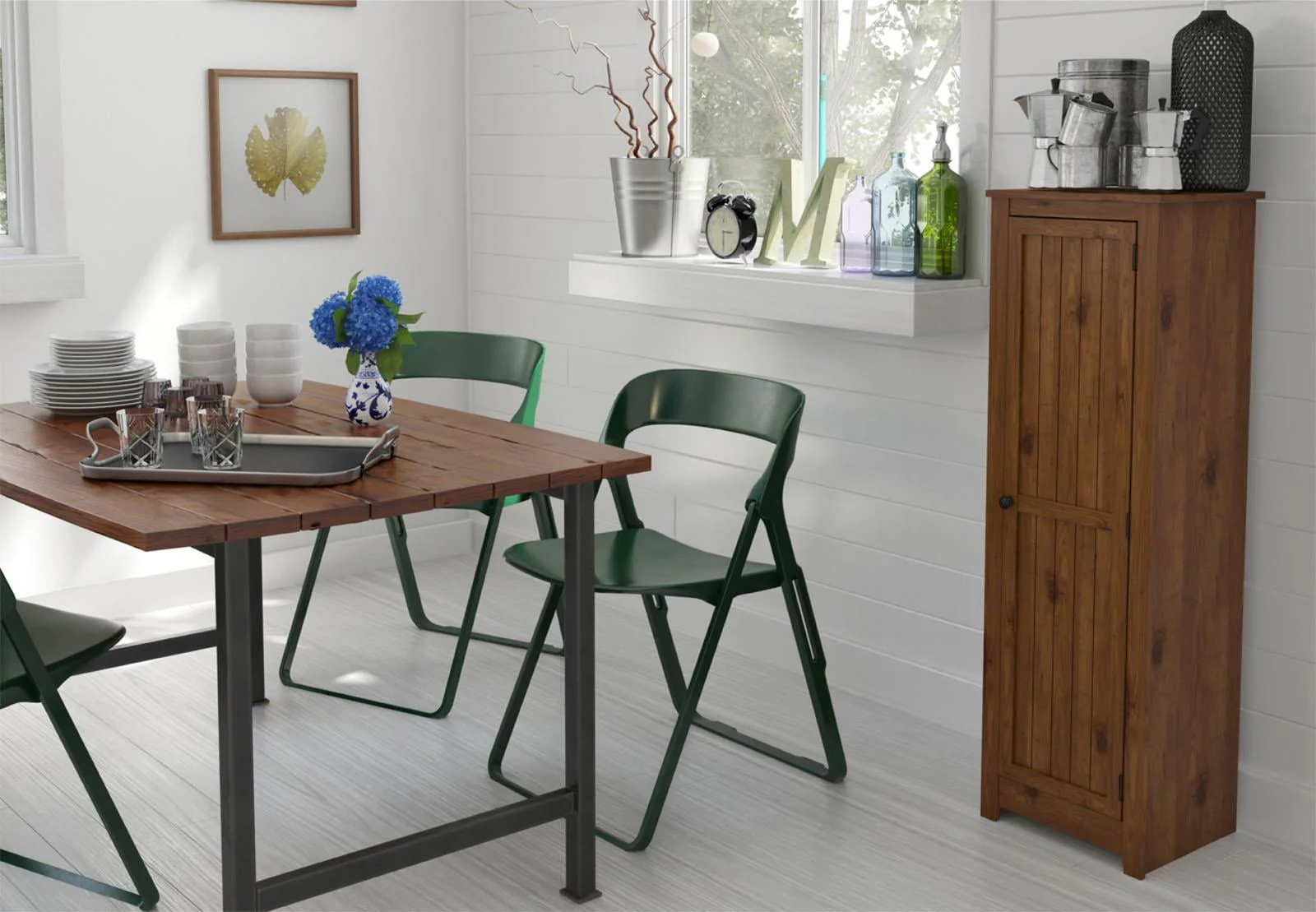 Gain extra storage space in the kitchen, dining room or other areas of your home with the Ameriwood Home Milford Single Door Storage Pantry Cabinet. This Single Door Storage Pantry Cabinet is just 18" wide, making it a perfect for smaller rooms. Inside the Cabinet, 4 shelves offer room for all your pantry items, cereals, canned goods and snacks. You can also use the Storage Pantry to hold dinnerware, mugs, glasses and other serve ware. Two of the shelves are adjustable, allowing you to configure the Cabinet to fit the size of your items. The Single Door Pantry is finished in an Old Fashioned Pine laminate, giving it a warm, rustic look that goes great in any décor. A decorative pewter knob on the Cabinet door adds to the antique styling. The Ameriwood Home Milford Single Door Storage Pantry Cabinet is constructed of laminated particleboard. A wall anchor kit is included to secure the Cabinet to the wall and prevent tipping injuries. The Cabinet ships flat to your door and requires assembly upon opening. Two adults are recommended for proper assembly. Once assembled, the Cabinet measures to be 60.25"H x 18.1875"W x 15.6875"D.