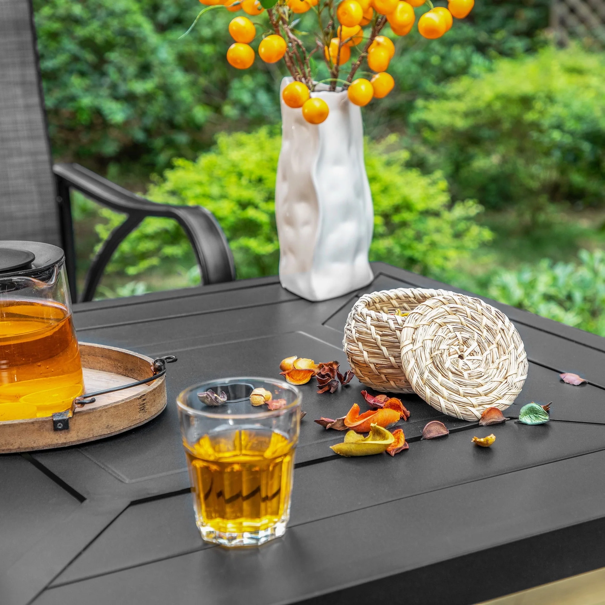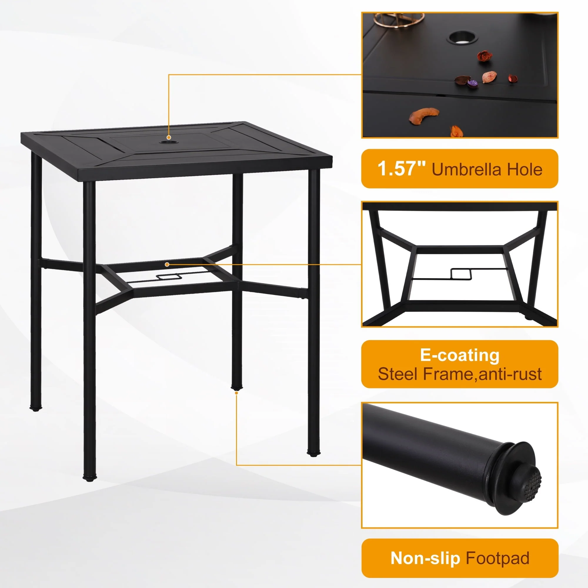Build out your home bar with this bar stool set that is perfect for you to sit back and catch up with friends over a meal or glass of wine. The set includes 1 table and 4 swivel bar stools. Crafted from heavy-duty steel frame with E-coating & powder coated finish, it offers a supportive structure and stands up to outdoor elements for reliable long-lasting strength. The square counter height table offers a large resting place for beverages & snacks and diameter 1.57" umbrella hole. The bar chair features 360° swivel mechanism, breathable sling fabric and sturdy built-in footrest that rounds out with a handy touch and makes hopping in and out a breeze.
