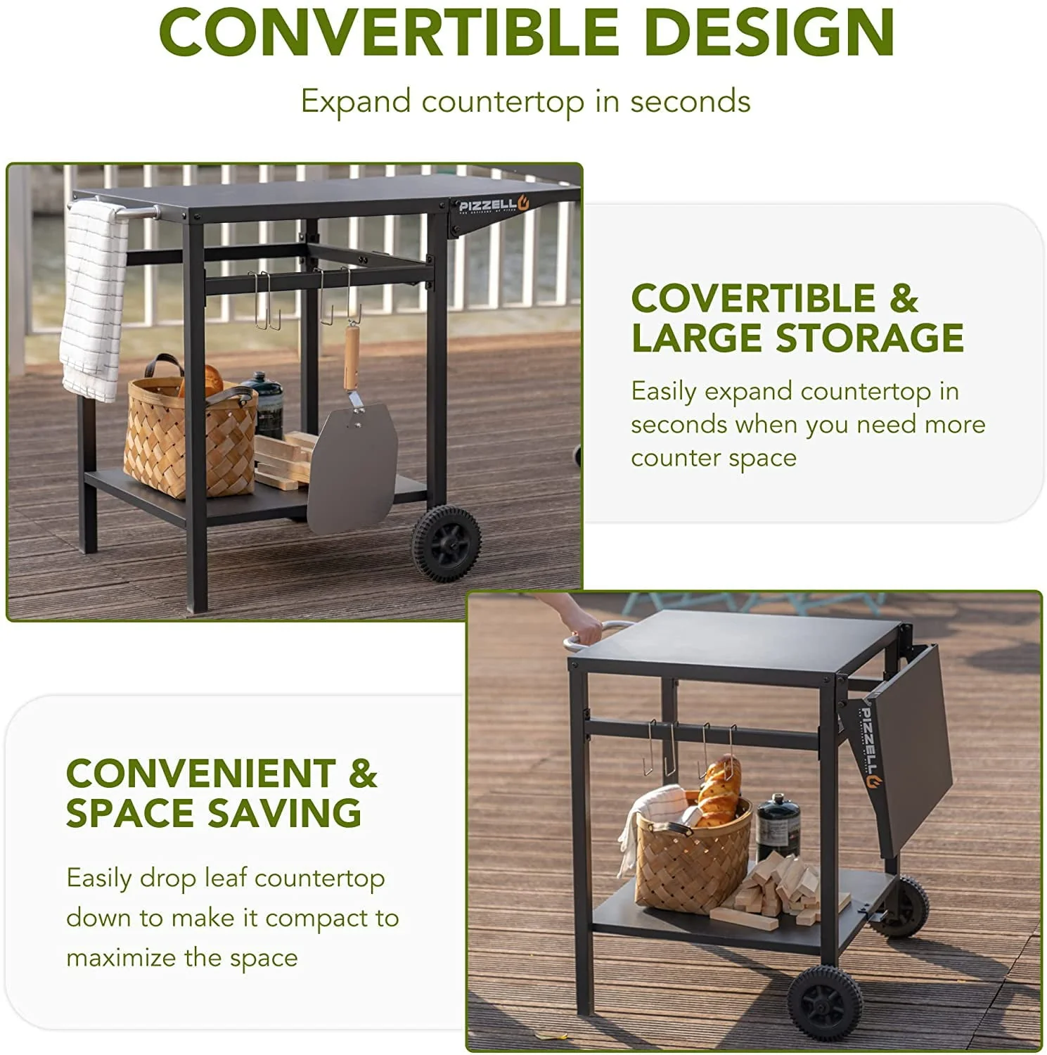 Pizzello outdoor grill carts are double-decker design. Plenty of space to store. The barbeque grill carts also come with 4 hooks. The serving cart bbq is easy to hang towels, brushes, cooking utensils, etc. This outdoor pizza oven cart has stainless steel handles on the side. Pizzello outdoor grill cart with wheel is easy to move. This grilling side cart is very suitable for patios and gardens. The tabletop of this outdoor food prep cart is expandable to add additional usable area. Pizzello outdoor pizza oven cart is ideal for outdoor cooking. Pizzello bbq carts are the perfect grilling tool for outdoor get-togethers.