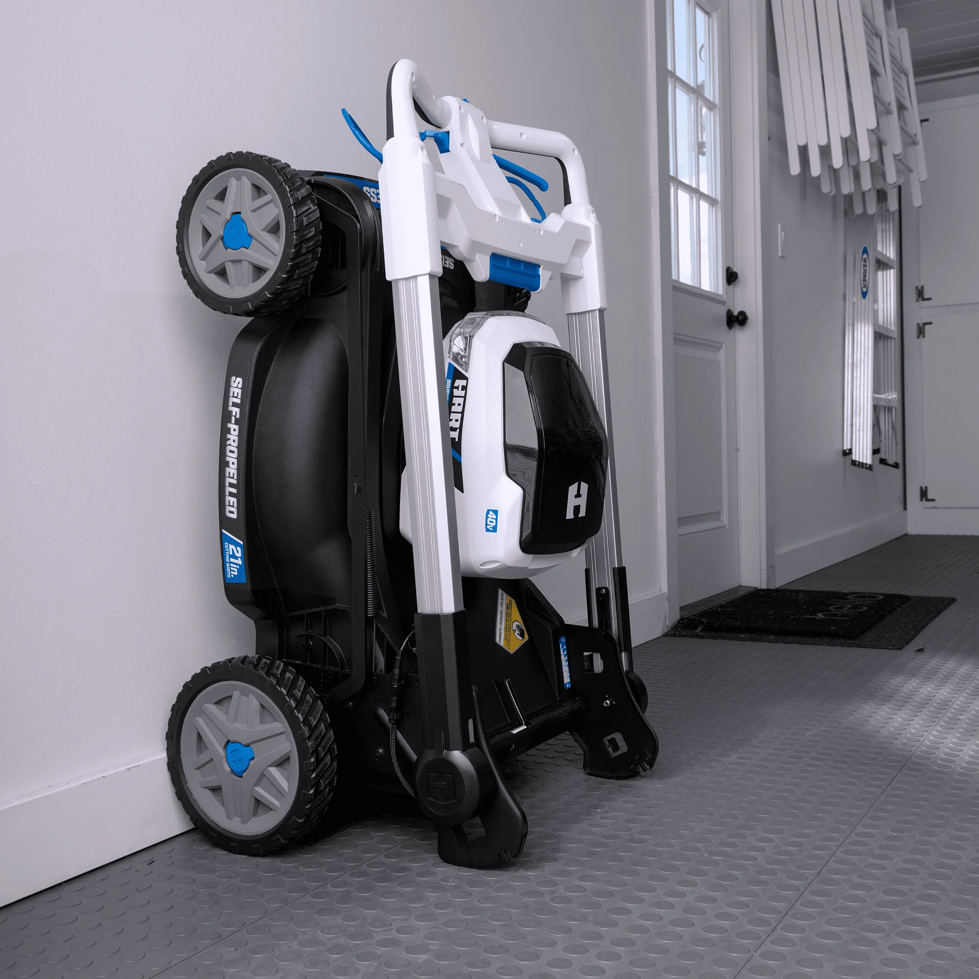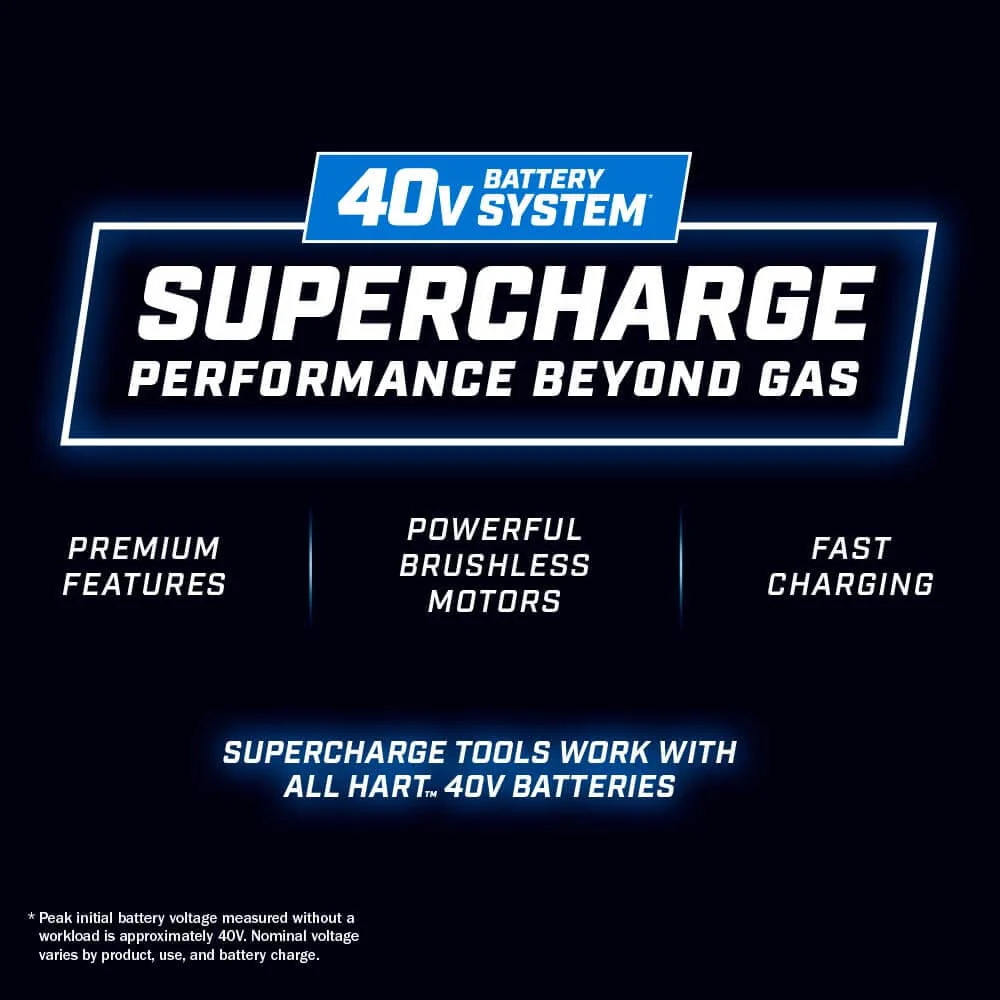 This battery-powered mower has the muscle to cut up to 3/4 acre on one charge. With the included (2) 6.0Ah batteries and dual active battery ports, our cordless 40V 21" Composite Deck Self-Propelled Mower has the added benefit of increased runtime for trekking through a jungle of overgrowth. Choose how you want to mow with 3-in-1 bagging, mulching & side discharge capabilities. It also features pass-through bagging for an easier bag grab. When you’re done, the FAST FOLD handles make for easy upright storage in your garage. The composite deck is strong yet lightweight as well as corrosion resistant. Oh, and that annoying pull cord? It’s gone. This cordless mower starts with just the push of a button. Height modifications are also easily made with a single-point height adjustment knob for a 1"-4" cutting range. Another time-saver, the Fast Charger, only takes one hour per battery to charge. It also has integrated LED headlights to work even in dim conditions. Works with All HART 40V Batteries. With powerful brushless motors, premium features, and fast charging, HART 40V Supercharge is the perfect choice for yards without compromise.
