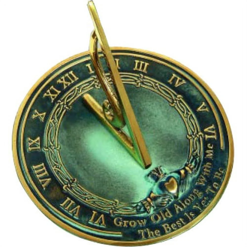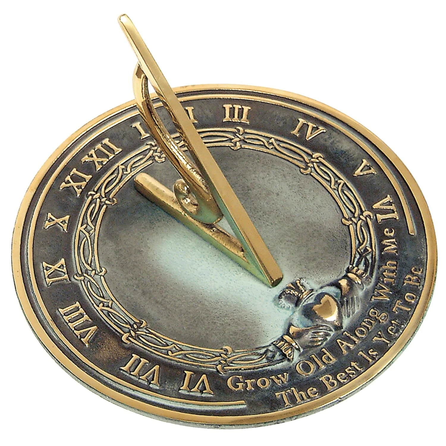 Robert Browning's poem "Grow old along with me, the best is yet to be" is probably the most loved quotation that Rome uses on sundials. This polished brass sundial has a knot work design and a beautiful Irish Claddagh centerpiece, which symbolizes everlasting love.