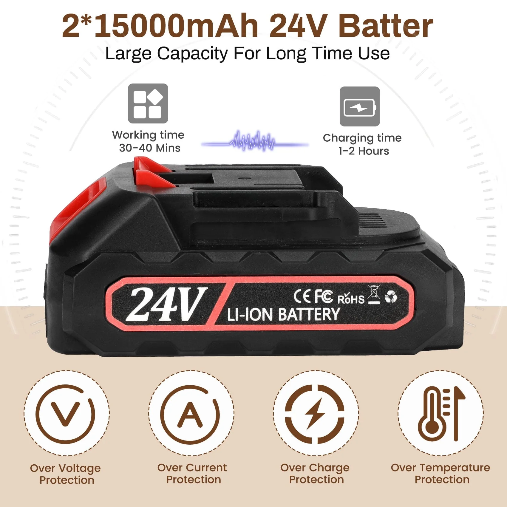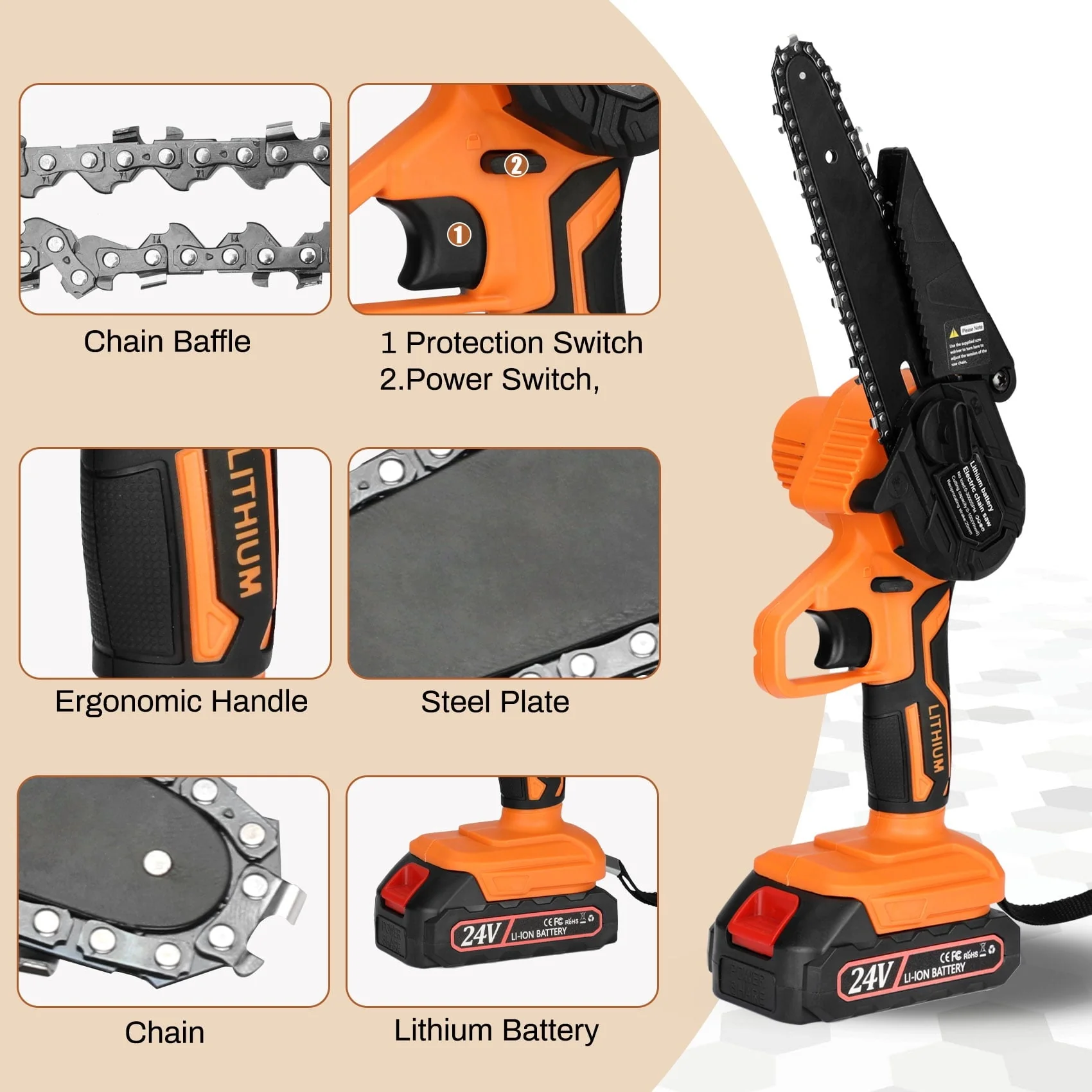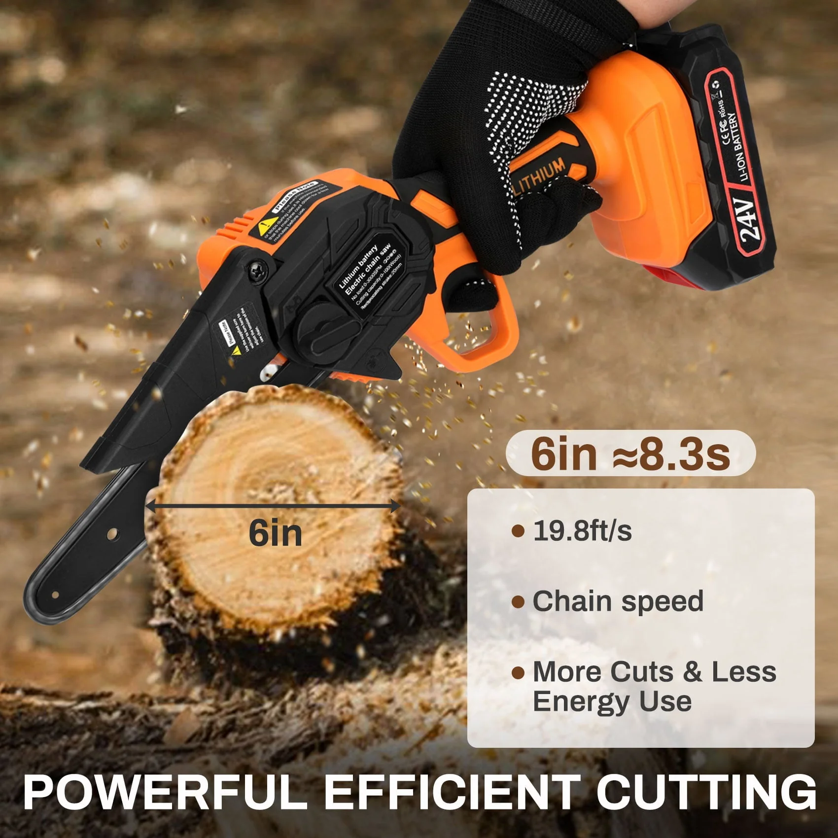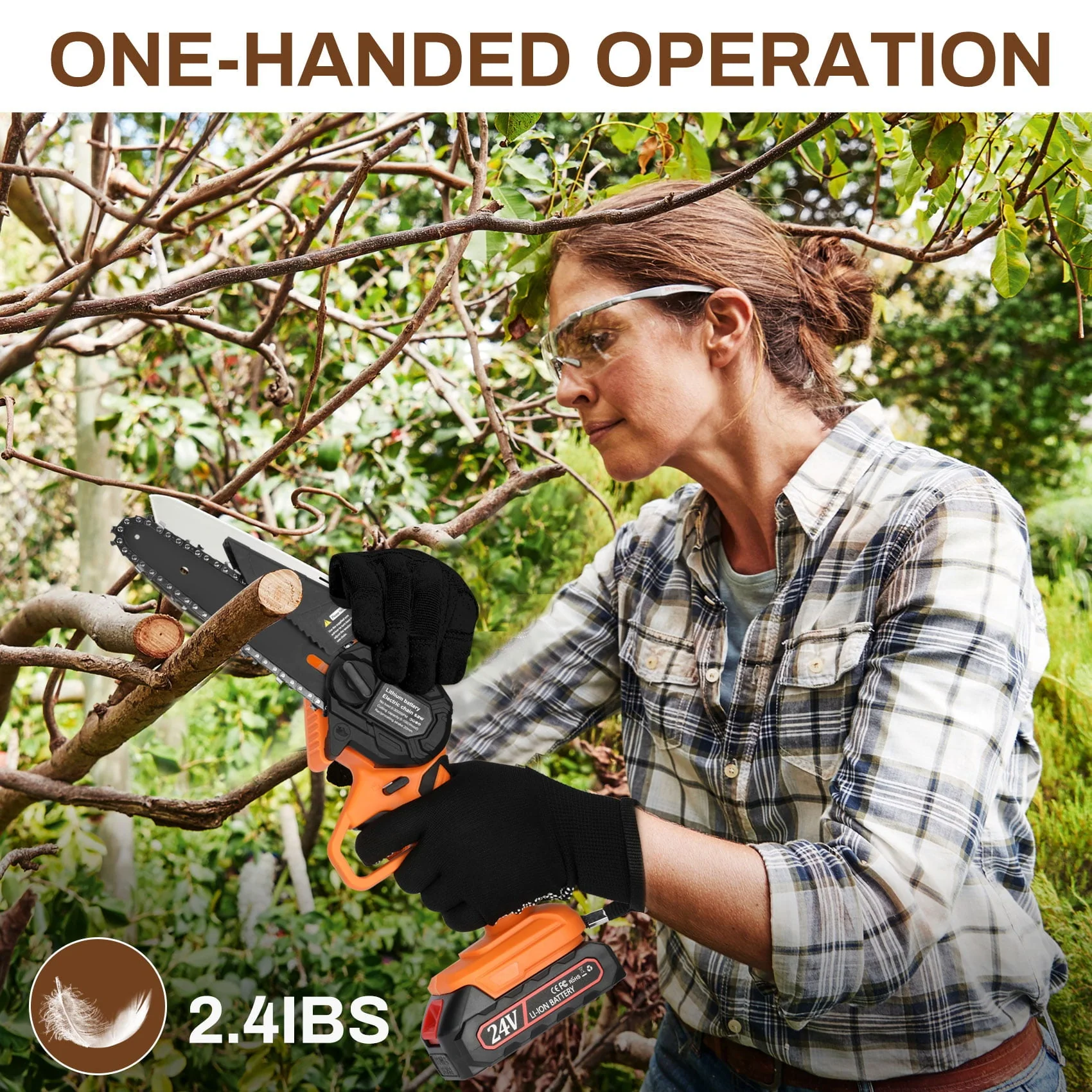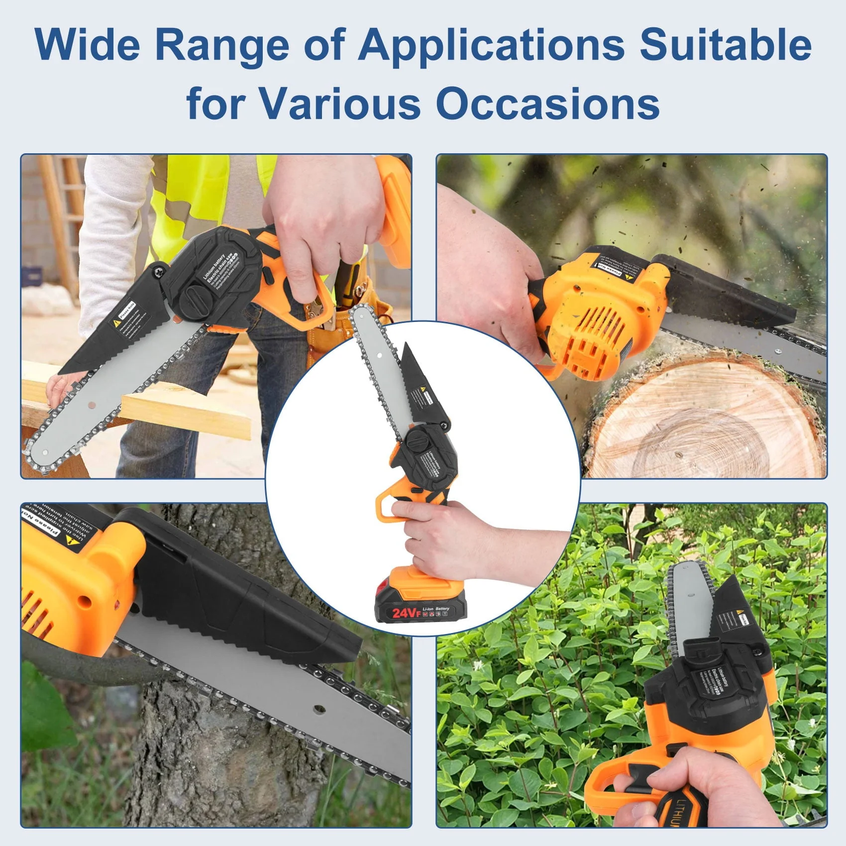 This rechargeable 6-inch wood cutting chainsaw is with 0.7KG slim body, small in size, comfortable to hold, and convenient access to all places. It can be used with one hand and not easy to fatigue for long-term use. Very suitable for family and occasional work, even women can easily control it,Due to this motor over-temperature protection, the chainsaw may stop cutting after 15-20 mins of continuous work, please wait patiently for 3-5 minutes