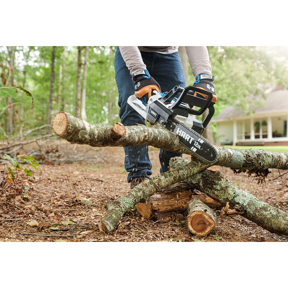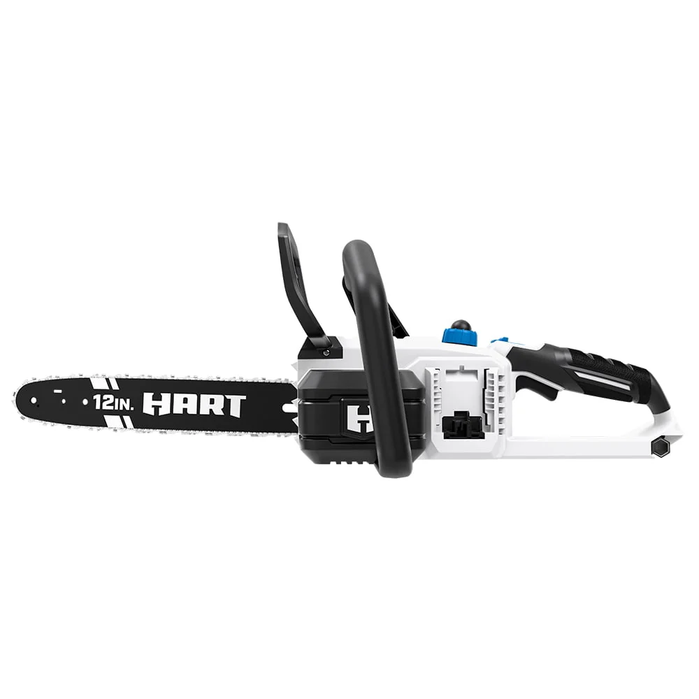 The HART 20V 12-inch Brushed Chainsaw provides the perfect solution for your light trimming and pruning needs. The HART 20V 12 Brushed Chainsaw is ideal for light limbing and trimming small trees and bushes around the yard. The rear comfort grip provides enhanced user comfort and reduced user fatigue during extended periods of use. The push button oiler instantly lubricates your chainsaw blade, ensuring fast and smooth cuts during every use. The HART 20V 12-inch Chainsaw provides a 10" maximum cutting diameter, which is perfect for cutting through small limbs and trees around the house. The HART 20V Battery (Not Included) is compatible with all HART 20V tools. The HART 20V Brushed Chainsaw is covered by a 3-year limited warranty.