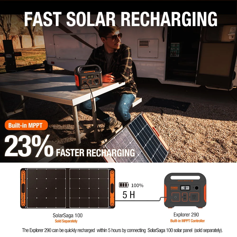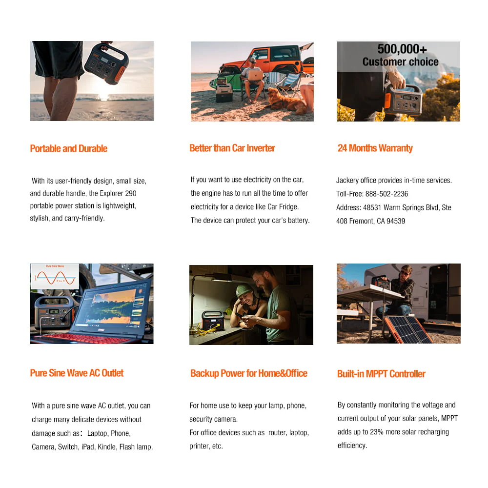 The Jackery Explorer 290 provides 290-Watt hours of power with 200W continuous and 400W peak output to handle your portable power needs, engineered with a rechargeable lithium-ion battery. The Jackery Explorer 290 provides maintenance-free energy without the hassle of fuel or fumes, which makes it suitable for indoor and outdoor use. When you go outdoors to explore nature, which requires technology to stay connected. This requires a lot of power. A pioneer in the industry, Jackery understood mobile lifestyles would require outdoor portable power stations so that you can keep going, especially when you go off the grid. Compact construction combined with the noiseless lithium-ion battery makes this ideal for camping, road trips, tailgating, or festivals where you need easy portable power. Explorer 290 can also be used for home emergencies when suffering from power outages caused by storms, blizzards, storms.
