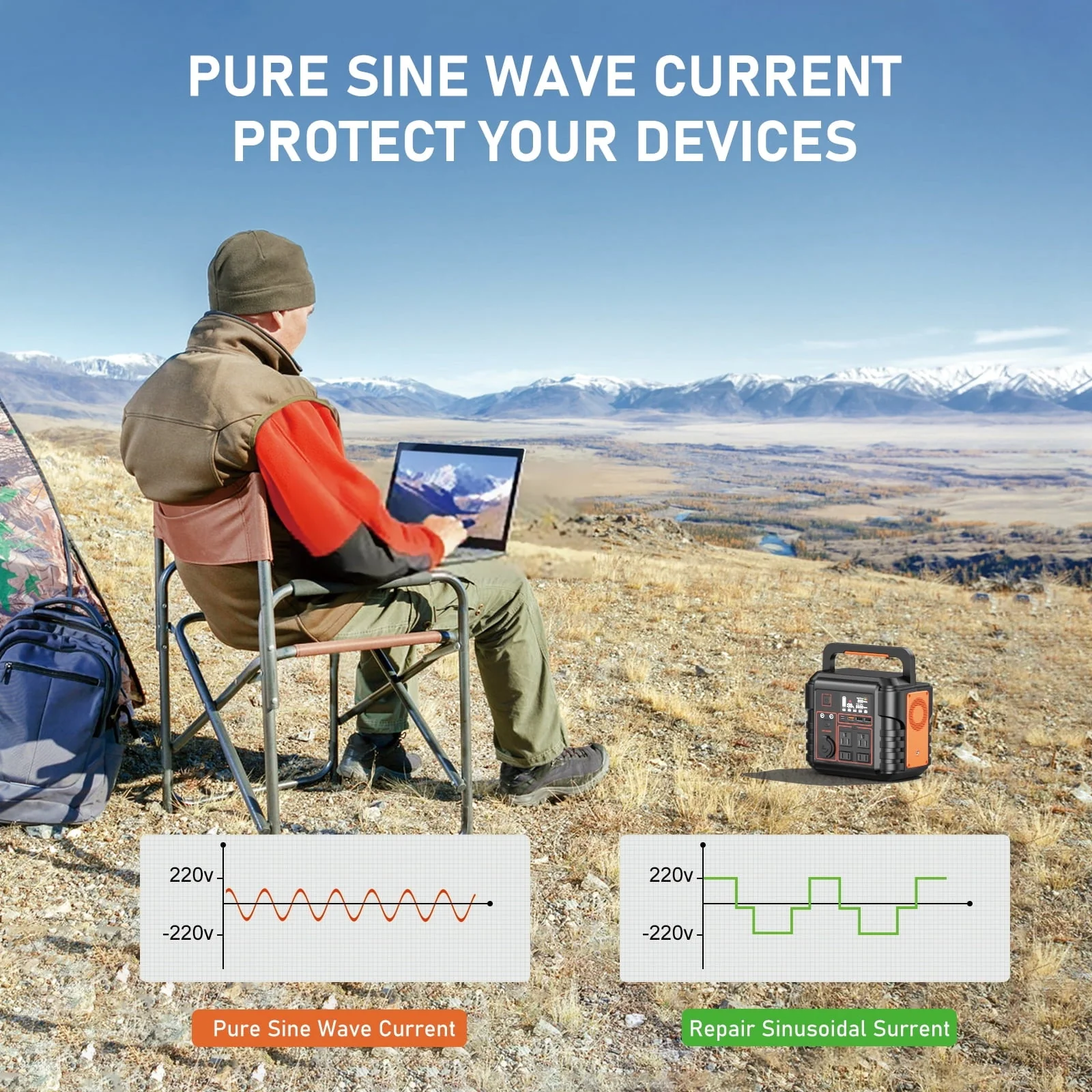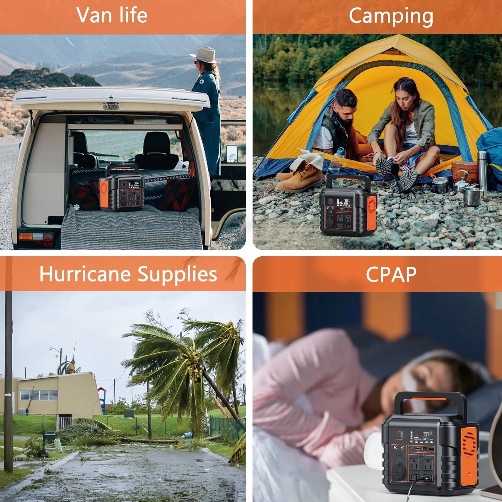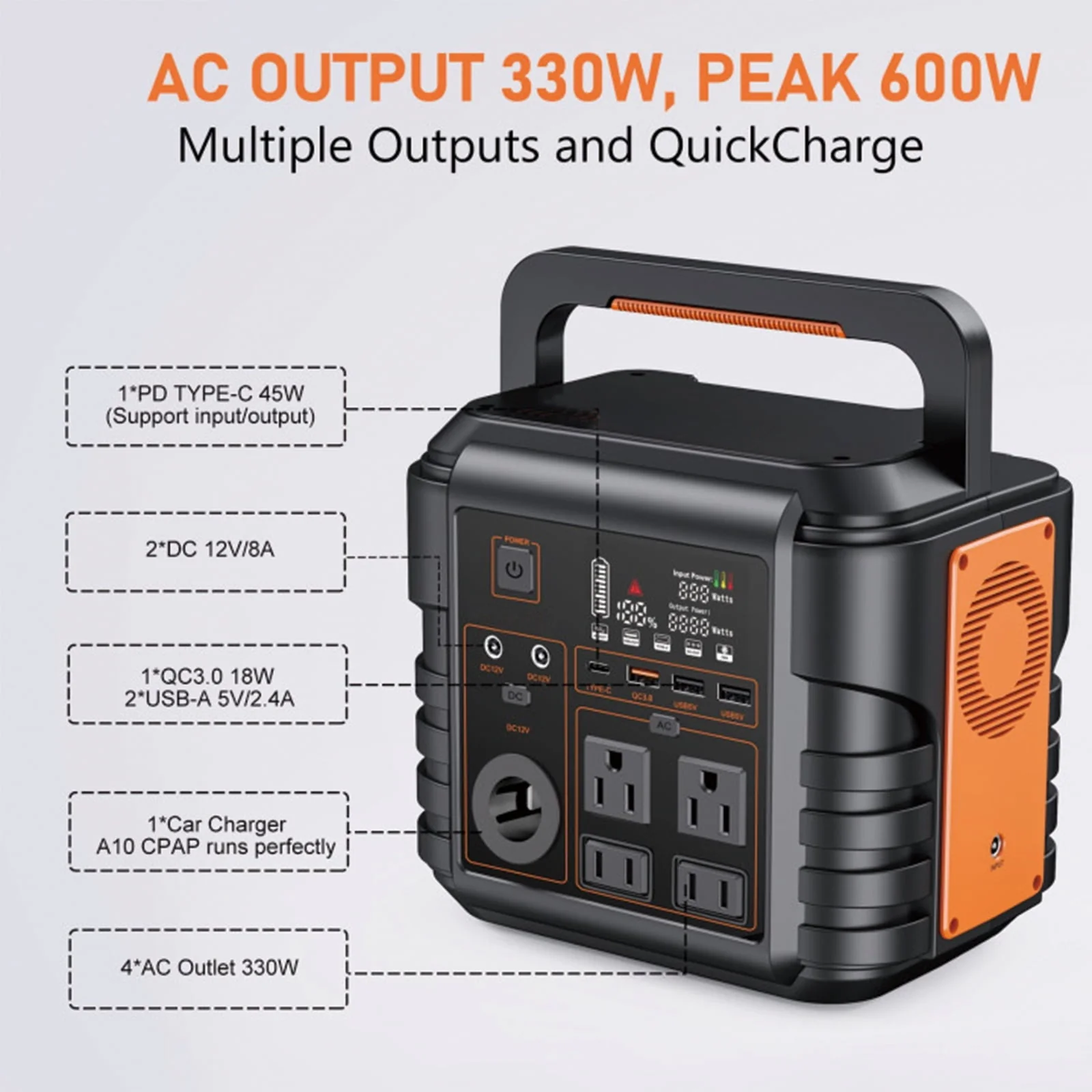PryMAX 330W Portable Power Station (Peak 600W) 296Wh Portable Solar Generator Outdoor Backup Lithium Battery, Mobile Power Station with 110V/330W AC Outlet and LED Light for Family Camping RV Travel Emergency CPAP. Thanks to its compact size and functionality, is ideal for outdoor adventure and emergency battery backup power supply. Quiet and gasoline-free battery powered generator will make life more efficient. This power station keeps your life full of energy! With a 296Wh power capacity, this battery generator can power small appliances and charge up to 11 smart devices at once.