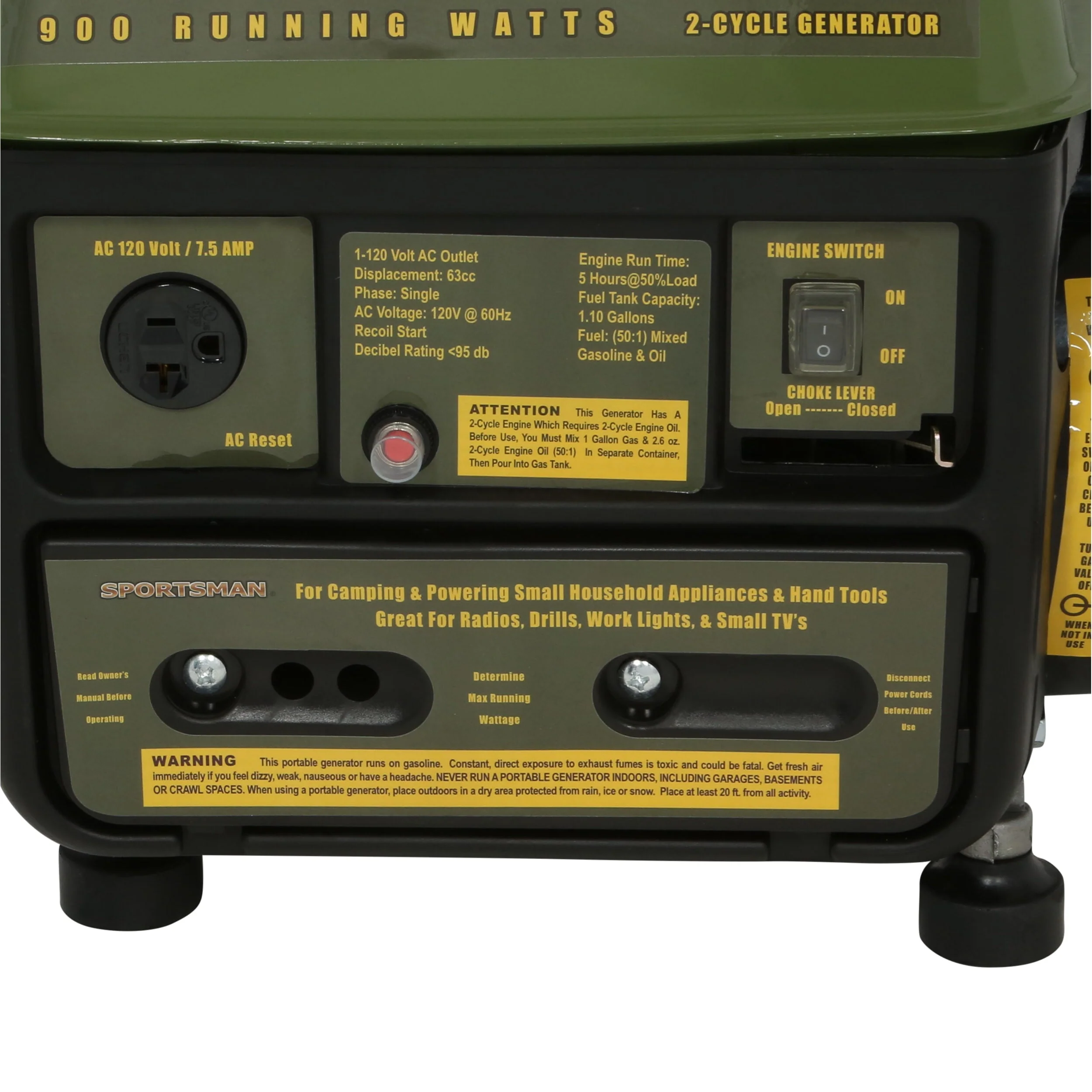 Enjoy your electric-powered devices even while in the the outdoors with this Sportsmans Series 1,000-Watt 2 Cycle Generator in your pack. This tool is just the right size for campers and hikers who wish to use a portable TV, radio, small store, grill and other small appliances while on the trip. Designed to be lightweight and portable, this Sportsmans generator can easily be transported in the trunk of a car for use at tailgating parties, sporting events or campsites. This model is equipped with a single 120-volt outlet. It has a recoil-start function and can run for up to six hours with a 50 percent load on 1.1 gallons of fuel. This 1,000-watt generator works relatively quietly at less than 62 dB. It's designed with an overload protection for safety.