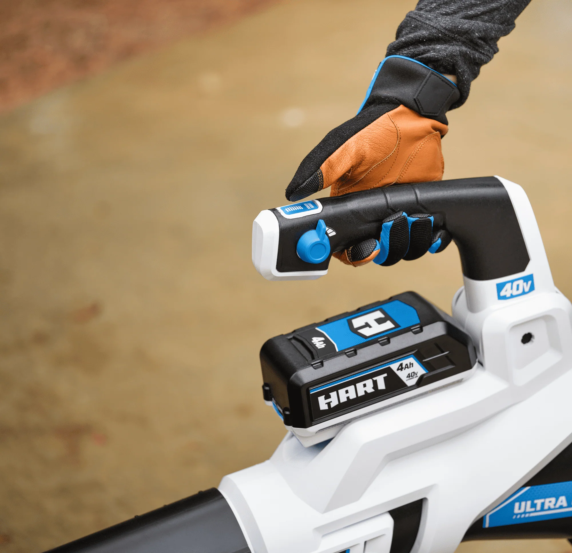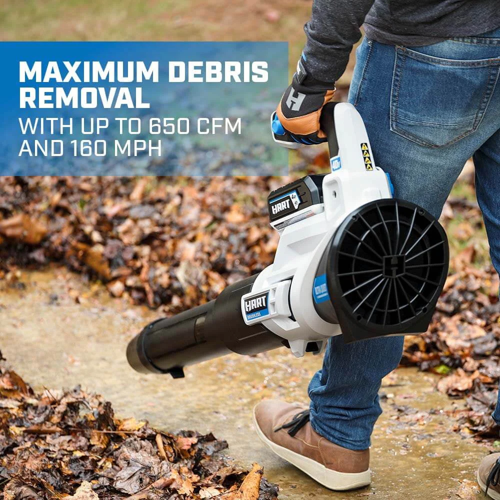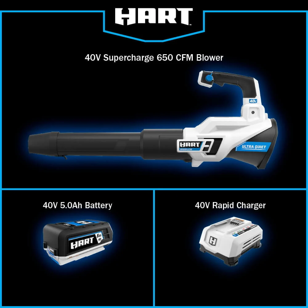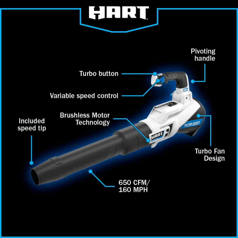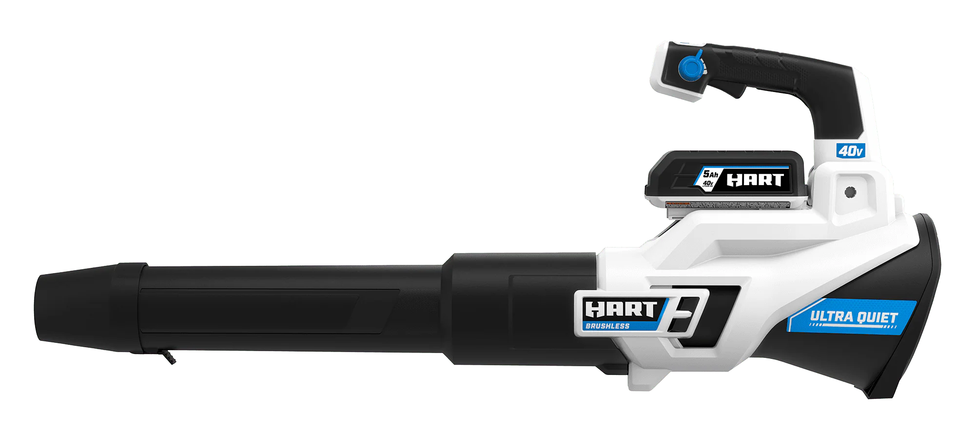 For high-volume cleanup, you can count on HART’s 40V SUPERCHARGE Brushless 650 CFM Blower to clear your yard quickly and efficiently. Not only does it clear stubborn materials such as wet leaves, but also lifts and moves twigs, grass clippings and more. The turbo fan design with speed tip provides 650 CFM and 160 MPH of power, while the variable speed trigger gives you the ultimate control. Its lightweight, compact design provides the ultimate user comfort during extended periods of use. Plus, there’s no stubborn start-up cord to deal with. Just press the turbo button for maximum clearing power. Battery power also eliminates the fumes and mess that comes with gas-powered blowers. The Brushless Motor Technology delivers more power, longer runtime and longer motor life. It’s also cordless, so you’re free to work anywhere without tripping over or getting tangled up in cords. Finally, the *Ultra-Quiet Technology* makes it our quietest blower to date. The included 40V 5.0Ah battery is compatible with all HART 40V tools. With powerful brushless motors, premium features, and fast charging, HART 40V SUPERCHARGE is the perfect choice for yards without compromise.