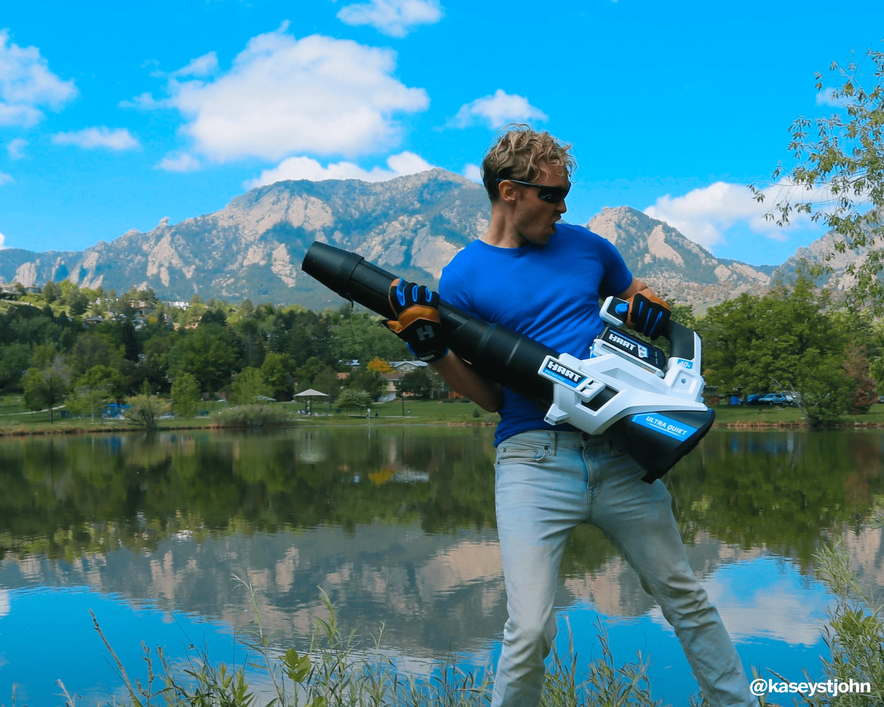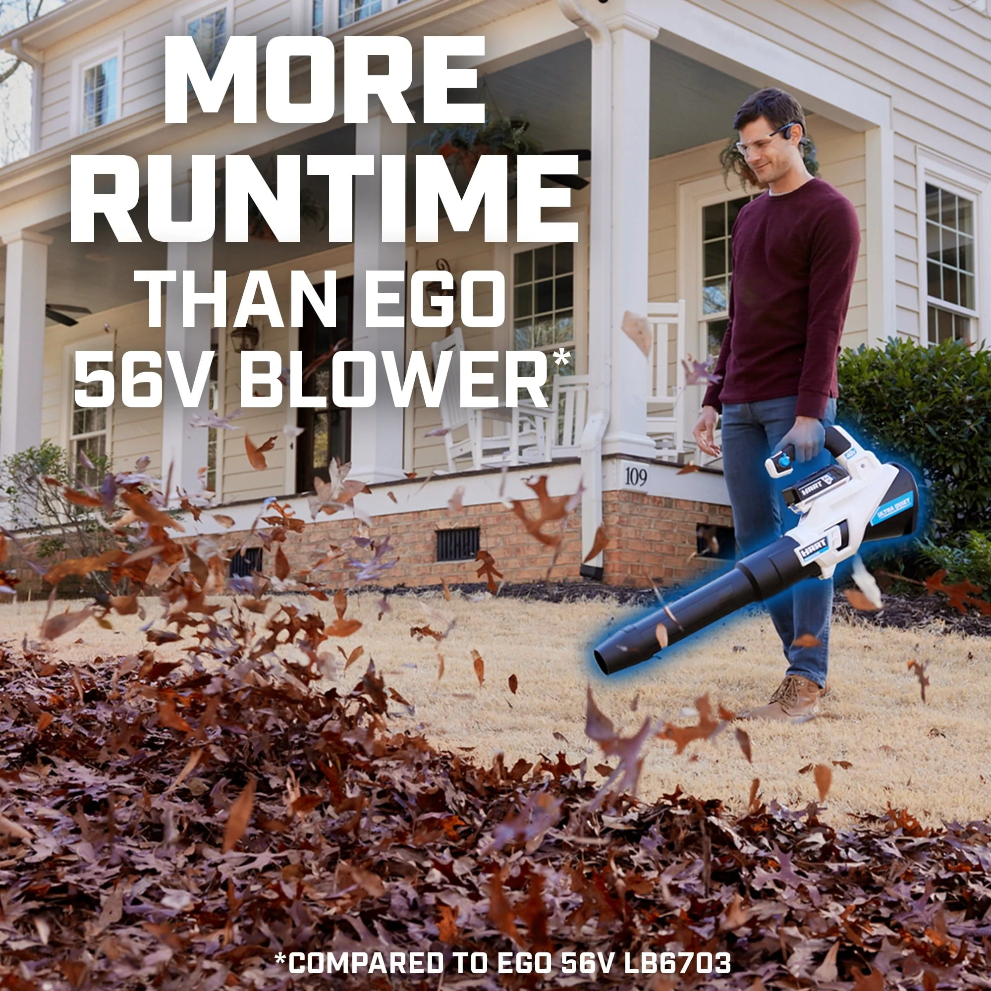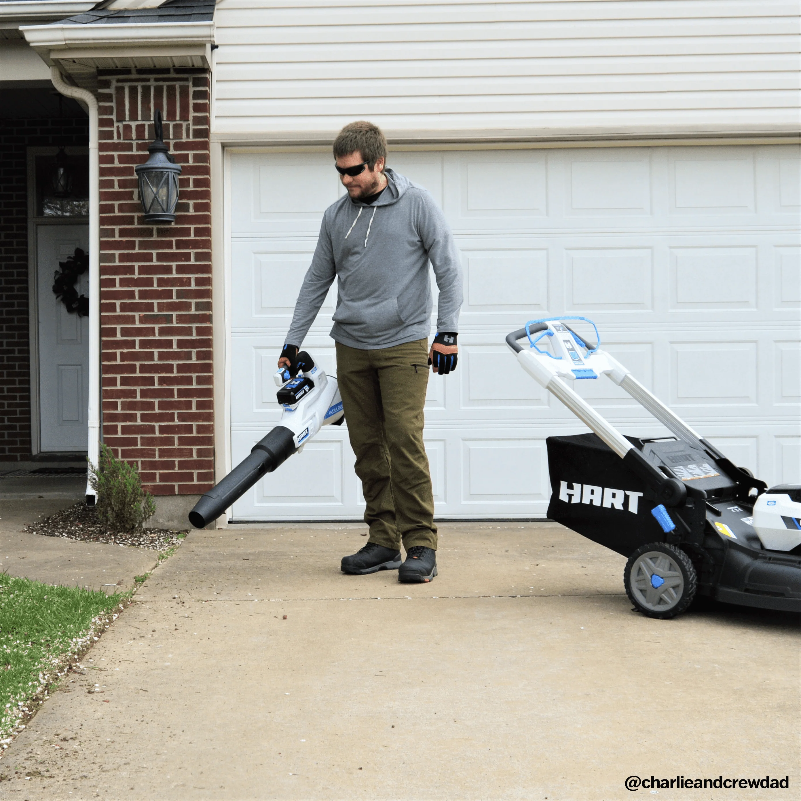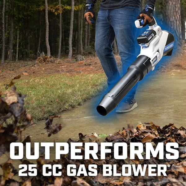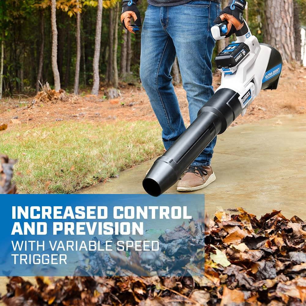 For high-volume cleanup, you can count on HART’s 40V SUPERCHARGE Brushless 650 CFM Blower to clear your yard quickly and efficiently. Not only does it clear stubborn materials such as wet leaves, but also lifts and moves twigs, grass clippings and more. The turbo fan design with speed tip provides 650 CFM and 160 MPH of power, while the variable speed trigger gives you the ultimate control. Its lightweight, compact design provides the ultimate user comfort during extended periods of use. Plus, there’s no stubborn start-up cord to deal with. Just press the turbo button for maximum clearing power. Battery power also eliminates the fumes and mess that comes with gas-powered blowers. The Brushless Motor Technology delivers more power, longer runtime and longer motor life. It’s also cordless, so you’re free to work anywhere without tripping over or getting tangled up in cords. Finally, the *Ultra-Quiet Technology* makes it our quietest blower to date. The included 40V 5.0Ah battery is compatible with all HART 40V tools. With powerful brushless motors, premium features, and fast charging, HART 40V SUPERCHARGE is the perfect choice for yards without compromise.