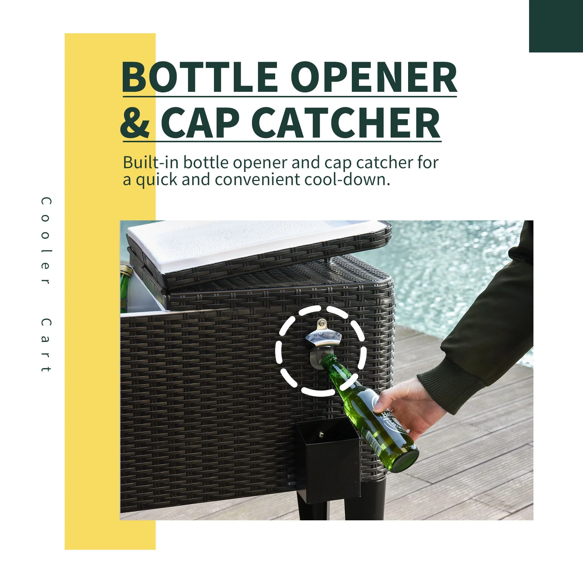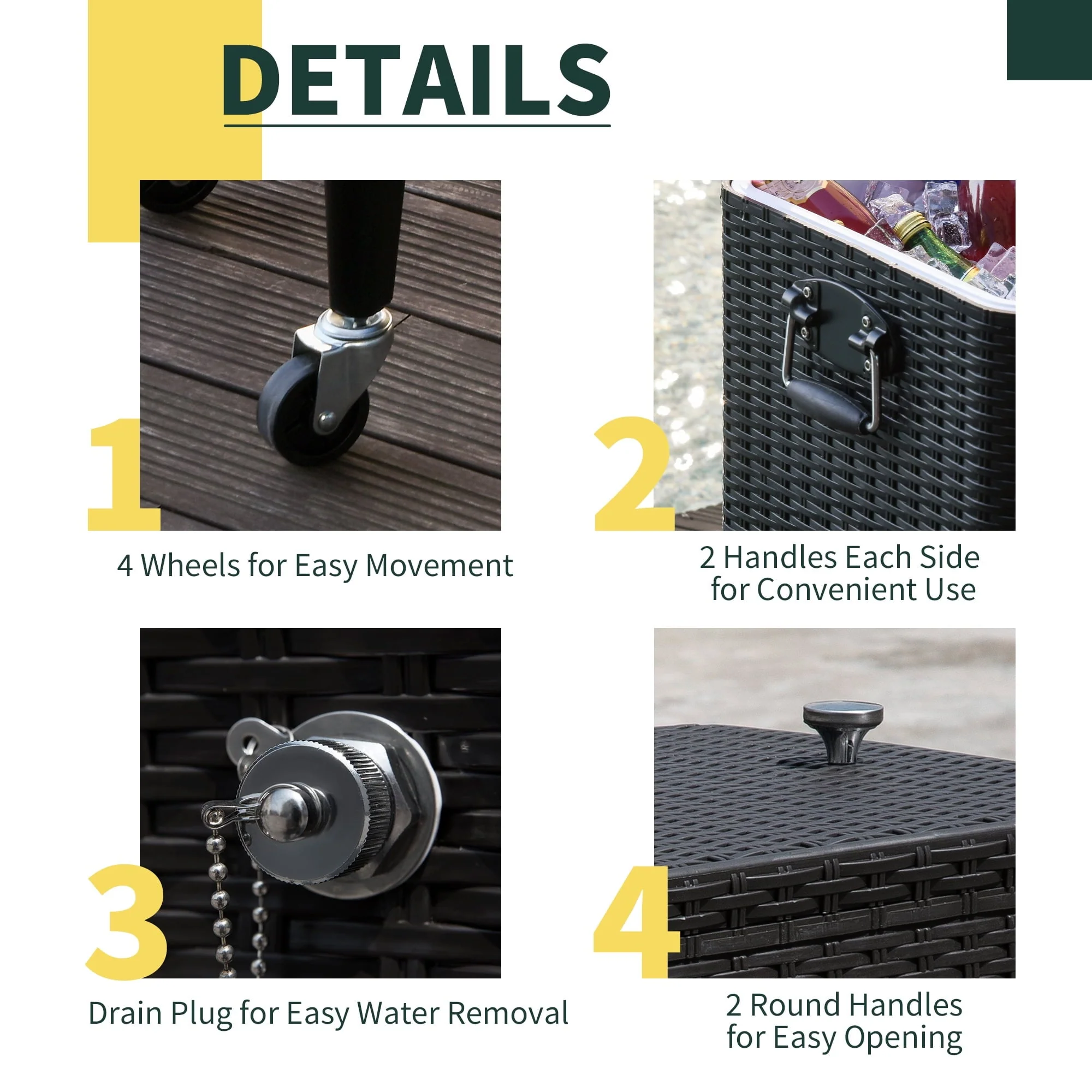 Bring the party with you wherever you go with our portable rolling cooler cart from Outsunny. Made of durable steel with a stylish colored finish, it’s the perfect companion to any outdoor gathering. This 80 quart (20 gallon) cooler has two openings so you can easily access both sides and features convenient handles on each side as well. A drainage hole located on the back lets you quickly remove excess water while a convenient bottle opener with cap catcher is attached to the front. It features four wheels which allows you to bring this cooler with you anywhere you go and then keep it in place with two locking wheels. The attached bottom shelf can be used to hold additional accessories such as mixers or cups. Get your summer started right with this versatile rolling cooler from Outsunny and turn your patio from a waste of space to the party place.