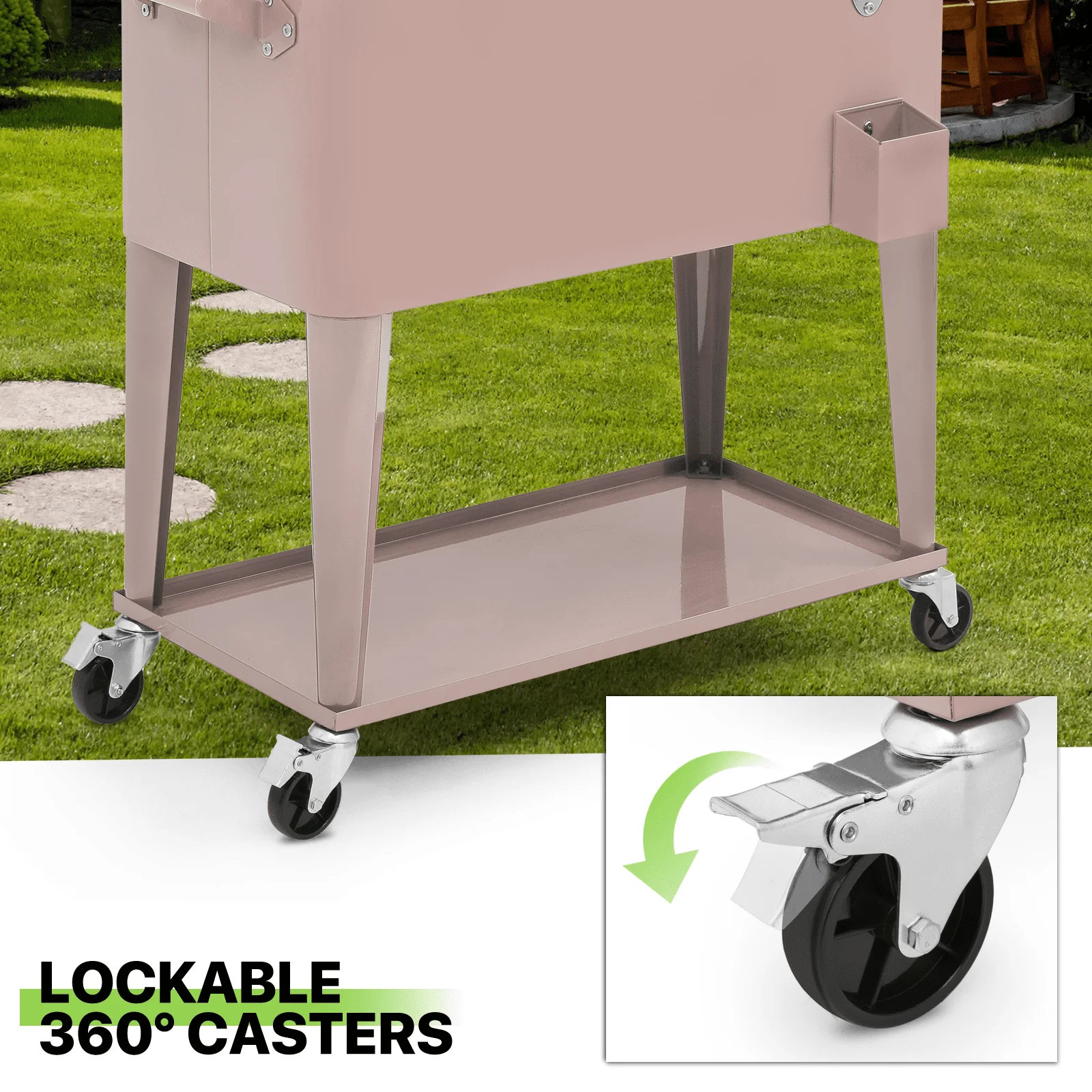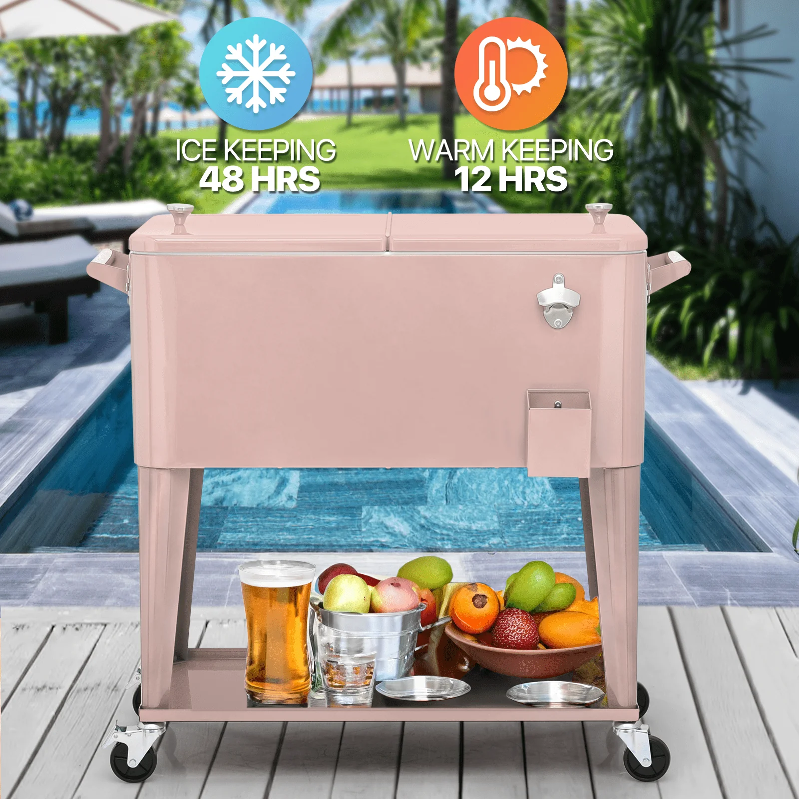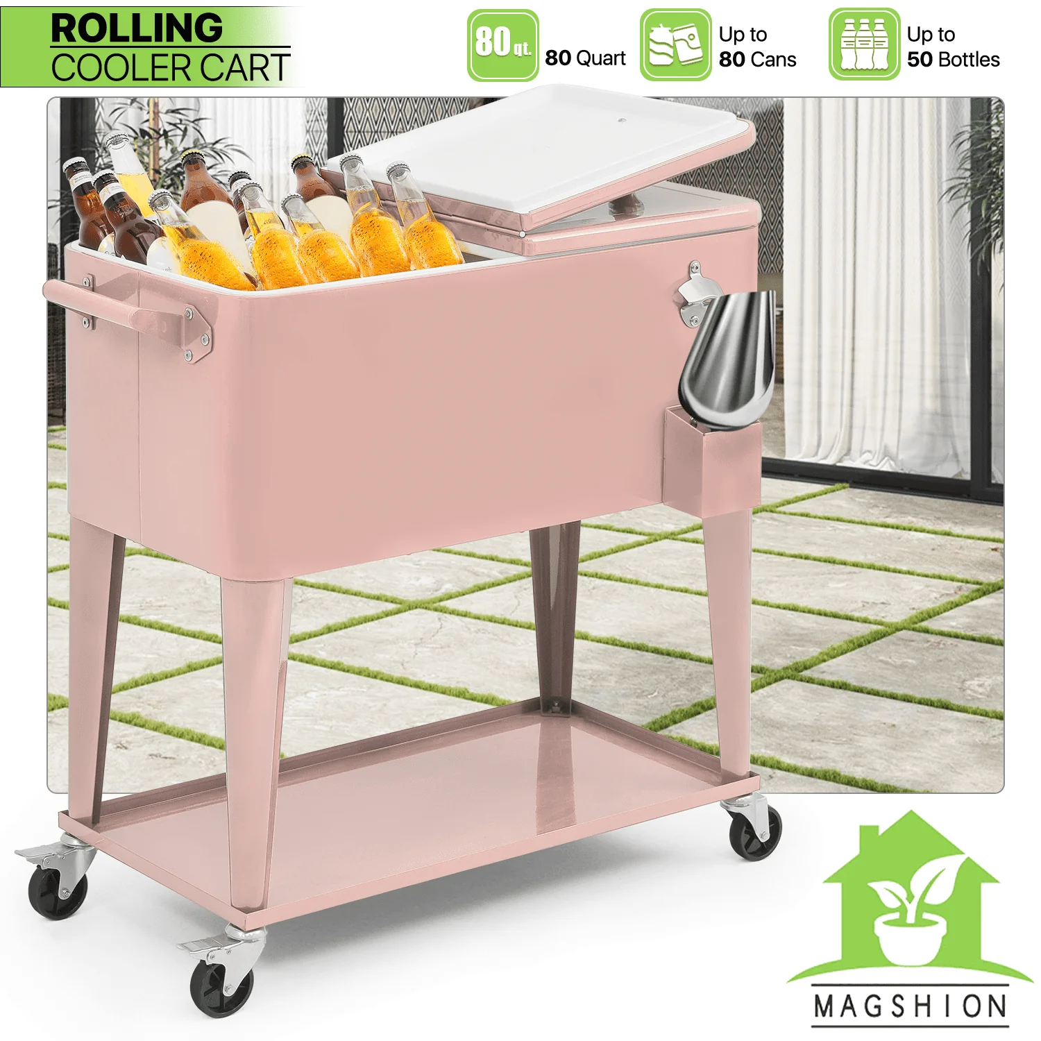 • Magshion 80 Quart Rolling Cooler Ice Chest, Portable Bar Cold Drink Beverage Cart Tub, Backyard Cooler Trolley on Wheels with Ice Scoop, Catch Tray & Bottle Opener, Pink