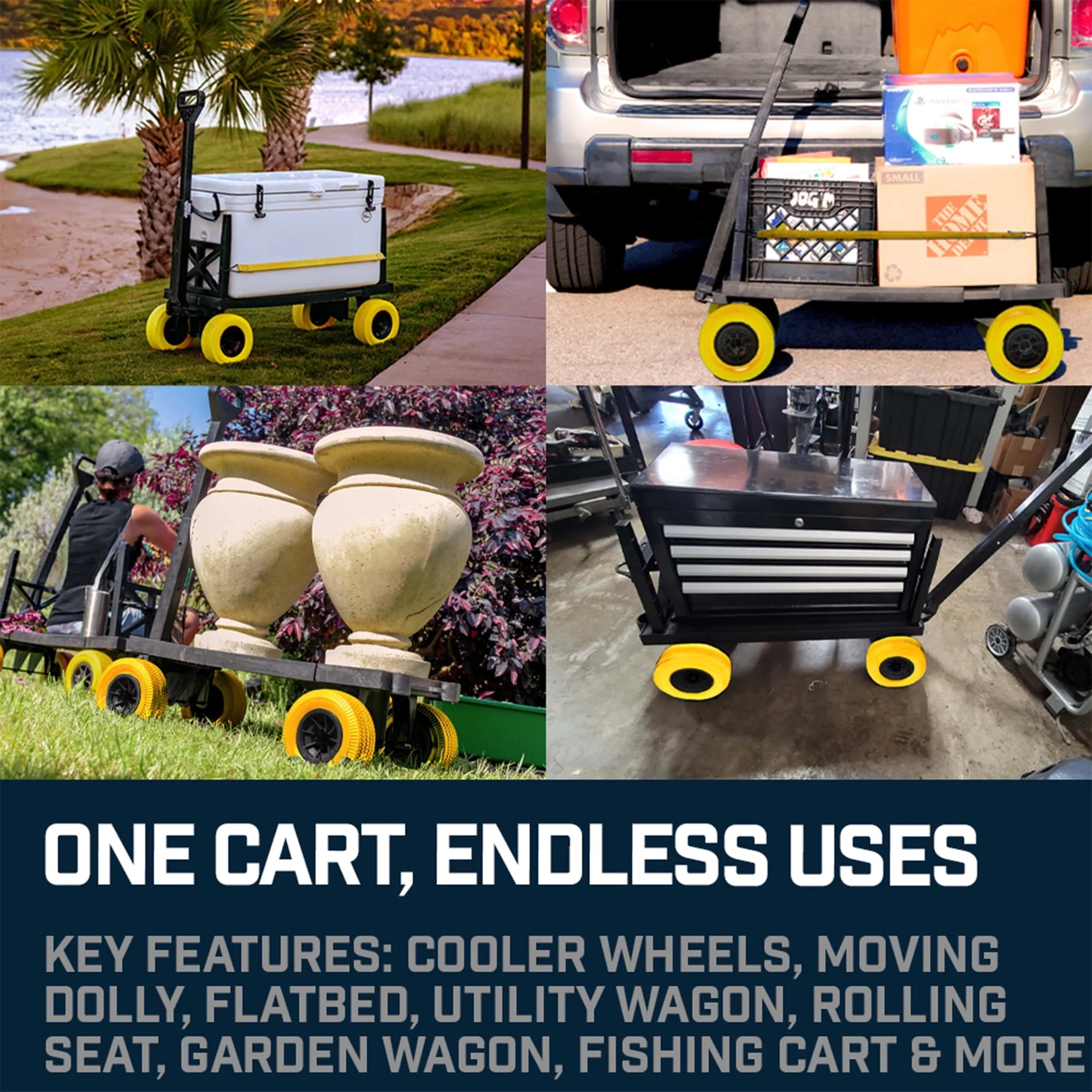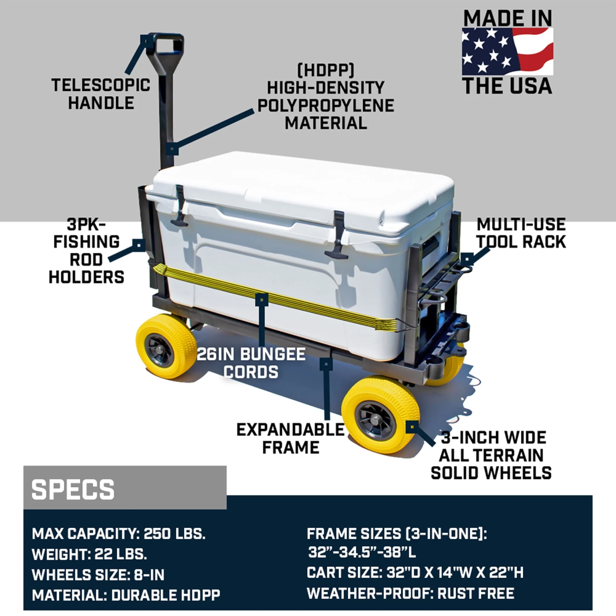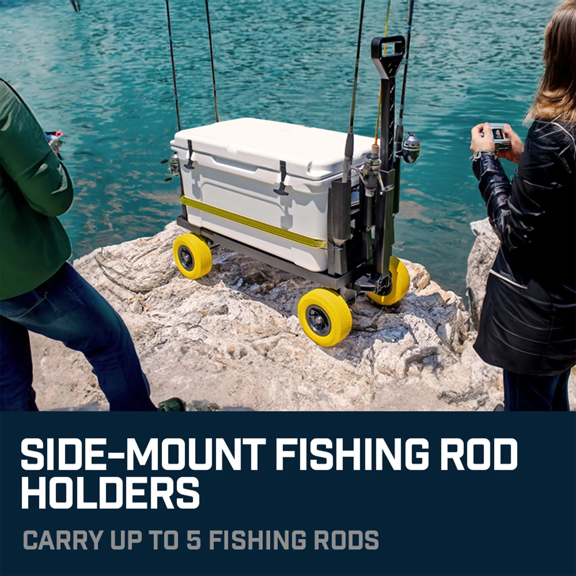 The Mighty Max Cart is the ultimate outdoor companion for any adventure. Whether you're pier and surf fishing, hauling sports equipment, or camping, this versatile cart has got you covered. Its all-terrain, never-flat wheels and 100% weatherproof and salt-resistant design make it perfect for any adventure, no matter the conditions. And when you're ready to hit the water, the Fishing Rod Holders and Tool Rack Attachment allow you to bring up to 5 fishing rods with you.