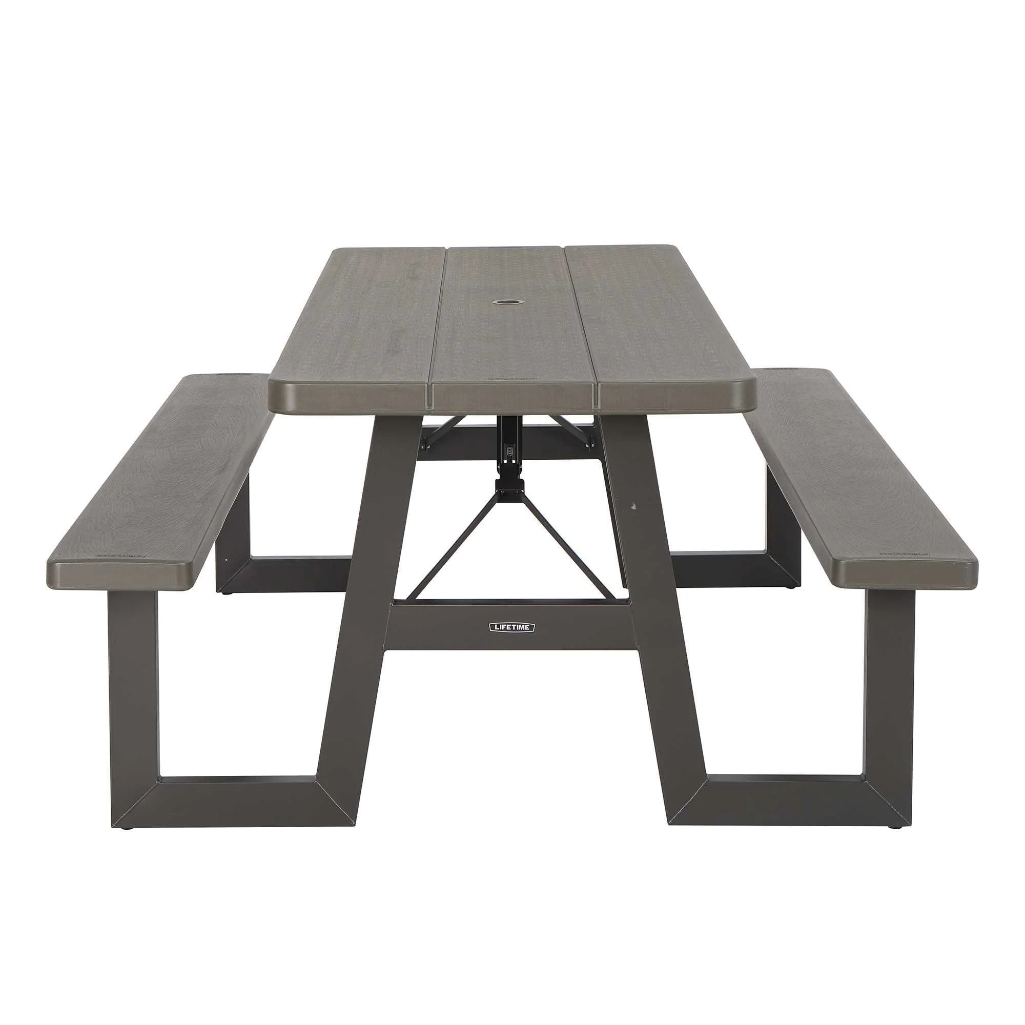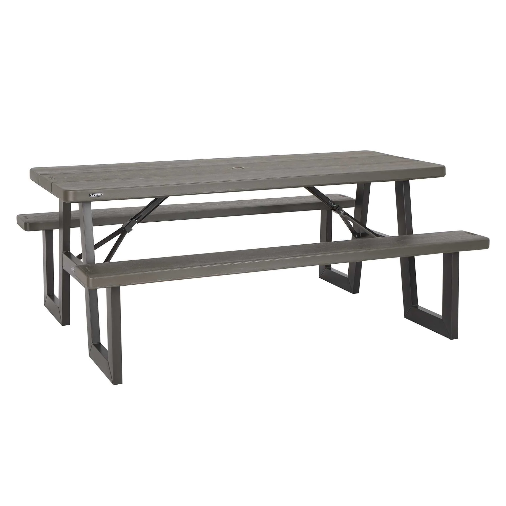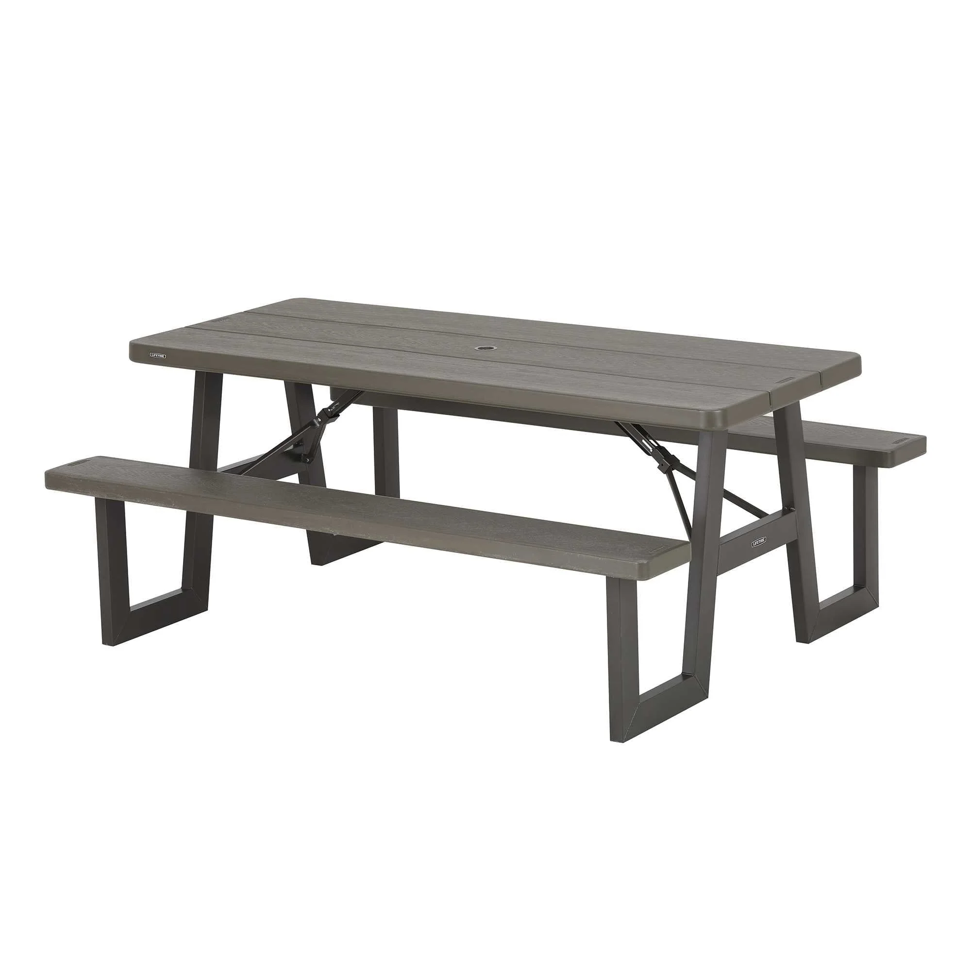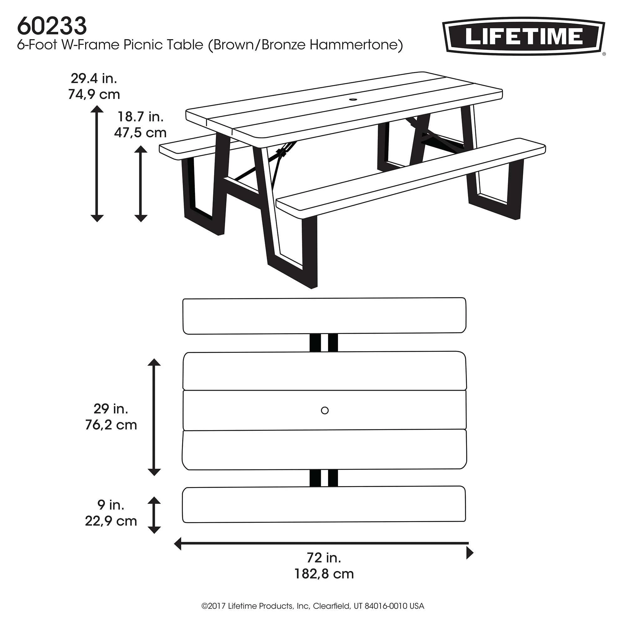 Lifetime 6-Foot Picnic Table - Built with the traditional W-frame design, the 72 in. x 30 in. high-density polyethylene wood-grain design tabletop is stain resistant, easy to clean, and folds flat for storage. This model comes in brown with a bronze folding frame and includes an umbrella hole and cap. 2-year limited warranty.