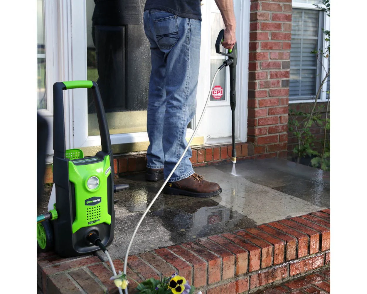 The Greenworks 1600-PSI 1.2-GPM Corded Electric Pressure Washer is powerful and compact, making it perfect to use around the home. This Pressure Washer Manufacturers’ Association certified corded electric Pressure Washer features a powerful 13 Amp High Efficiency Brushless Electric Induction Motor and Pressure Technology. With 1600-PSI of force, it is great for cars, patio furniture or siding. Includes 2 pro-style tips with quick connect, including a 40° and Turbo nozzle, make it easy to switch tips. Onboard storage allows you to keep pressure wand and spray tips in the same place. Lightweight, compact design with 5-in wheels provides easy portability. Item assembled weight - 19.07 lbs. Backed by 3-uear warranty.