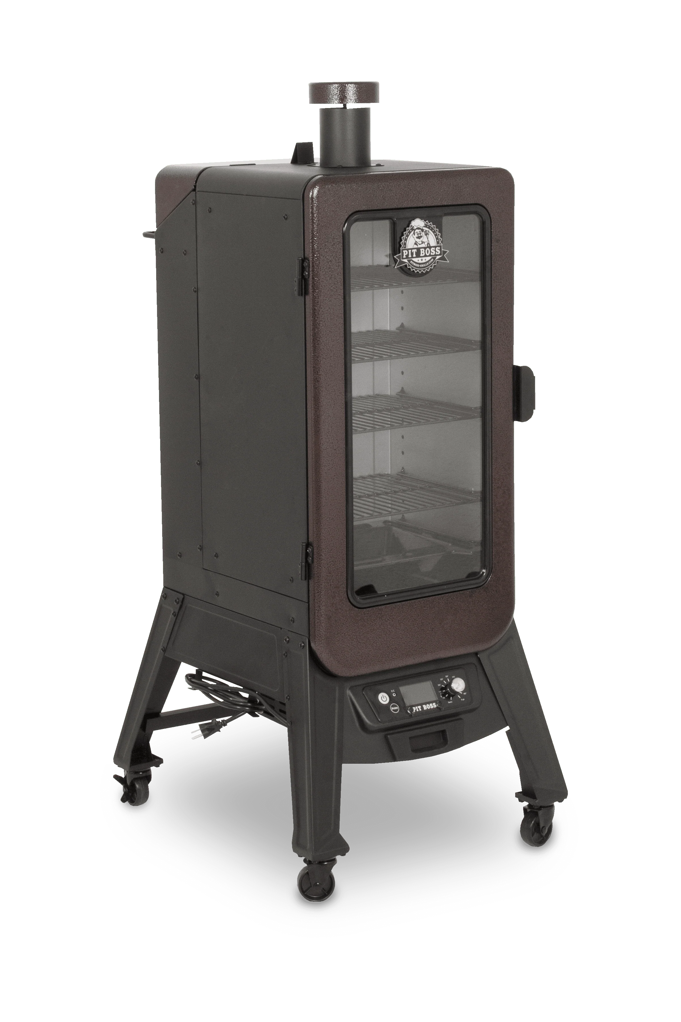 Innovation meets the outdoors with Pit Boss’ all new 3-Series Vertical Pellet Smoker. Never before has smoking been this versatile. The large front window eliminates the need for peek-a-boo cooking and its elevated frame makes transferring your meal from the smoker to the table a breeze. With the PB 3 Series Pellet Smoker there is no need to fret about cooking lengths. Its sleek design is not only unique, it is also functional. The Pit Boss 3 Series Pellet Smoker features 4 locking caster wheels, an easy to read digital controller and a stunning hammer tone copper finish. The multiple position racking system ensures you’ll have enough room to smoke anything your heart (or stomach) desires. Experience how Pit Boss is redefining the smoker industry in your own backyard today!