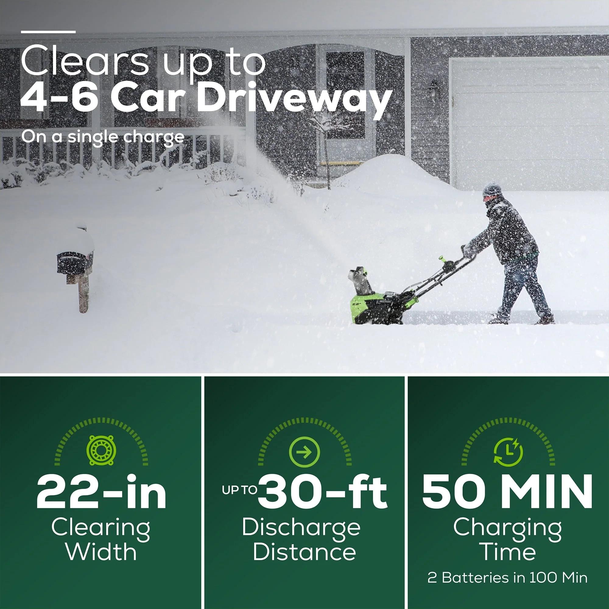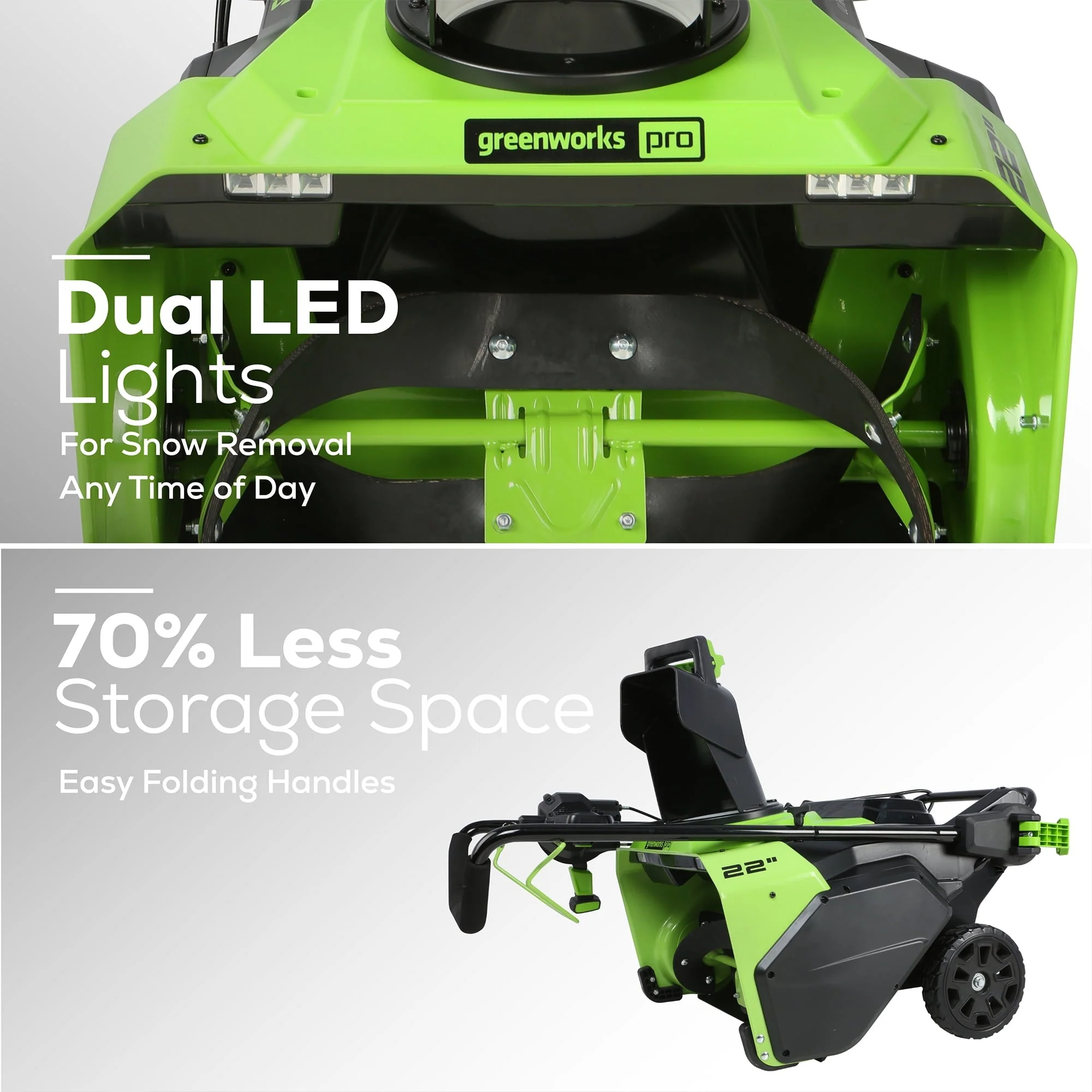 Built with a high-efficiency brushless motor, a 22" wide intake, and 13" clearing depth, the Greenworks 60V Cordless Battery Snow Blower clears up to a 4-6 car driveway on a single charge and easily adjust the auger to control how far the snow is thrown for maximum control up to 30-ft. A robust handle-mounted chute-adjustment lever puts the user in control when re-directing the snow up to 180-degrees from side to side and equipped with a 45-degree deflector. Bright LED headlights make it convenient for use early in the morning or at night and robust steel chassis is built for aggressive use in demanding conditions. Convenient, easy folding handles for vertical storage with 70% less storage space.