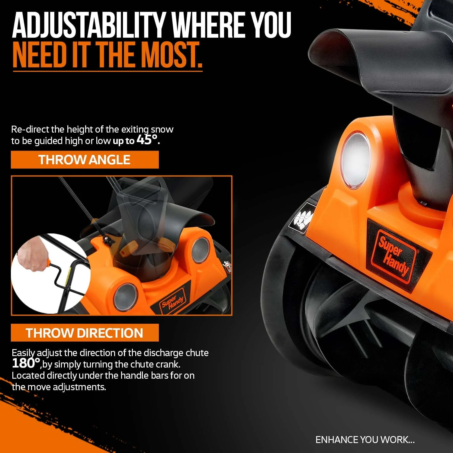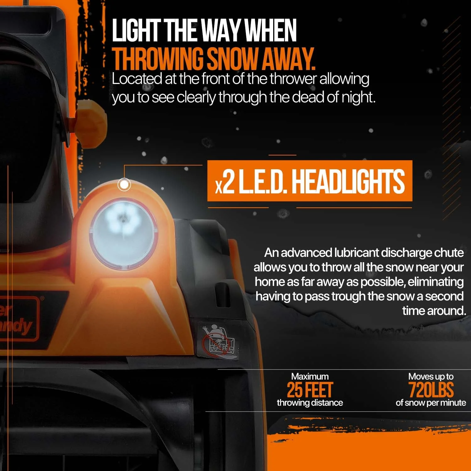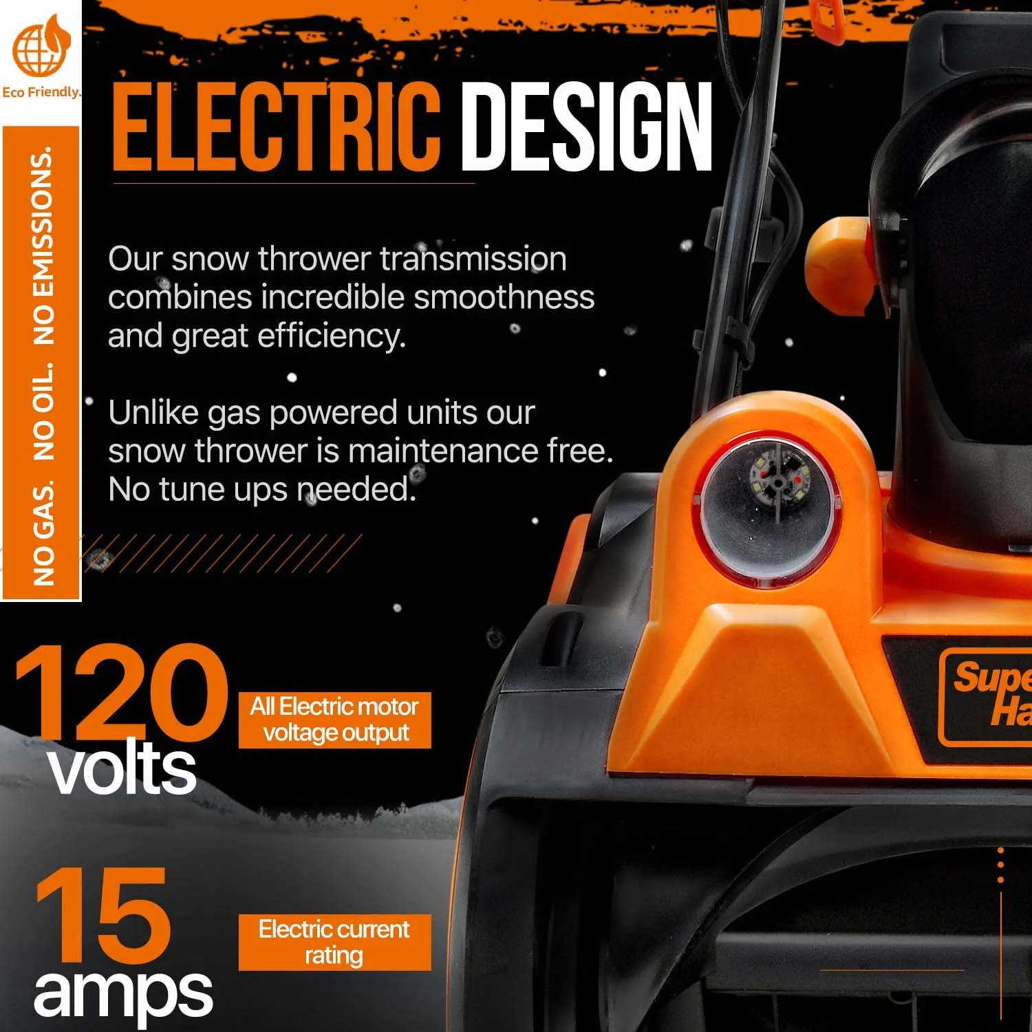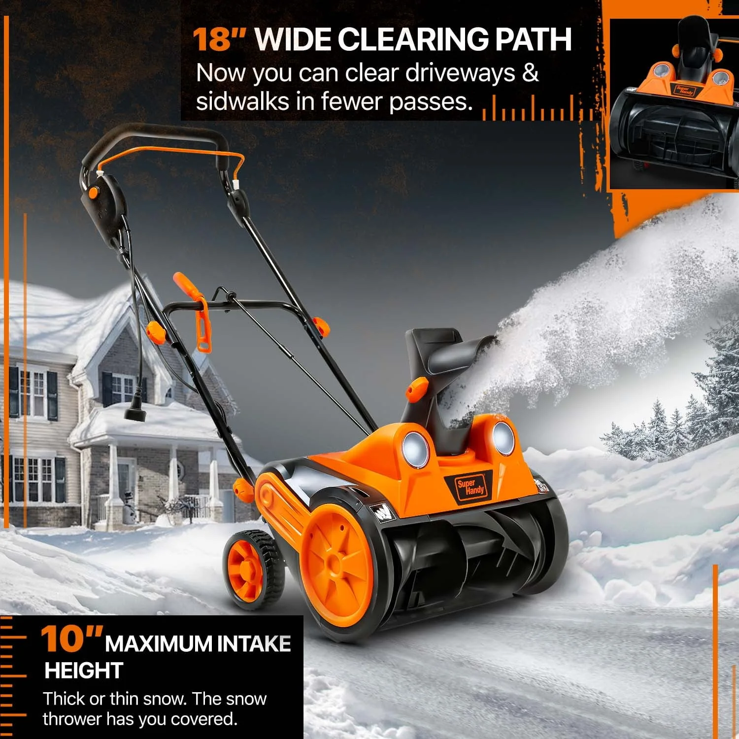 This Electric Snow Thrower, ideal for both Residential and Commercial applications, is your dependable choice for quick and efficient snow clearing. Powered by a robust 120VAC 15Amp brushless motor, it swiftly clears an 18-inch wide by 10-inch deep path, moving up to 720lbs of snow per minute and throwing it as far as 25 feet. Unlike its gasoline counterparts, this eco-friendly blower is quieter and free from smog emissions. No need for gas, oil, or tune-ups – just an effortless start and easy maintenance. It boasts an adjustable 180-degree rotating discharge chute and cold-resistant polypropylene auger blades for optimal snow removal. The ergonomic handle ensures user comfort, while dual LED headlights make nighttime clearing a breeze. Ideal for patios, sidewalks, driveways, and more, always ensure to wear the appropriate protective gear when using. Remember not to immerse the snow thrower in water and enjoy a snow-free environment around your home or property.