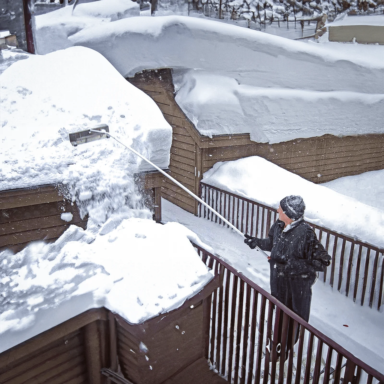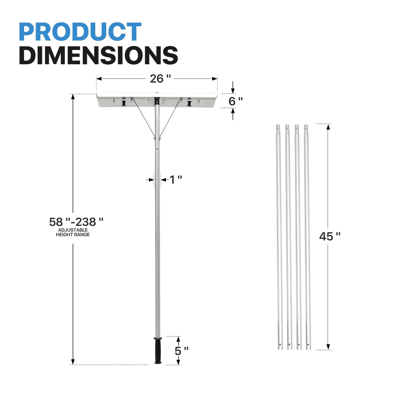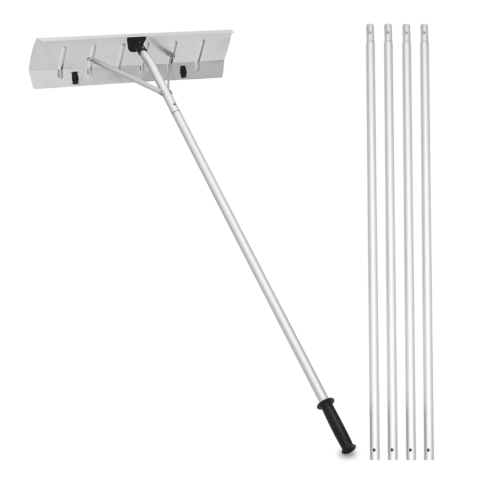 Experience efficient snow clearing with our versatile snow roof rake. Featuring a 26" x 6" L-shaped blade, it swiftly removes snow even in tight spaces. Crafted from premium aluminum, it's both durable and lightweight, making maneuverability a breeze. Assembly is hassle-free, and its compact design ensures easy storage. With an extendable handle reaching up to 20 feet, it offers customizable reach for roof maintenance. Not just for winter, this rake is a year-round helper, tackling snow, dirt, leaves, and branches.