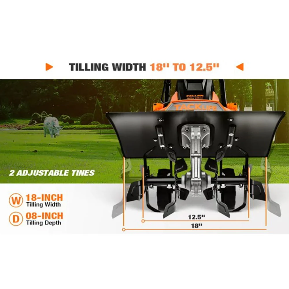 We has been dedicated to provide each customer with trustworthy and great value items.This Tiller can adjust tillIng width - Electric tiller can be quickly switched from 6 tInes to 4 tInes without tools, workIng width from 18 Inches to 12.5 Inches, which can meet your different work needs. Attention : When usIng the tiller, it should be dragged backwards, which can reduce the bouncIng of the machIne and ensure safe. Electric tiller can be quickly switched from 6 tines to 4 tines without tools, working width from 18 Inches to 12.5 Inches, which can meet your different work needs. Attention: When using the tiller, it should be dragged backward, which can reduce the bouncing of the machine and ensure safety. Powerful 13.5 Amp copper motor generates speed up to 380 Rpm. The working depth reaches up to 8'', ideal for soil loosening and bed preparation In the garden, yard, and vegetable plot.