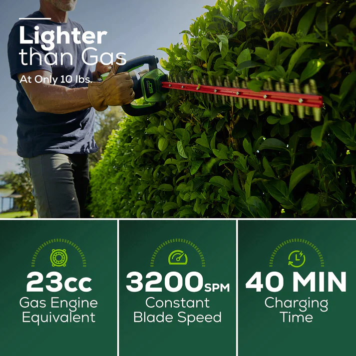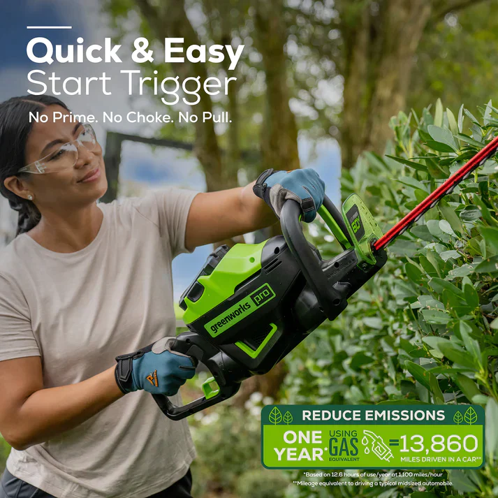 Powered by a Greenworks 60V UltraPower lithium-ion battery, this Greenworks cordless hedge trimmer is the ideal choice for homeowners who want the convenience and benefits of going cordless for everyday yard work but also the confidence to take on occasionally challenging projects, without the noise, fumes, or harmful emissions. The powerful Greenworks 60V UltraPower cordless battery platform gives you all the power you need to tackle all your lawn care projects. Kick gas to the curb this spring and go green with no fumes, no mixing, no maintenance, and no pull cords. Let Greenworks help you take the work out of yard work.