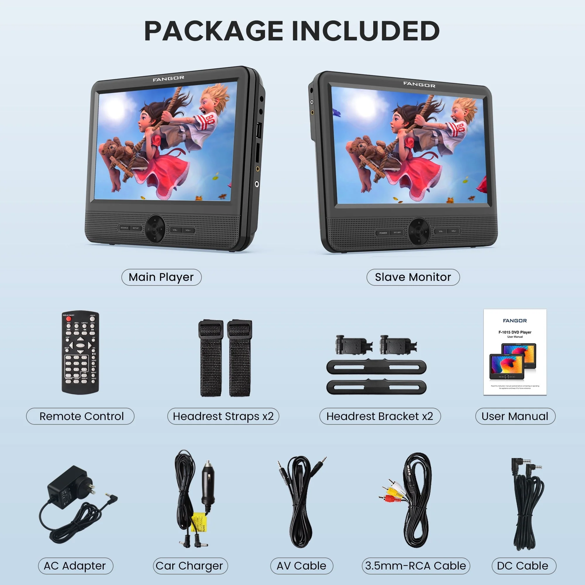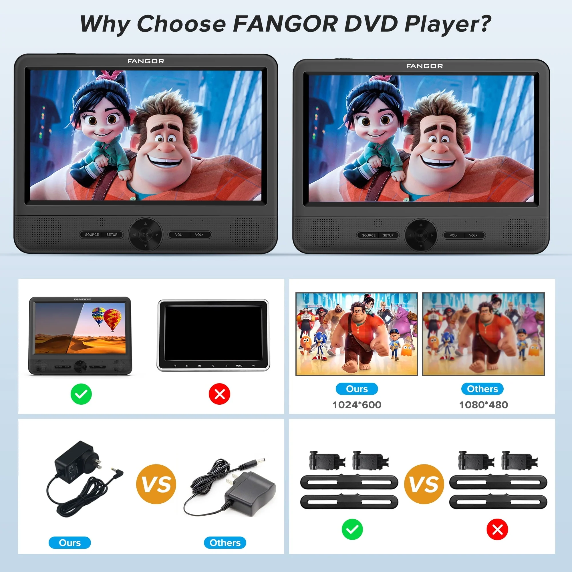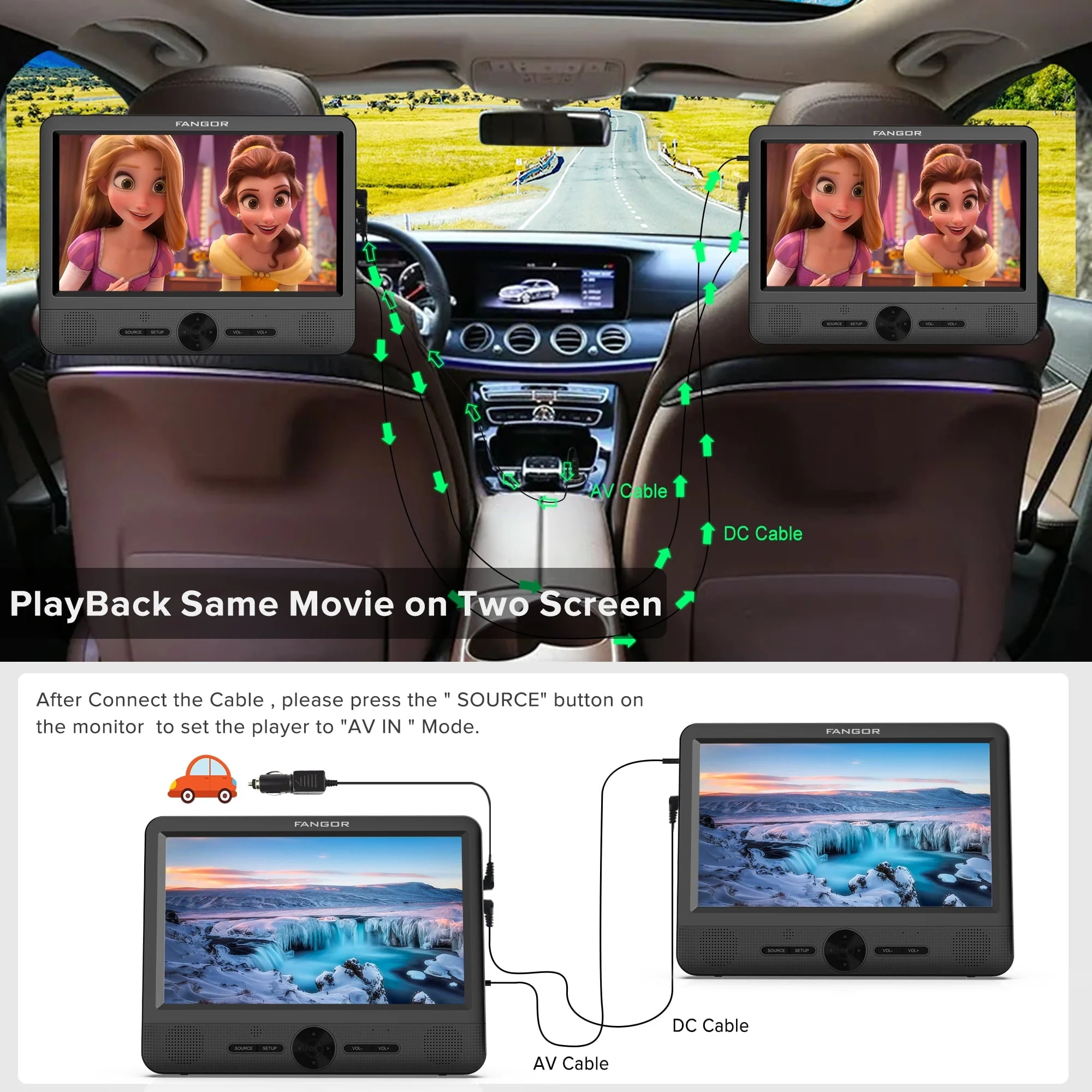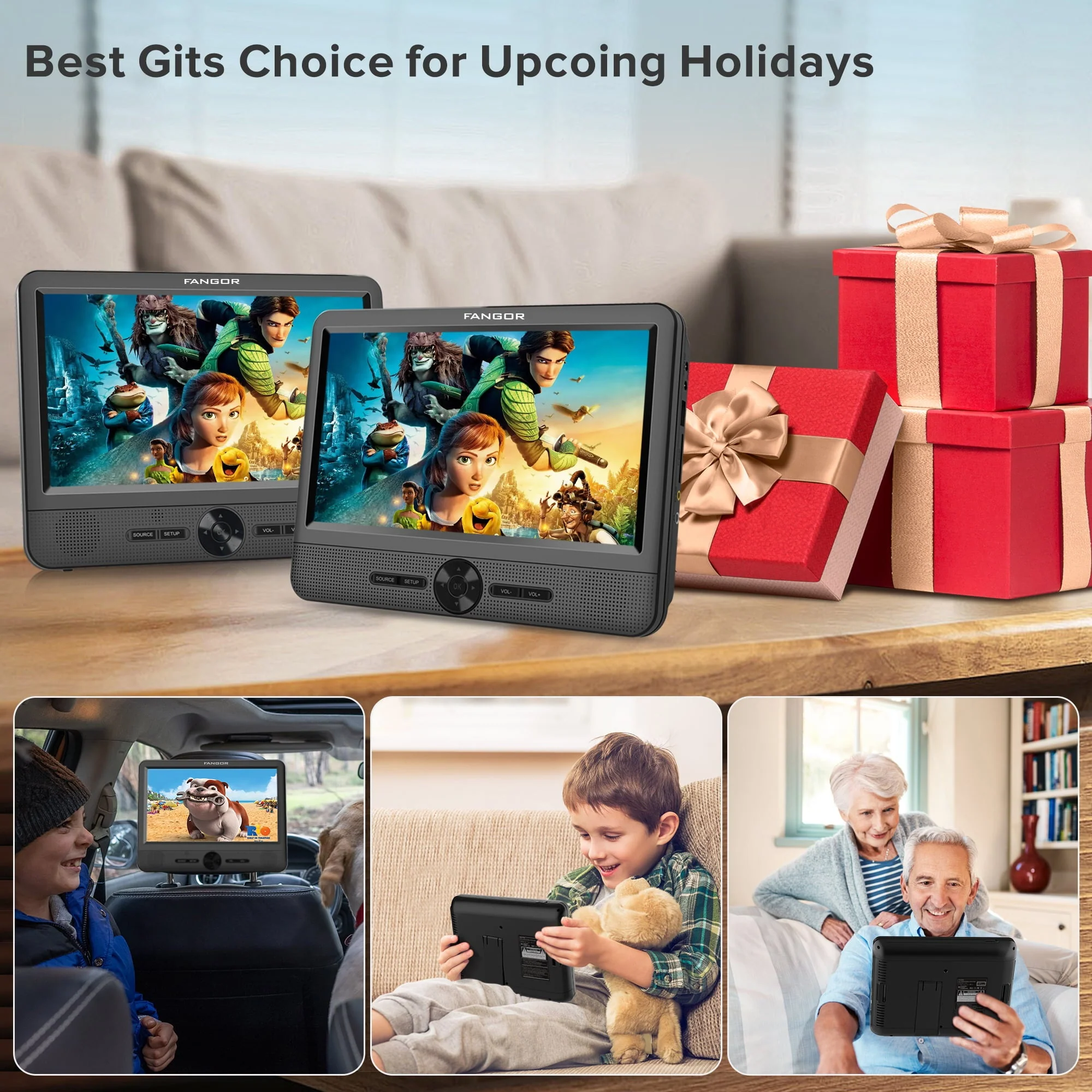 Fangor 10" Dual Screen Portable DVD for Car, Headrest DVD Player with Remote Control and 2 Headrest Bracket, Supports HDMI, USB Port, SD Card Slot, AV in /Out, Last Memory, Ideal Gift for Kids