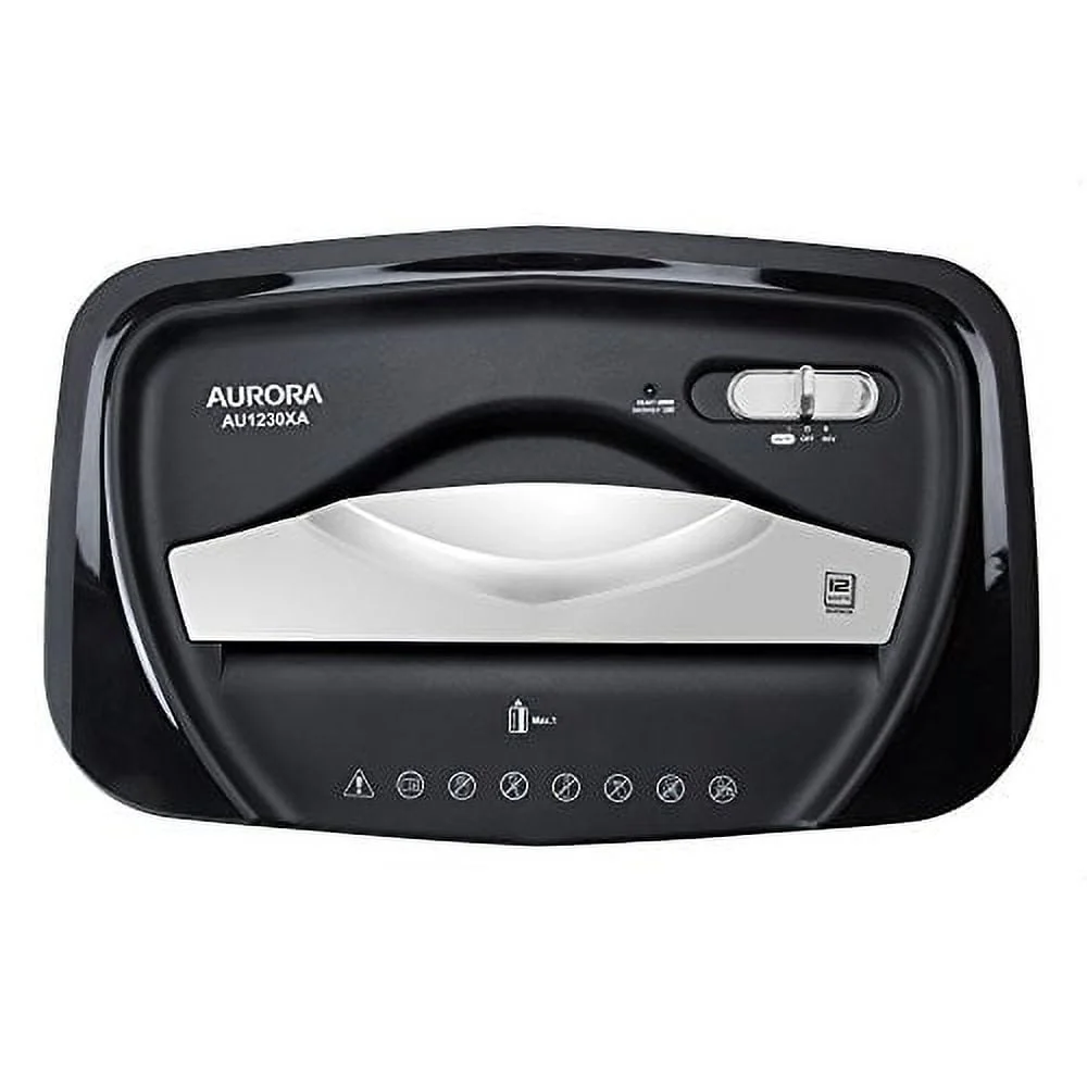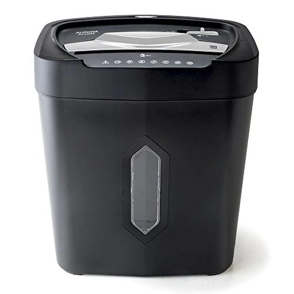 Aurora Anti-Jam 12-Sheet Crosscut Paper and Credit Card Shredder with 5.2-gallon WastebasketCrosscut with 12 sheet capacities; destroys credit cards and small paper clipsShreds paper, credit cards into small pieces (3/16 by 1-9/16 inches), security level P-3Nonstop stop 5-minute continuous run time; anti-jam auto-reverse to clear paper jamsOverload and thermal protection, 4-mode power switch (auto-off-reverse-forward)5.2-gallon wastebasket with LED indicator lights Standby/ Overheat