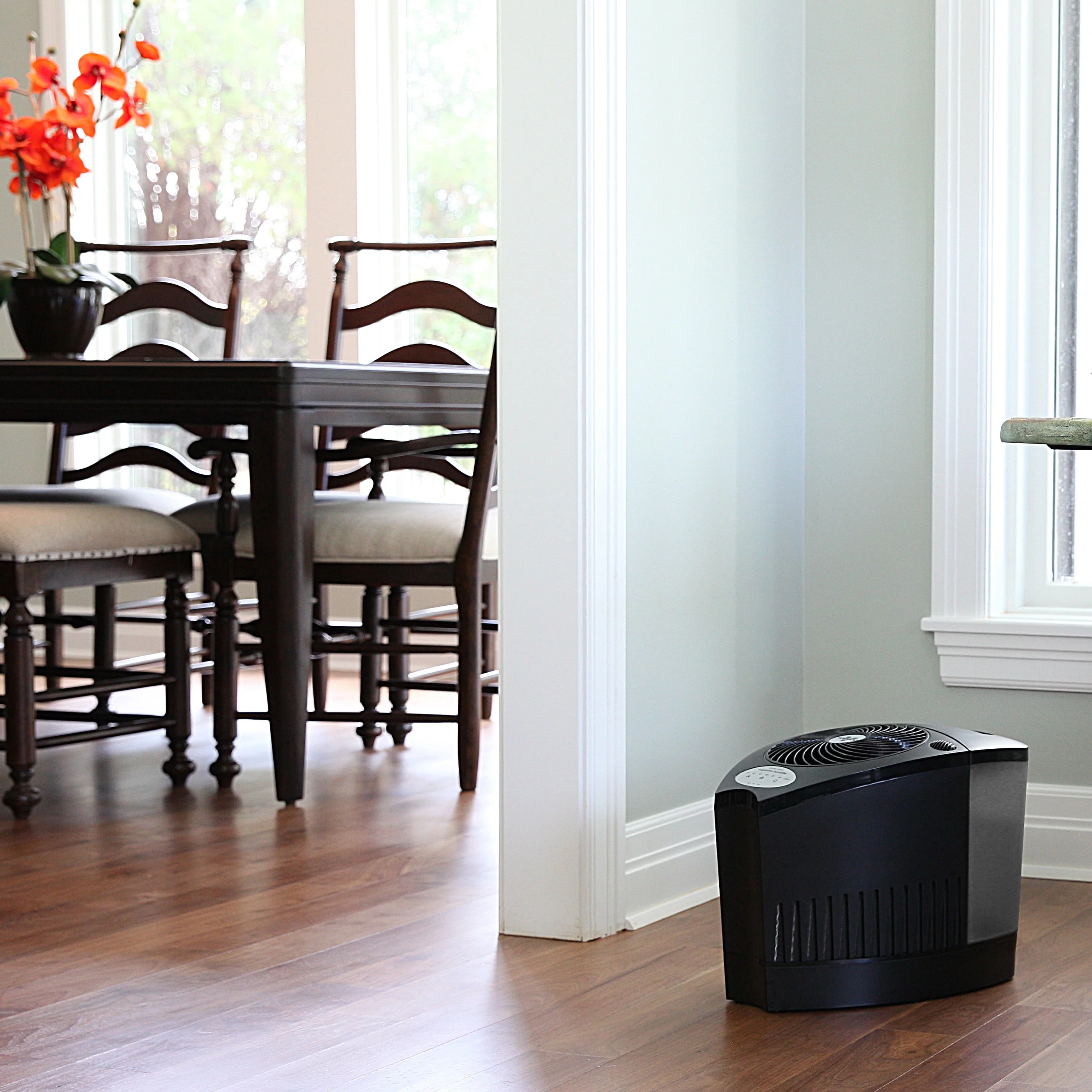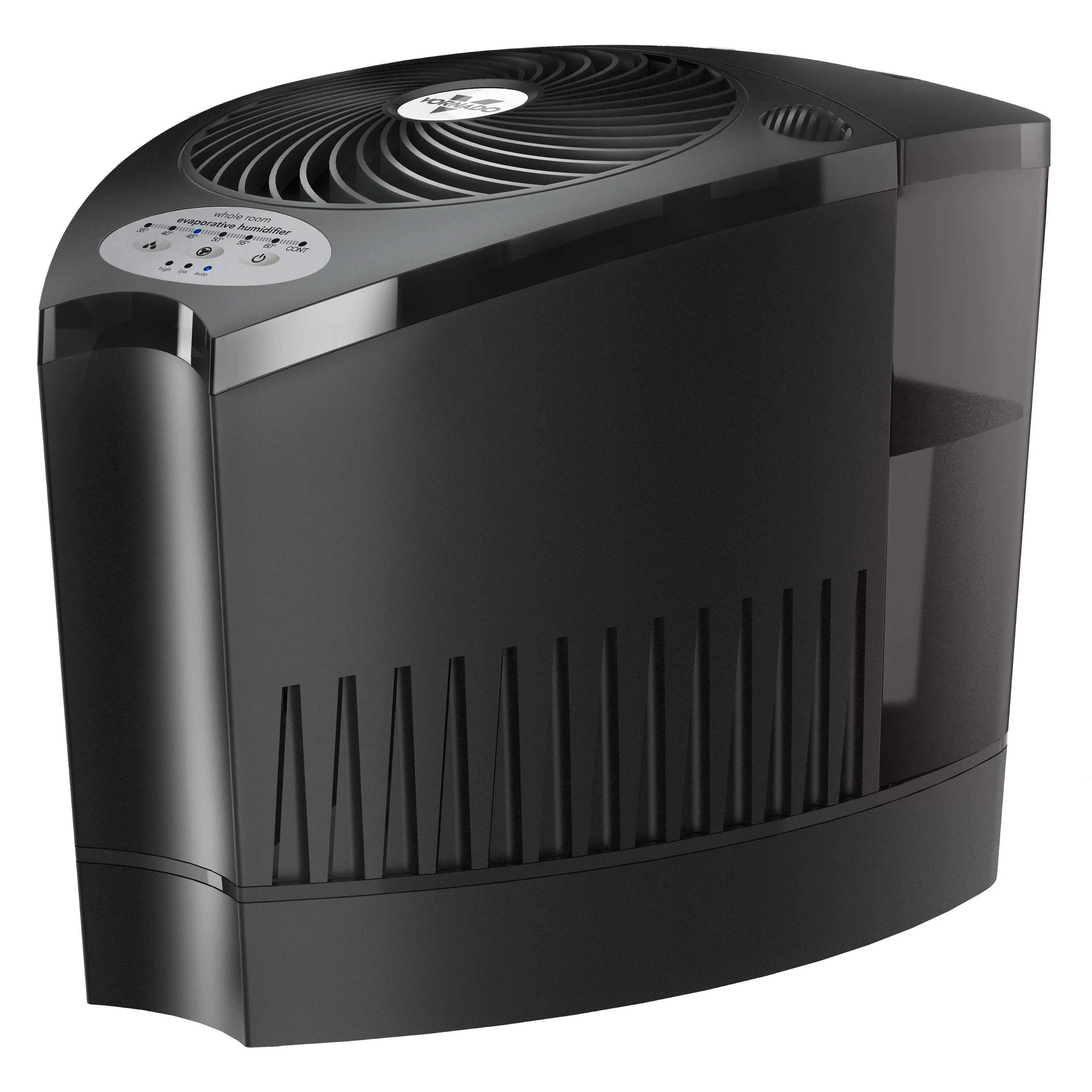 The Evap3 Evaporative Whole Room Humidifier creates a comfortable, perfectly humidified living space quickly and quietly. Vornado's deep pitch blades pull large volumes of harsh, dry air through two humidifying wicks, and then, using Vornado's signature Vortex Action, circulates the humidified air throughout the room, providing complete and uniform humidification in spaces up to 700 sq. ft. The easy-to-use push-button panel allows you to choose your desired humidity level and fan setting. A large 1.5-gallon capacity makes for fewer refills. 2.6-gallon output every 24 hours. A black and grey color scheme makes this model as sleek as it is effective.