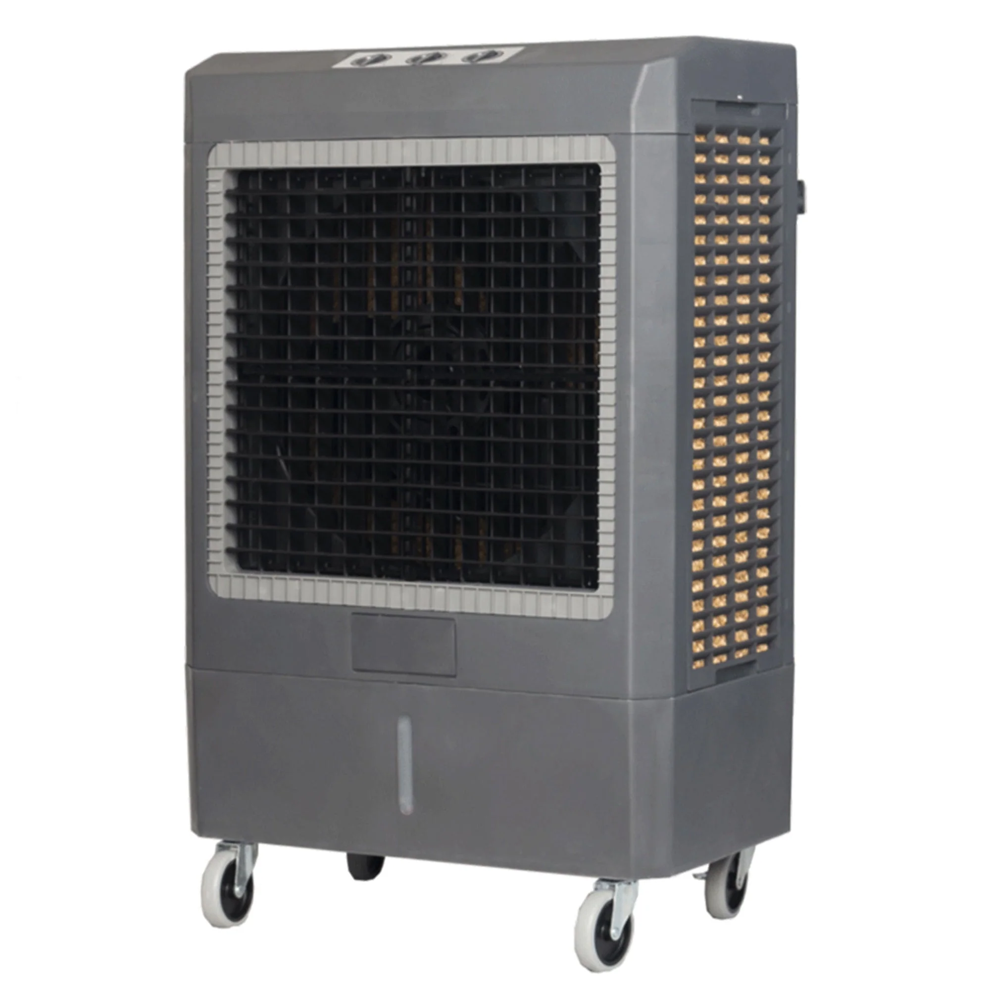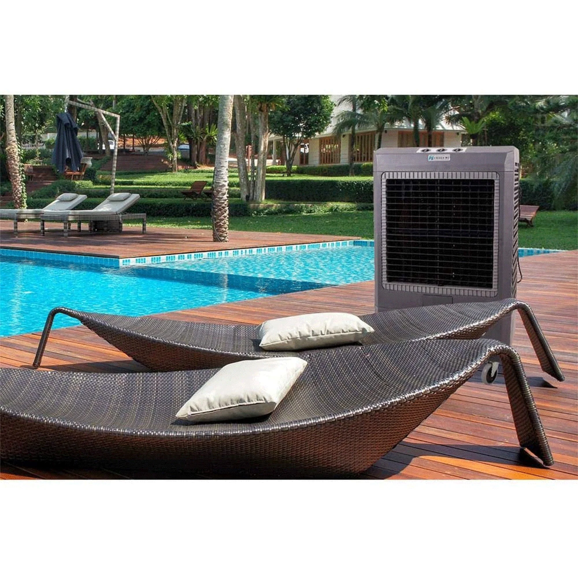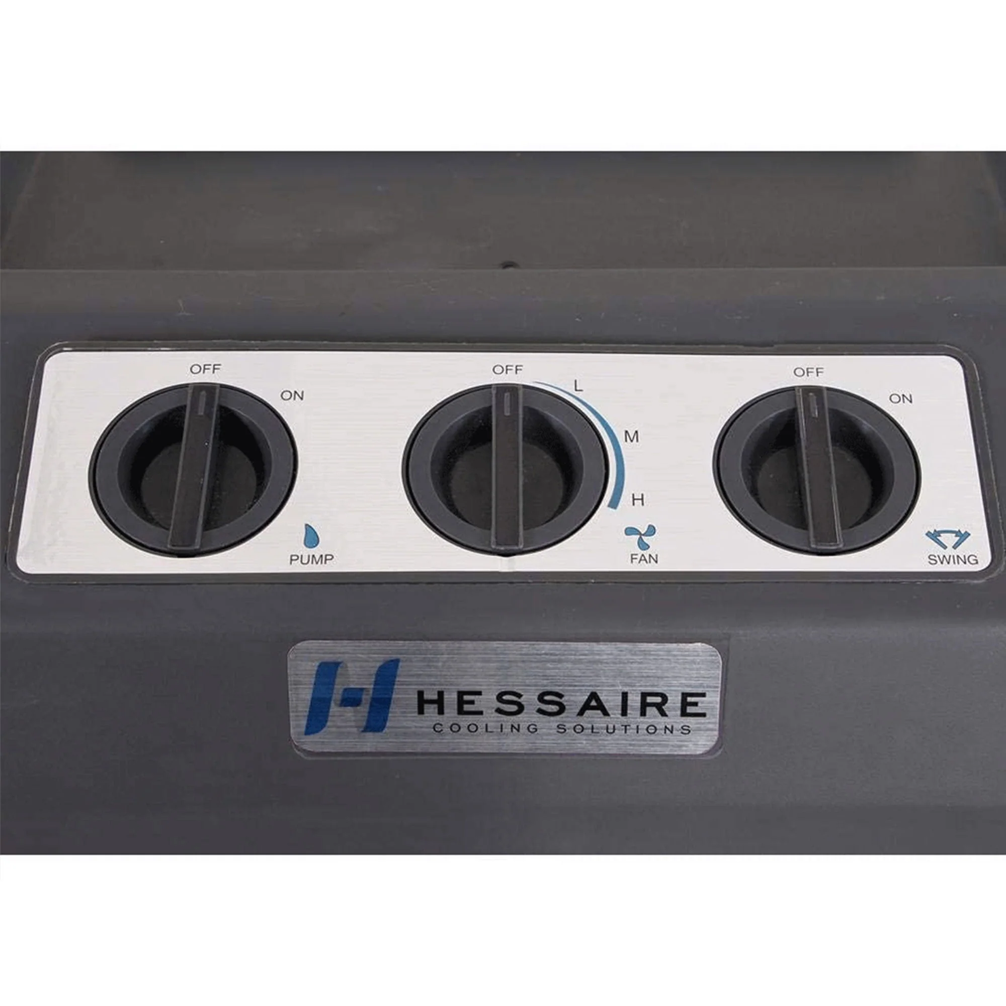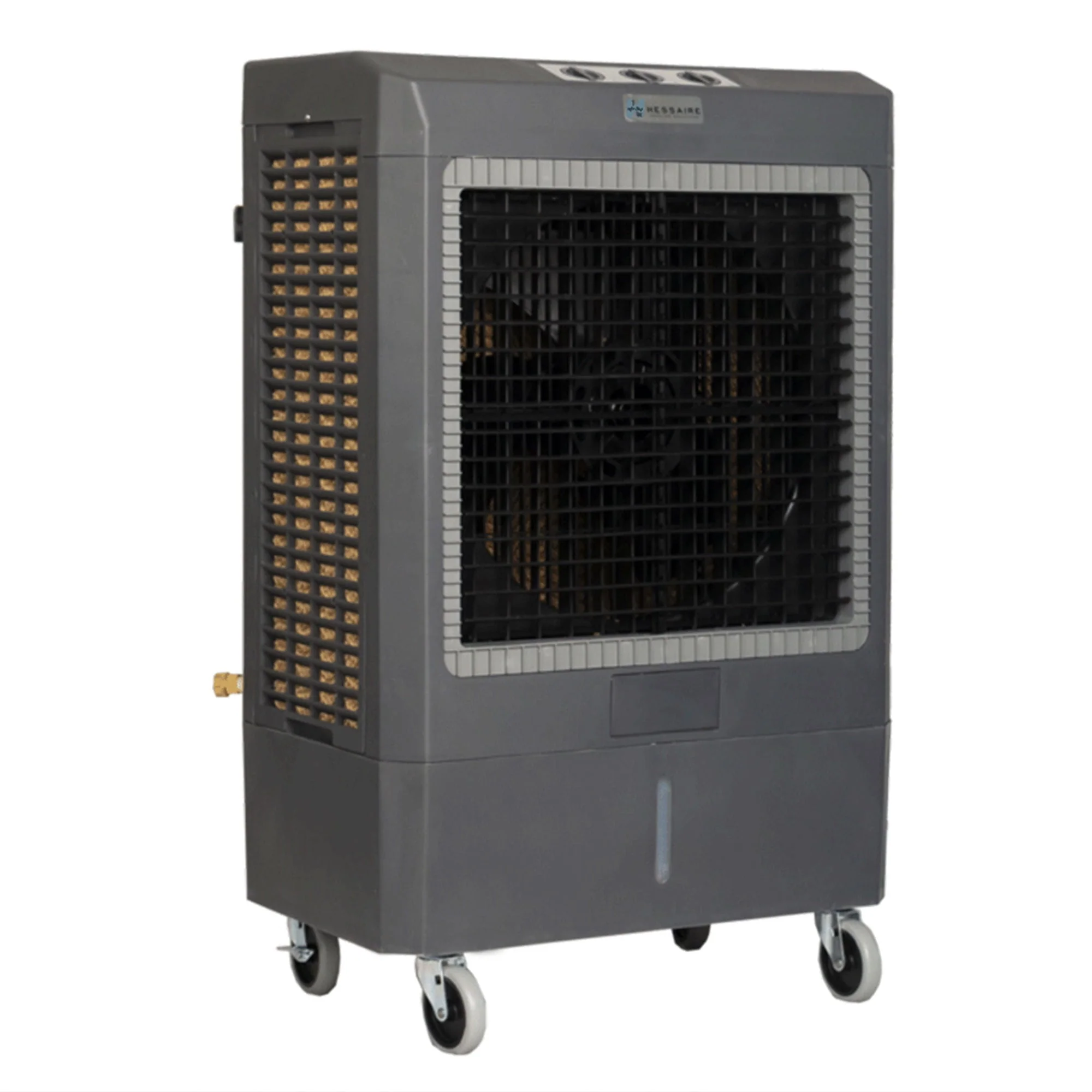 Keep the air around you cool inside and outside your home. With the Hessaire Portable Evaporative Air Cooler, you can stay out on your patio, or at your campsite. Just plug it in and you're ready to chill. This air cooling system cools warm, stale air with natural evaporation. As the water inside the swamp cooler evaporates into the air circulating through the cooling system, the air lowers in temperature. The MC61V air cooler can cool areas as large as 1,600 square feet. The fan draws air in and circulates it back out at a rate of 5,300 cubic square feet per minute. This portable swamp cooler has a 14.6-gallon water reservoir that you can fill through the cooler's manual water fill or through your garden hose connected to its water hose adapter. This evaporative wet air cooler is ideal for areas with low humidity since water must be able to evaporate easily. 3 simple rotary controls allow the fan, pump, and oscillation motor to be controlled independently. This Hessaire Outdoor Cooler Humidifier moves where you need it thanks to its lightweight design, heavy-duty wheels, and convenient handle.