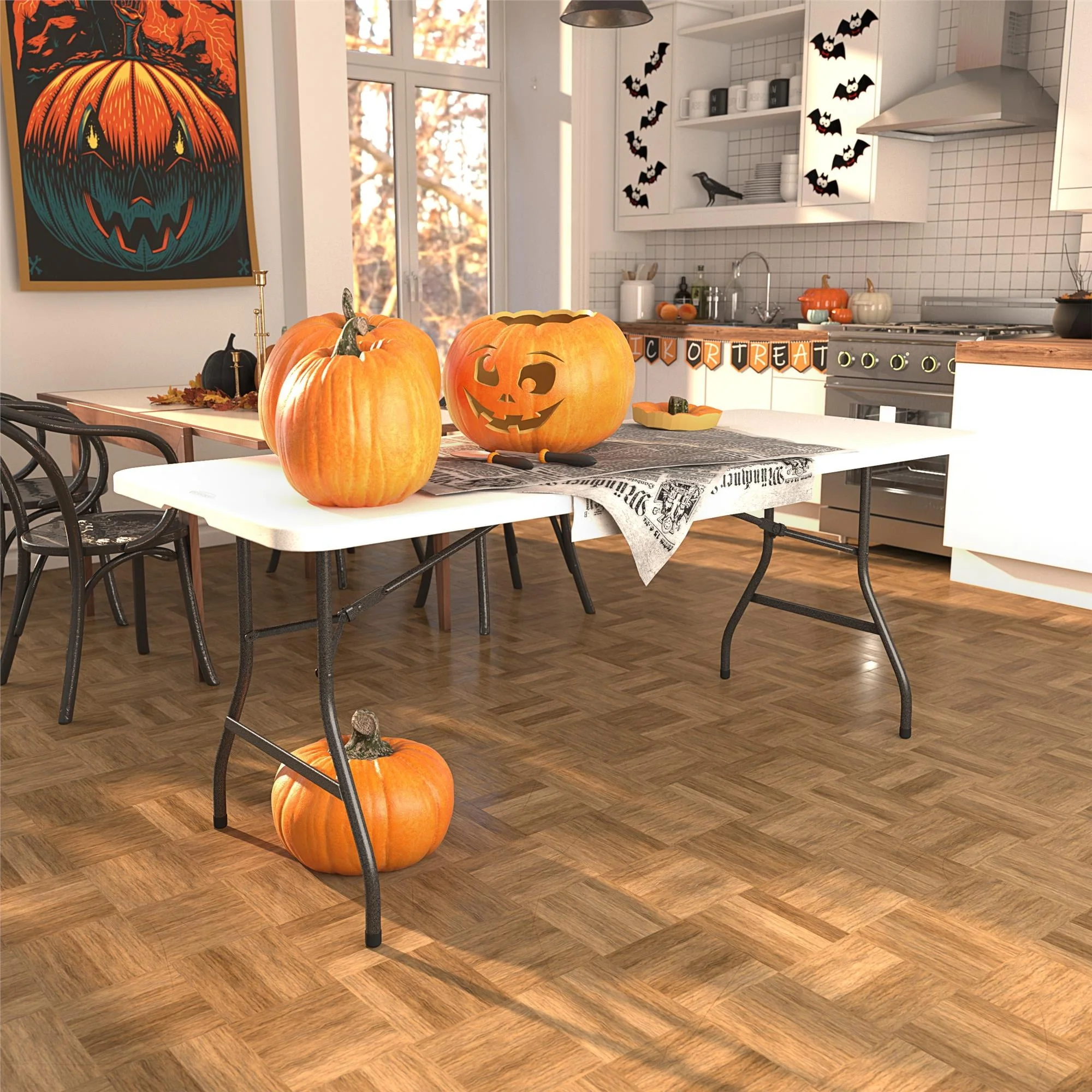 This Cosco 6' Centerfold Folding Table in white caters to any occasion. Dress it up for the holidays or take it outside for a barbecue. Set more than one side by side for large scale events and add runners and place settings to enhance the look. The blow molded Cosco 6 foot folding table features a waterproof top that resists spills and weather. This versatile piece saves space and time with legs that fold in and a center collapse feature that makes transport and storage virtually effortless. Its rectangular length provides additional seating at both ends of this heavy duty table. It has a strong steel frame and legs and a low maintenance, sturdy easy to clean top. 100 lb Weight Capacity.