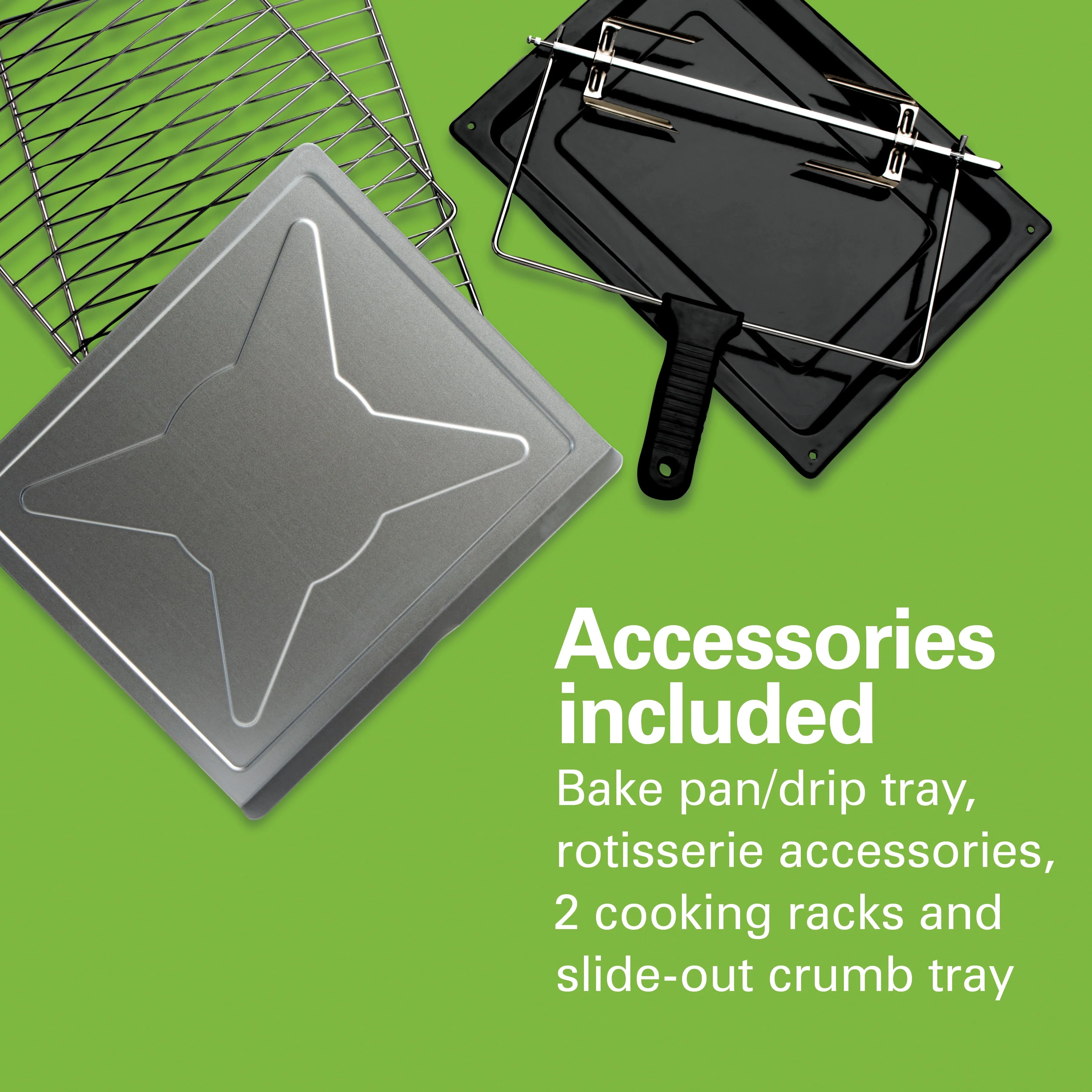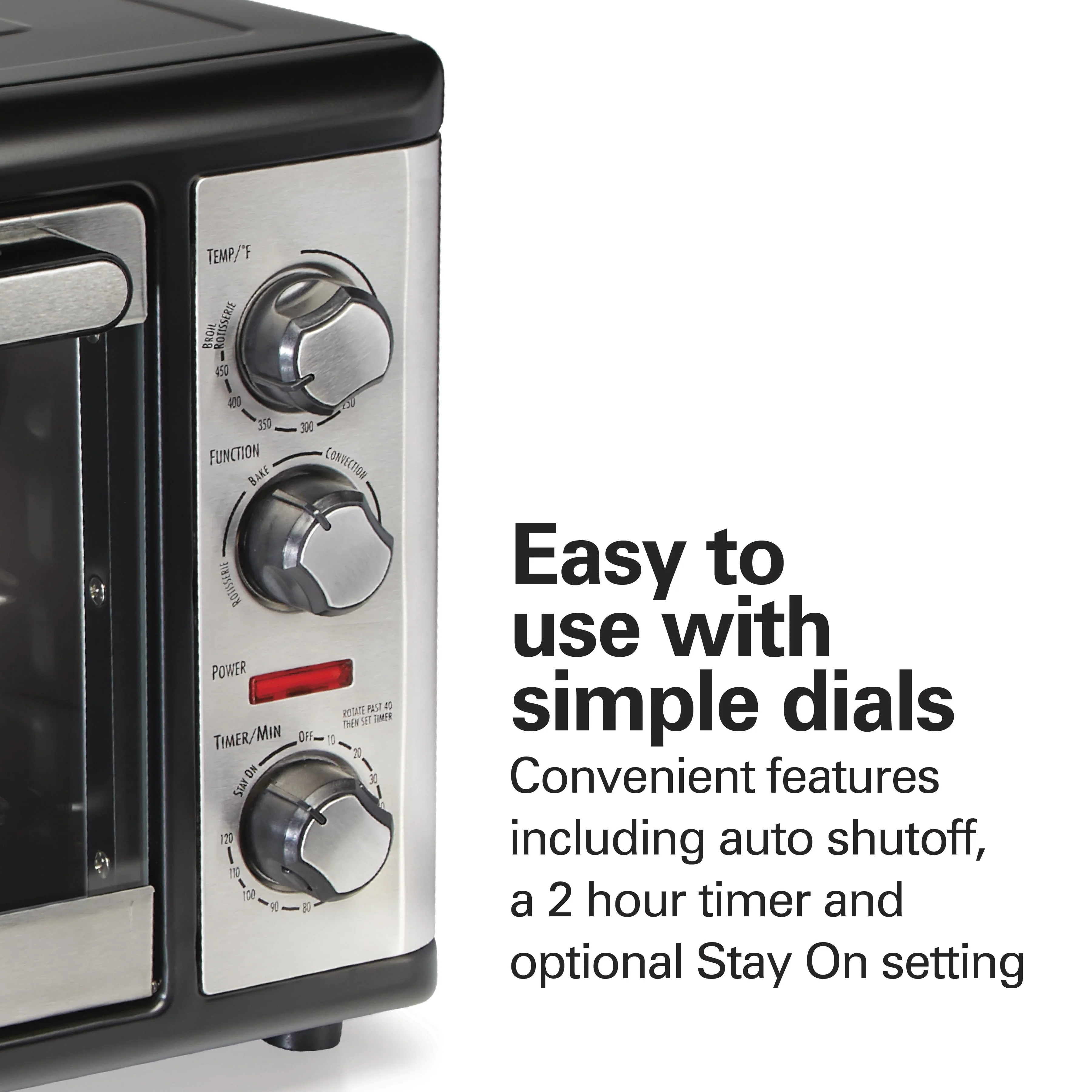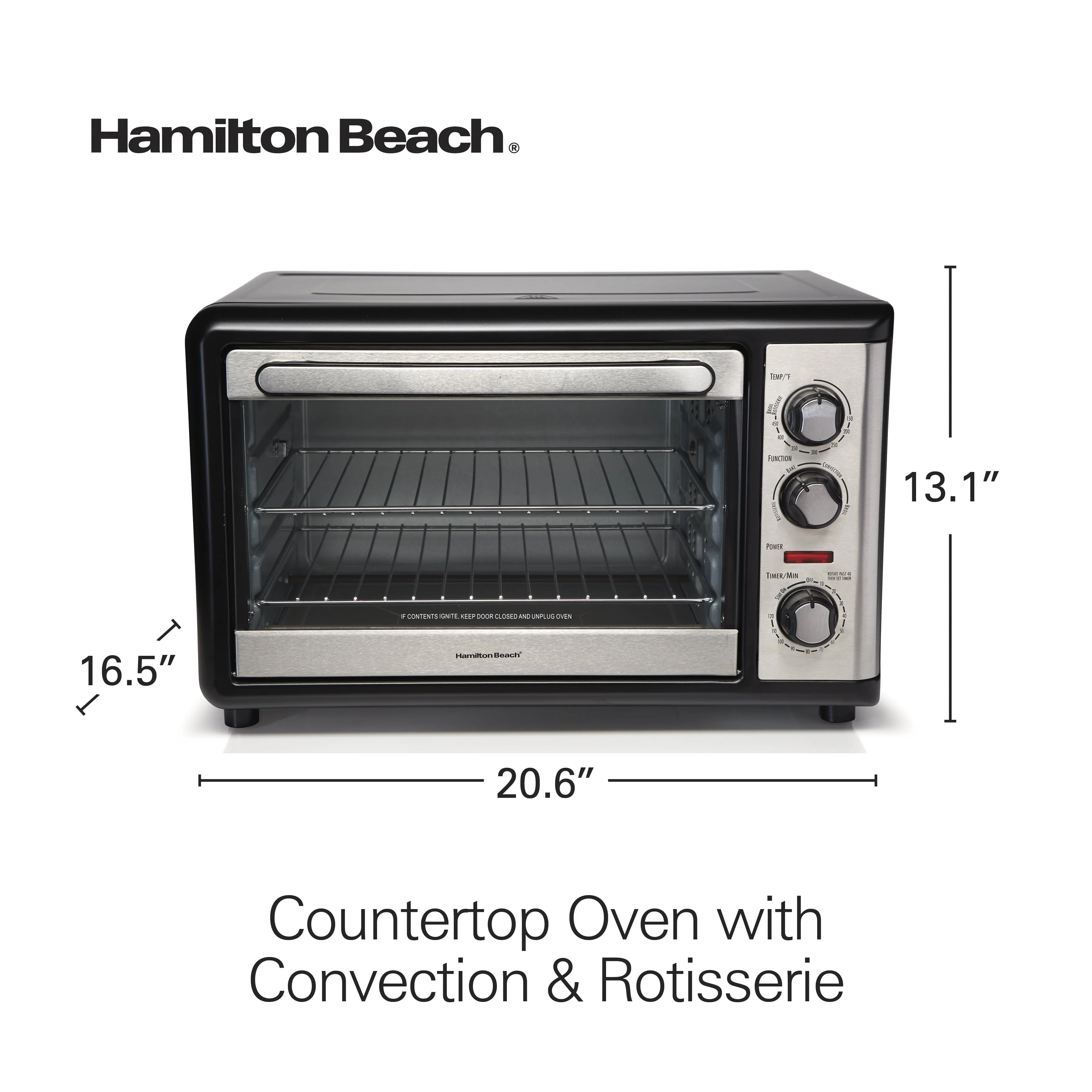 With 1500 watts of cooking power, the Hamilton Beach® Countertop Oven with Convection & Rotisserie does everything your full-size oven does, while taking minimal space on your countertop. Whether you’re baking cakes, broiling salmon or roasting an entire 5 lb. chicken, this oven has plenty of space — the ideal size for cooking family meals. The wide interior and two adjustable cooking racks provide double the space for cooking multiple foods at once, like two 12" pizzas. Cook a variety of foods to perfection. Bake, broil, roast on the rotisserie or use the convection setting to take your baking results to the next level. Convection bakes faster and more evenly than traditional ovens. The countertop oven is easy to use with simple dials to turn, yet it’s packed with convenient features. It has automatic shutoff, a 2 hour timer and a Stay On setting for foods that need extra cooking time. Easily create that store-bought rotisserie flavor at home. The revolving skewer revolves to lock in flavor and juices, while the outside of meat gets brown and crispy. The countertop oven includes: a bake pan/drip tray, rotisserie accessories, 2 cooking racks and a slide-out crumb tray for easy cleanup.