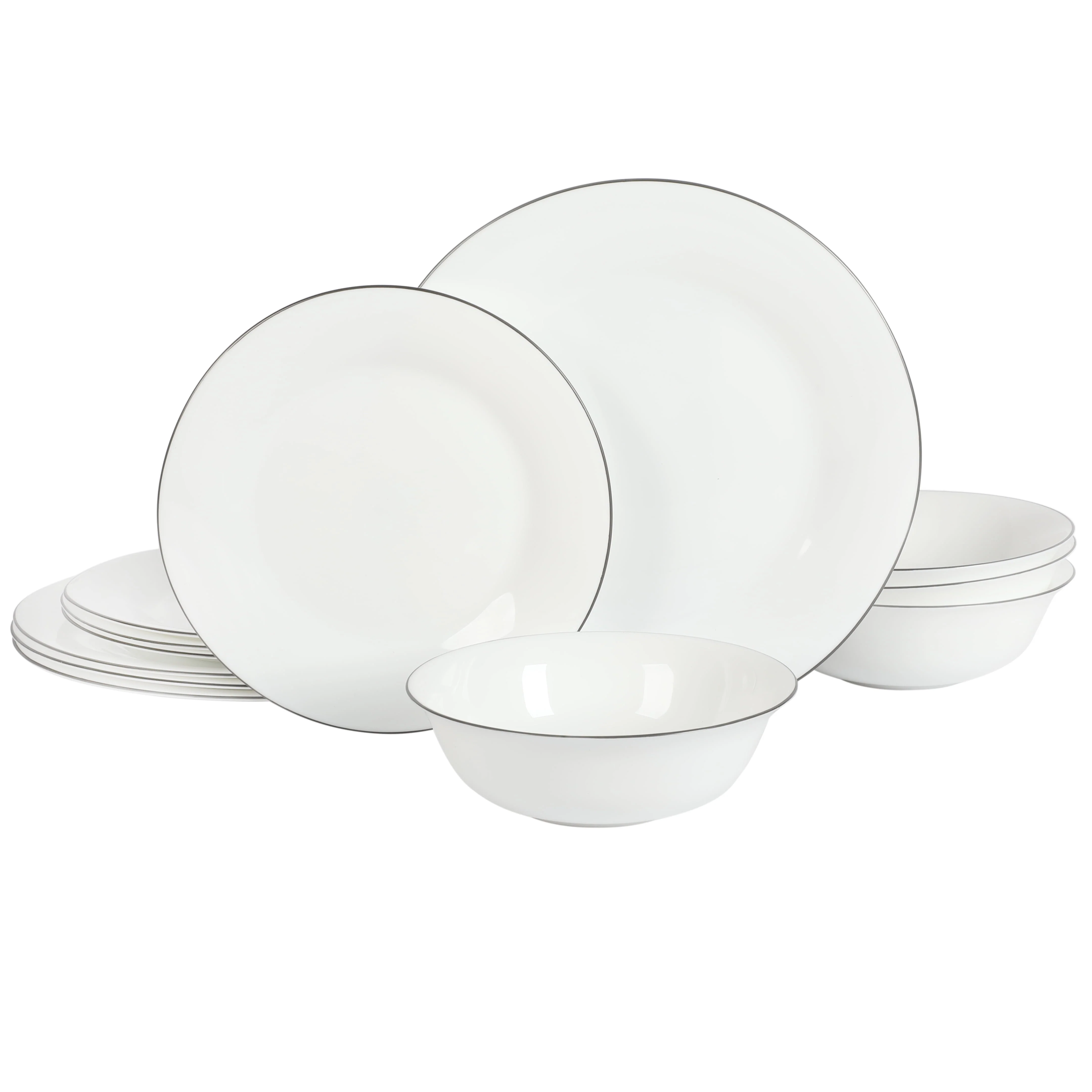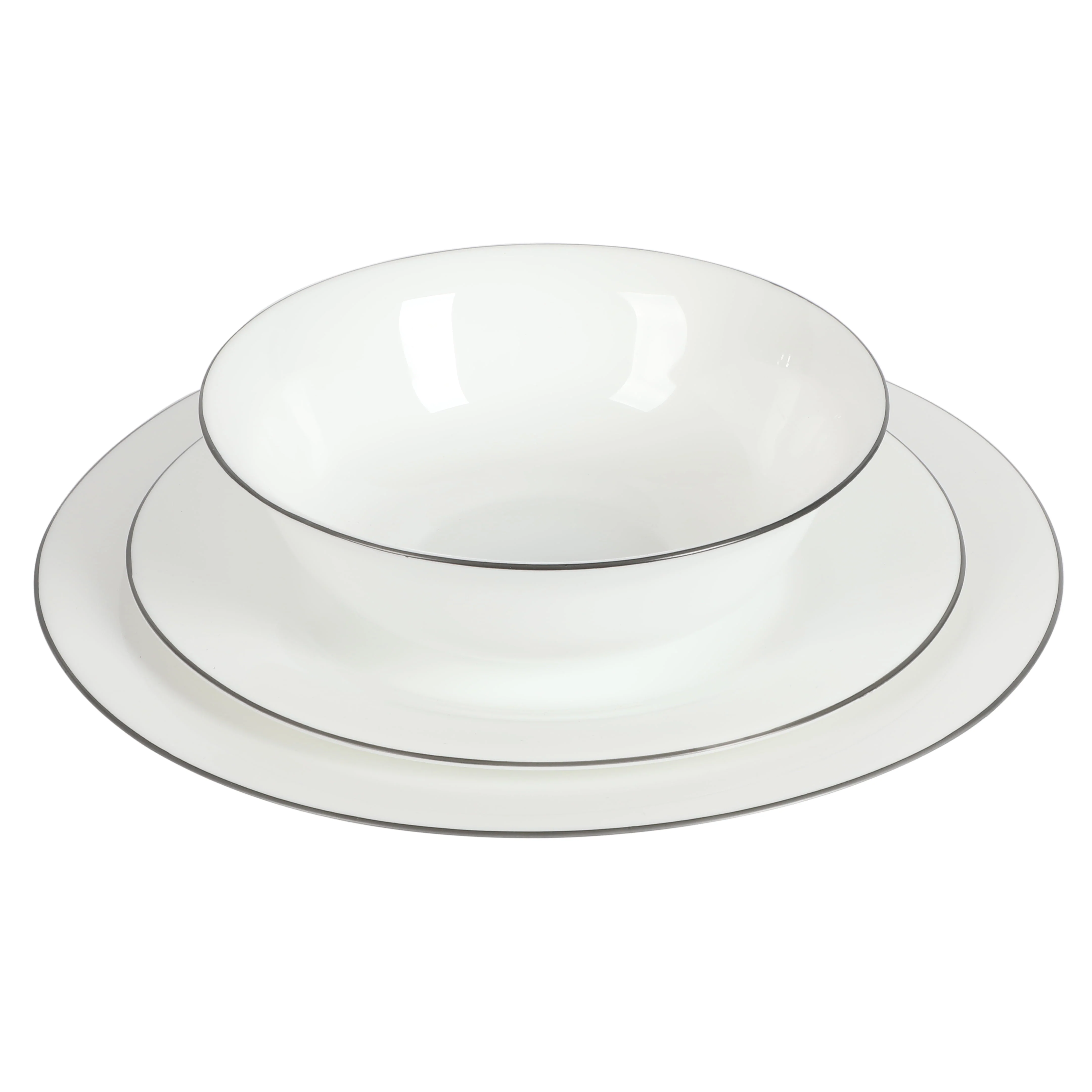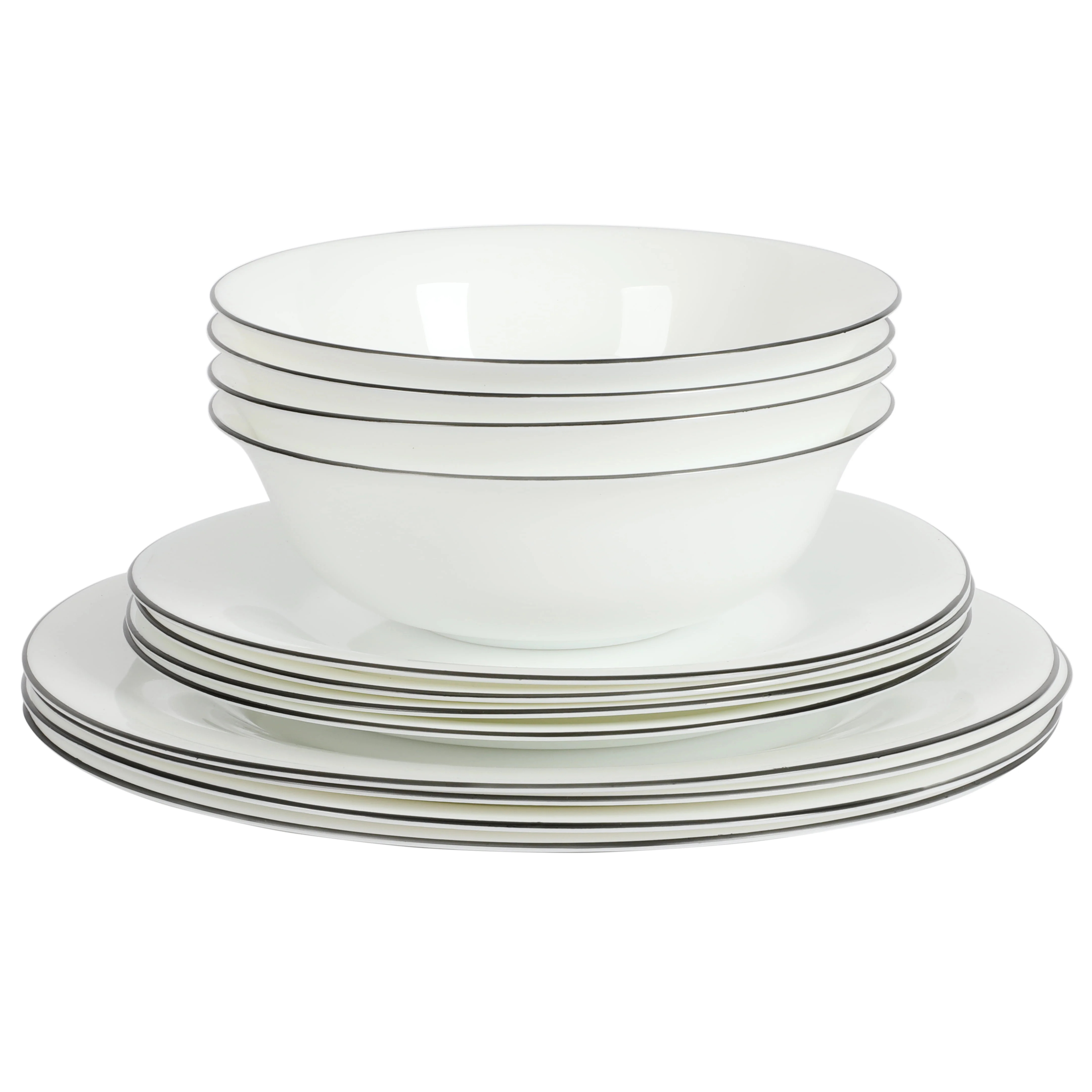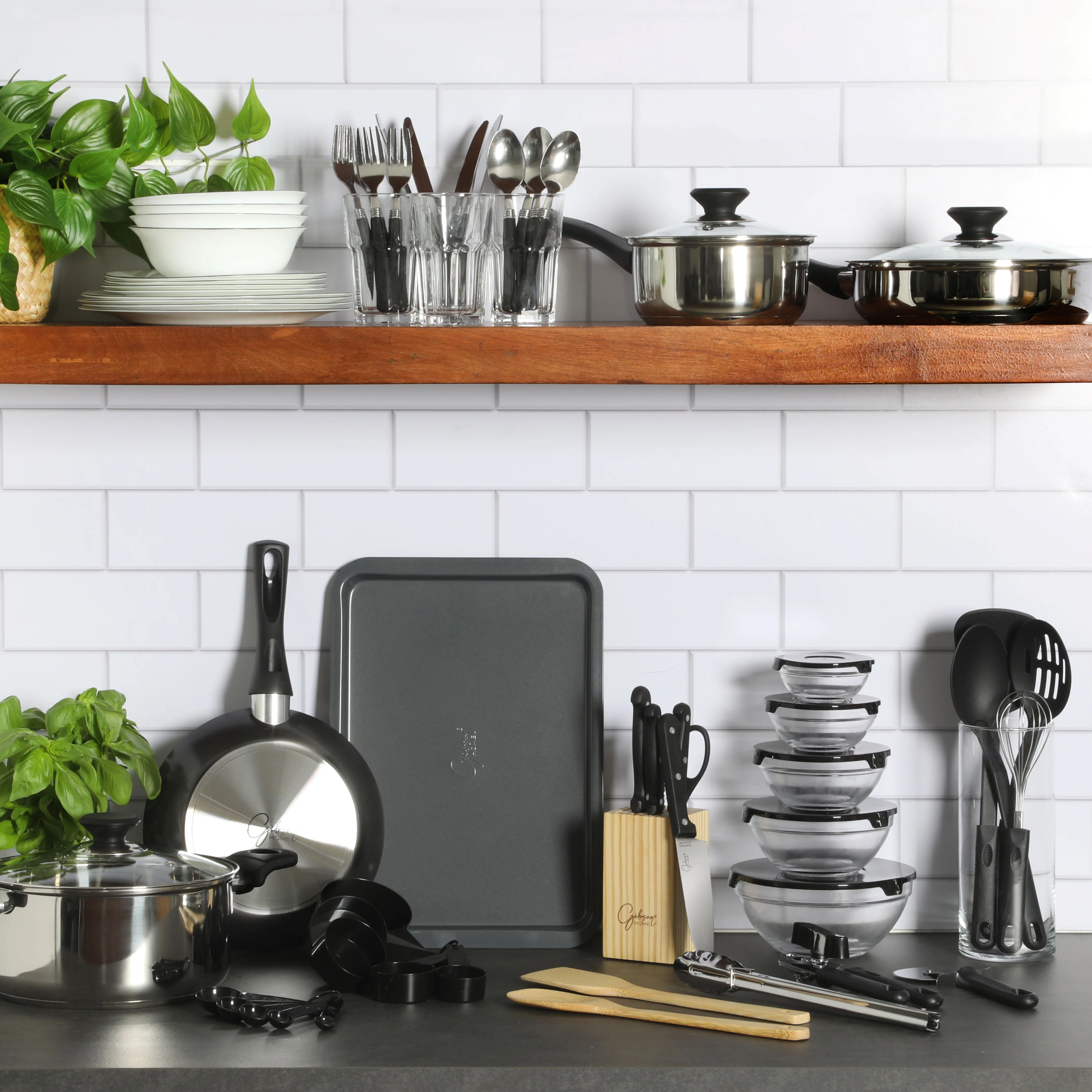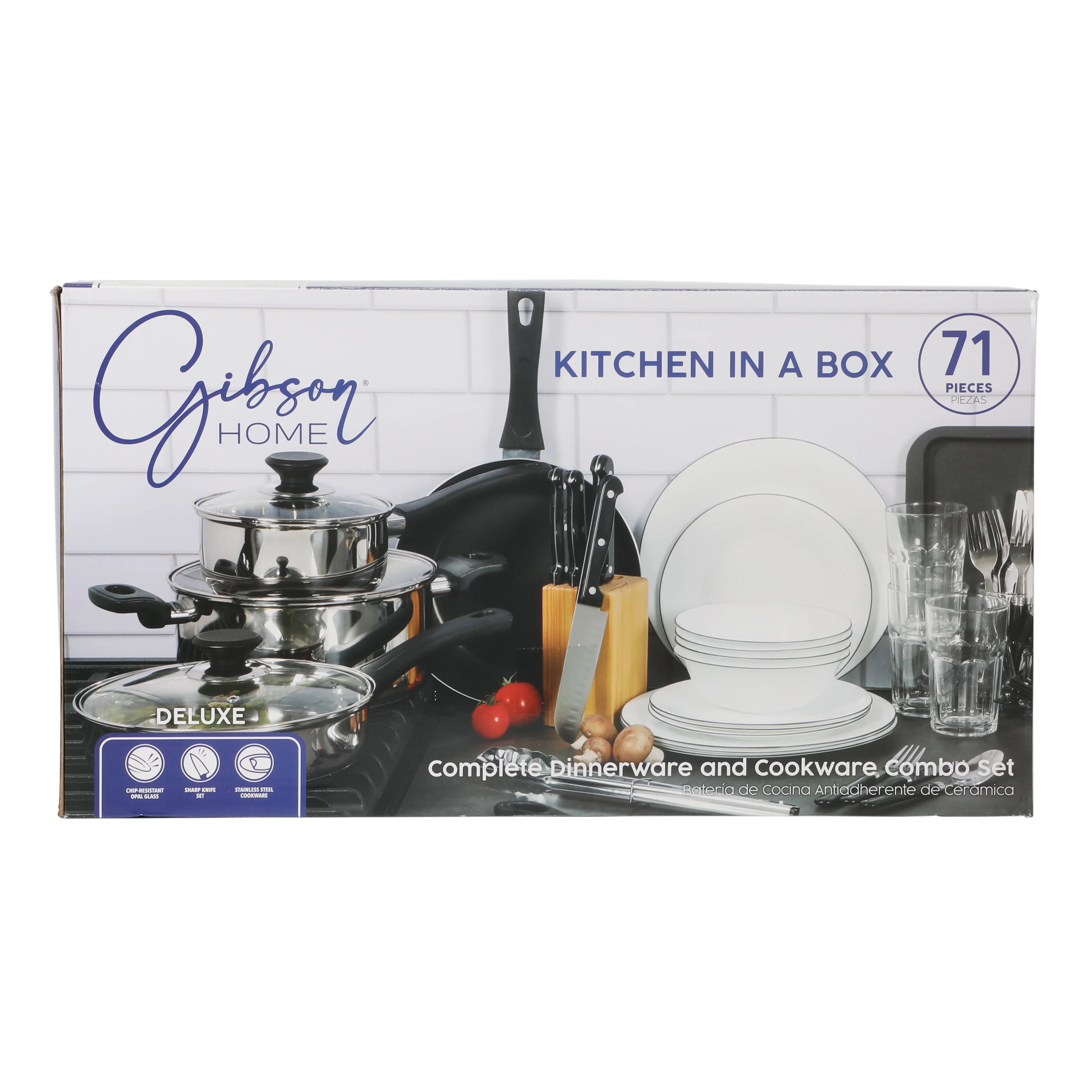 The Gibson Home Kitchen in a Box 71-piece Dinnerware and Cookware Combo Set is an expansive collection of kitchen must-haves to equip a new kitchen or add to any home cook's growing dining and entertaining arsenal. This full set combines durability and style, function, and versatility. Crafted from break- and chip-resistant tempered opal glass, each plate and bowl is suitable for any meal or celebration. Smooth, high-fired glaze creates an ultra-hygienic and non-porous surface for easy cleanup. Set the table with these plates and glass tumblers for an enjoyable dining experience. For easy, quick frying, use the nonstick aluminum frying pan that promotes even heat distribution, smooth food release, and quick cleanup after making over-easy eggs, omelets, pancakes, and more. Bamboo and nylon cooking utensils are gentle on nonstick cookware and other delicate finishes. They maintain as a sharp edge to make any cutting task a breeze. Store the knives in the sturdy wood block for safekeeping. For other food prep tasks such as measuring and mixing ingredients, the stainless steel gadgets and mixing bowls are the perfect tools to perfect any recipe with ease and convenience. Make every home a Gibson Home. The industry's best-selling collection of everyday kitchenware and tableware is designed to be reliable, versatile, and exciting. Gibson Home includes elevated essentials that encompass style and value across a wide range of dinnerware, cookware, bakeware, cutlery, glassware, serve ware, and more. Enjoy your quality collection for everyday living and showcase your newest pieces while entertaining guests at the next gathering or event.