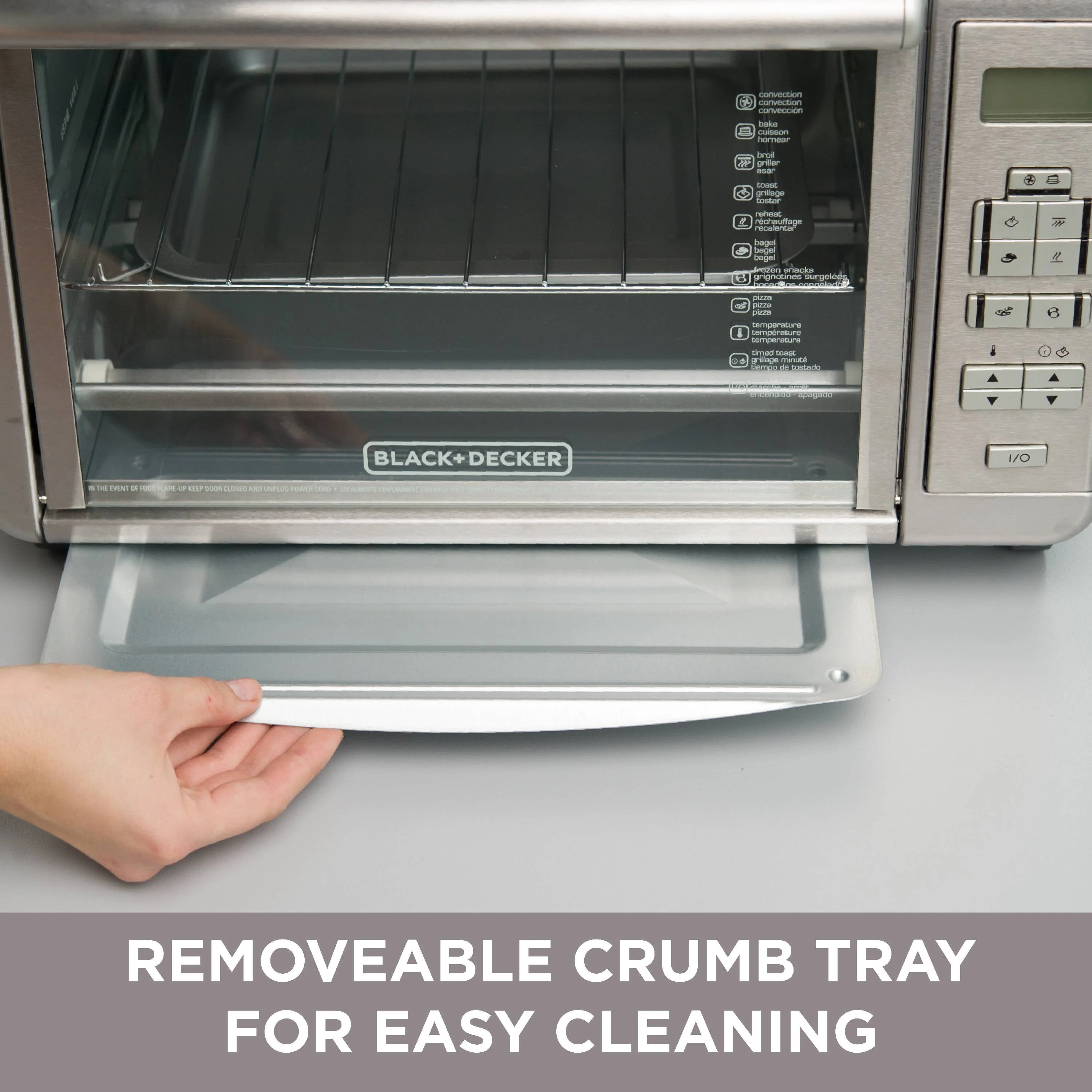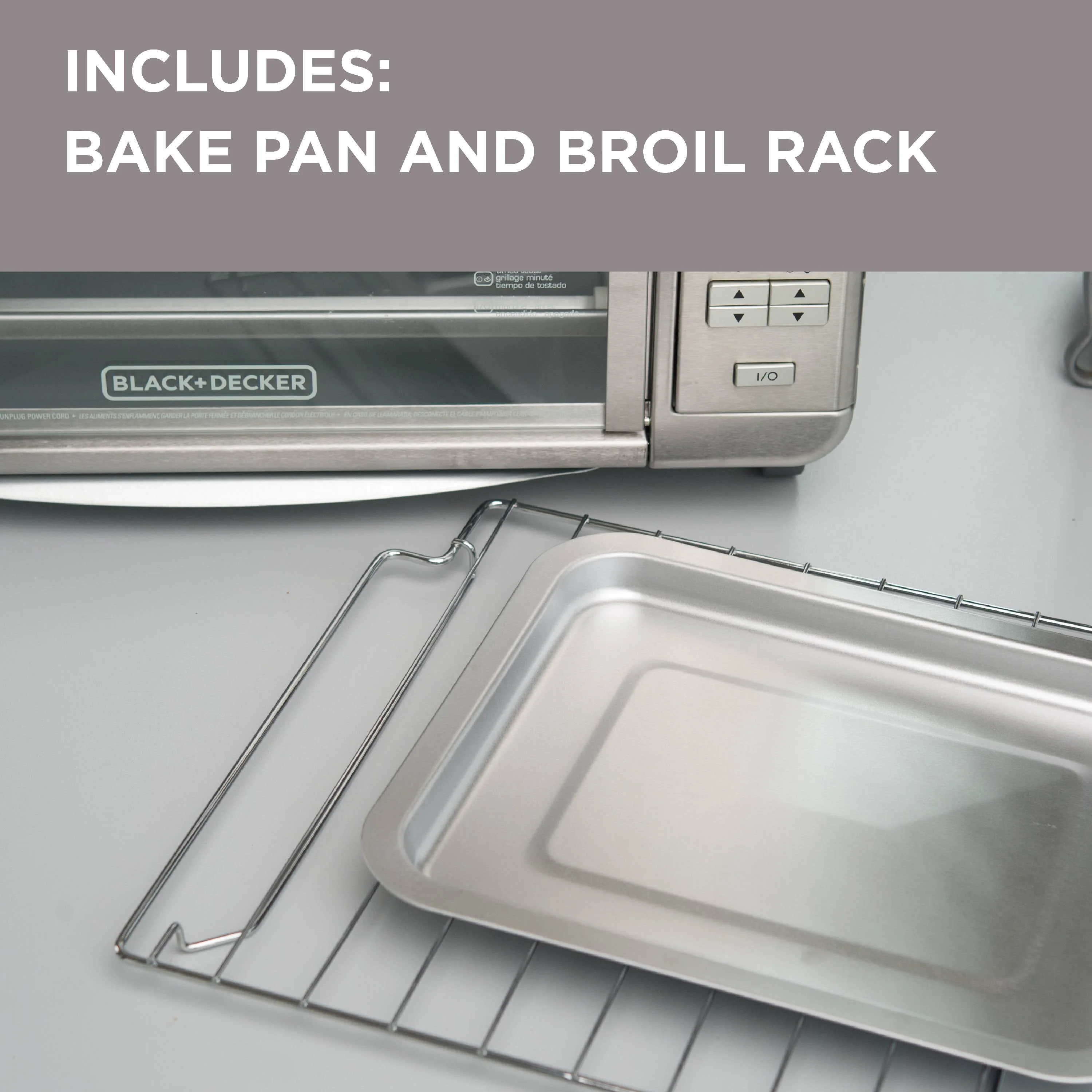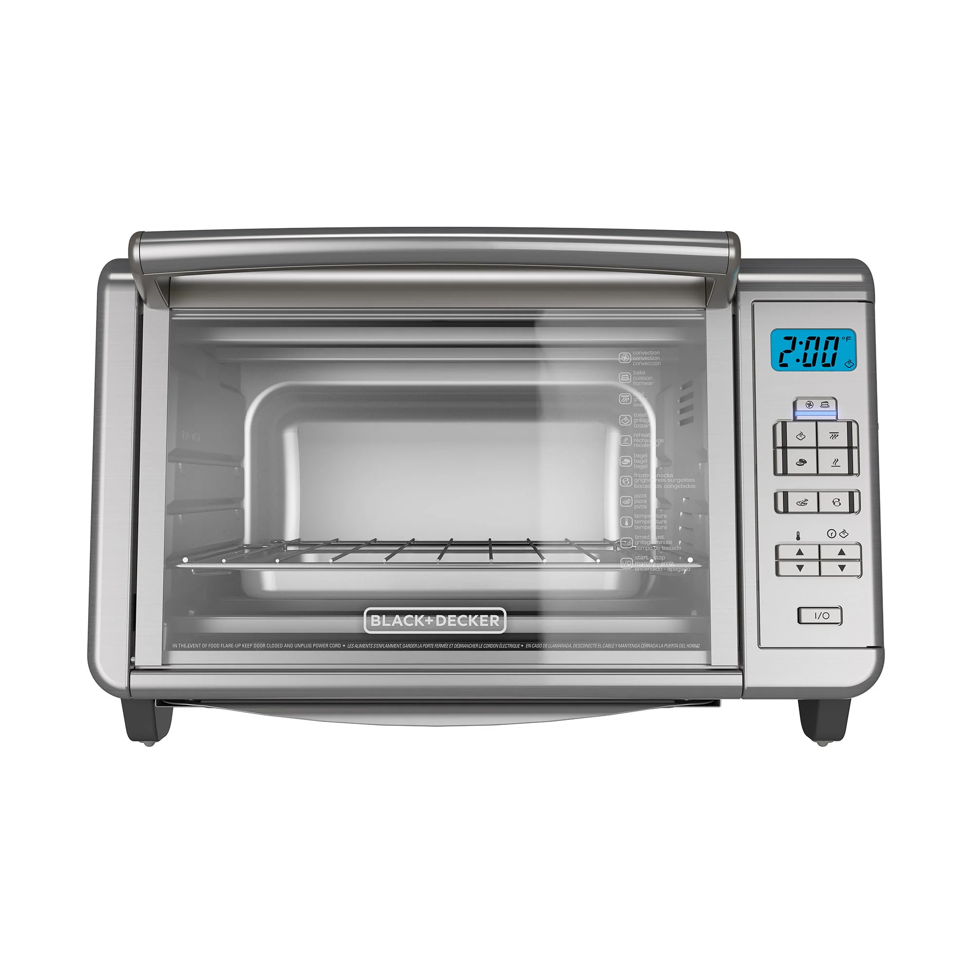 At-home cooking just got easier with the BLACK+DECKER 6-Slice Stainless Steel Digital Convection Countertop Toaster Oven with Broiler Pan. With a large interior and 20% faster cooking times than previous models, the seven dedicated cooking functions quickly perfect everything from 12" pizzas to reheated leftovers. Intuitive digital controls make it easy to set the time, temperature, and cooking function, and the 120-minute timer features stay-on and auto-shutoff functionality. Convection technology circulates air within the oven for fast and even results while baking. Plus, the toaster oven includes a broiler pan and an external crumb tray that slides in and out, making cleanup a breeze. When it's time to eat, trust the #1 brand in toaster ovens-BLACK+DECKER. Compared to BLACK + DECKER TO1660B. Three rack positions bake an entire chicken or finish steaks right under the broiler! The included rack slides into three different positions for flexible cooking. Bake/broiler pan don't worry about finding pans to fit in the oven. The included baking/broiling pan fits perfectly, making it easy to insert and remove food. Toasting rack also included.