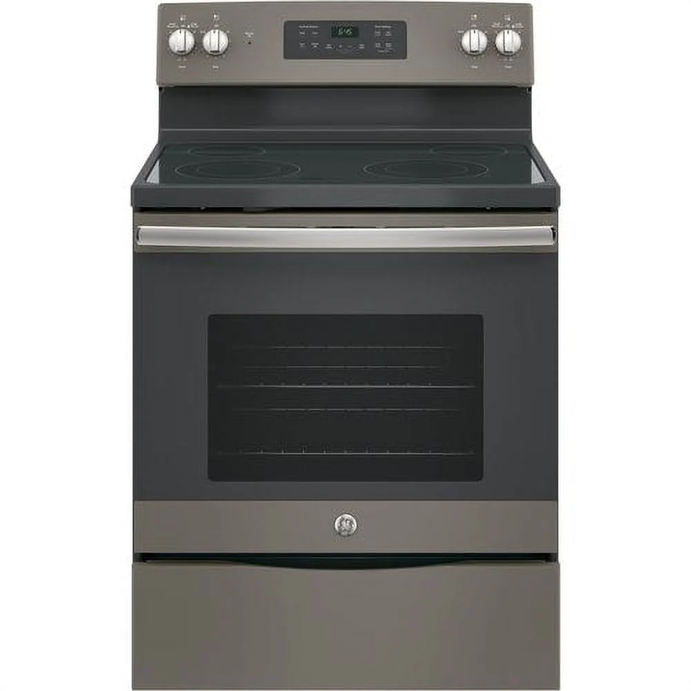 General Electric, GE® Appliances 30” Free-Standing electric range model JB645RKSS in Stainless Steel. Features: -Two 9"/6" power boil elements; Two powerful elements boil water 25% faster than standard GE elements and adjust to fit cookware. -Self-clean oven; Cleans the oven cavity without the need for scrubbing. -Dual-element bake; Upper and lower elements produce even heat and great results. -Ceramic glass cooktop; Creates a cooking environment that is not only function, but also easy to clean and maintain. -Removable full-width storage drawer; Store cookware or kitchen accessories. -5.3 cu. ft. oven capacity; Enough room to cook an entire meal at once. Fuel Type: -Electric. Product Type: -Free-standing. Control Type: -Touch/Knobs. Stove Top Material: -Ceramic/Glass. Accessories Included: -Storage drawer/Backsplash/Burner. Number of Ovens: -Single oven. Cooktop Surface: -Smoothtop. Primary Material: -Steel. Oven Capacity: -5.3 Cubic Feet. Dimensions: Overall Height - Top to Bottom: -47". Overall Width - Side to Side: -29.875". APPROXIMATE DIMENSIONS (HxWxD) 47 H x 29 7/8 W x 28 D in.