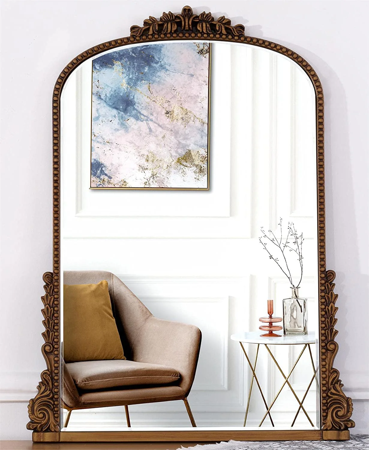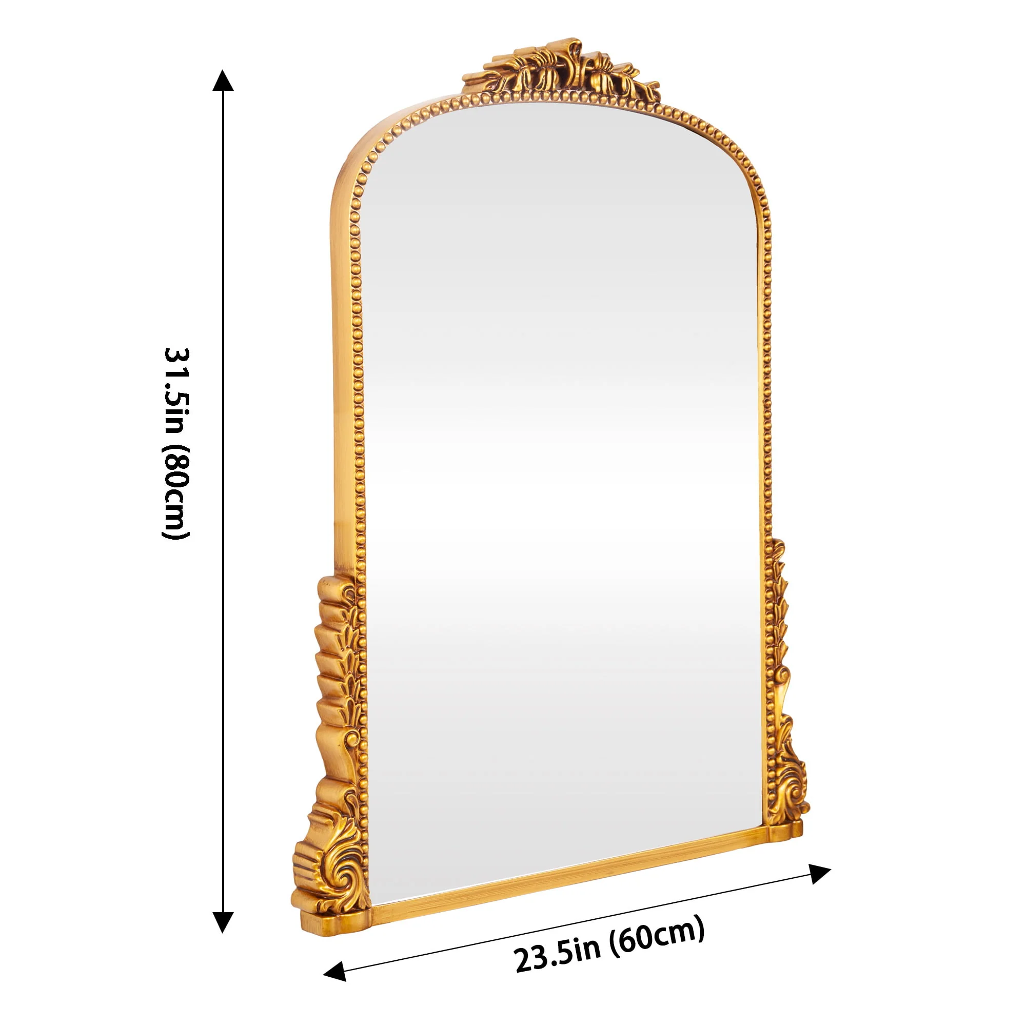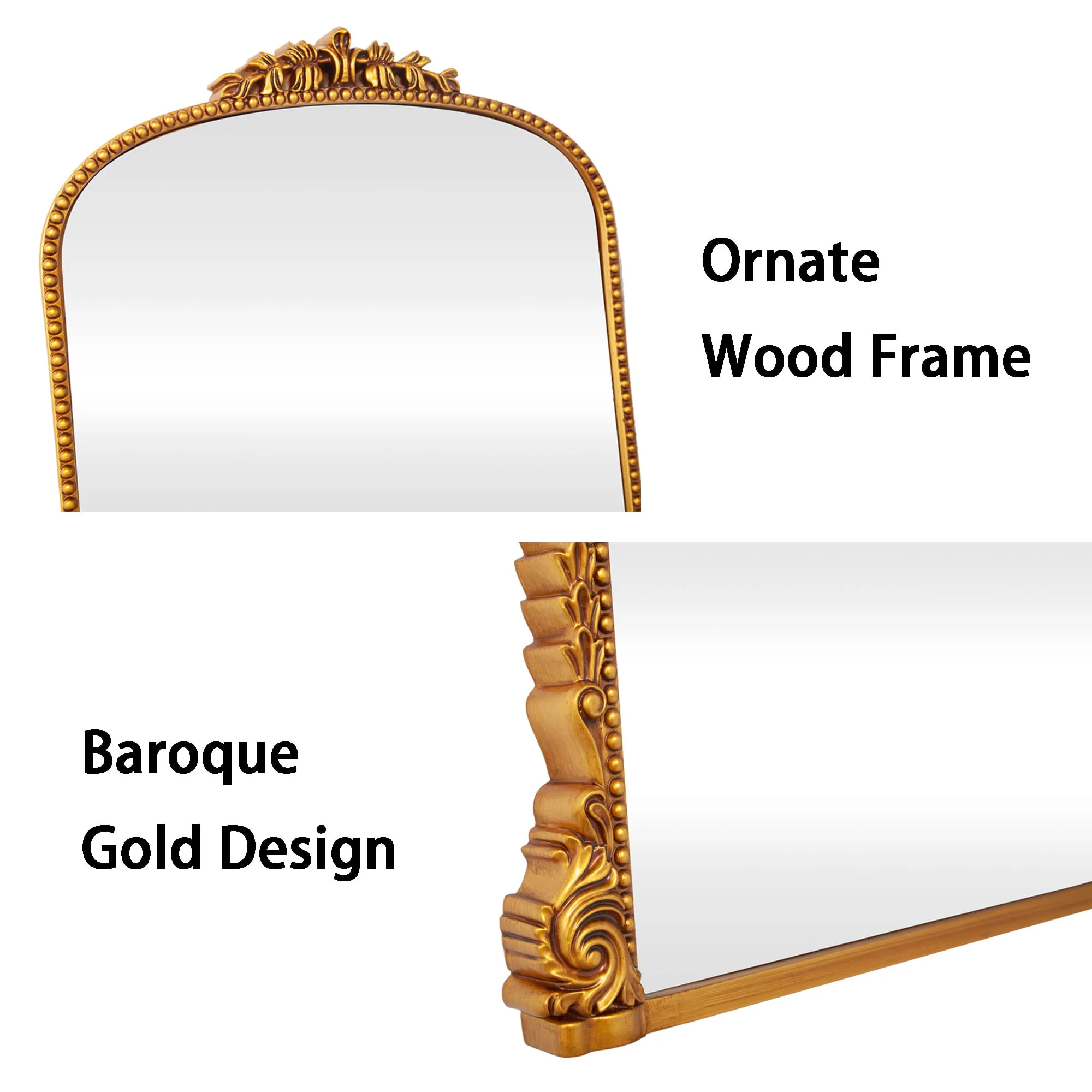 Add some vintage charm to your decor with the Traditional Baroque Arch Wall Mirror.The golden baroque style arched hanging mirror is made of strong HD glass with 5mm thickness and PU frame and back plate, the whole product is very textured but light and easy to hang on the wall.