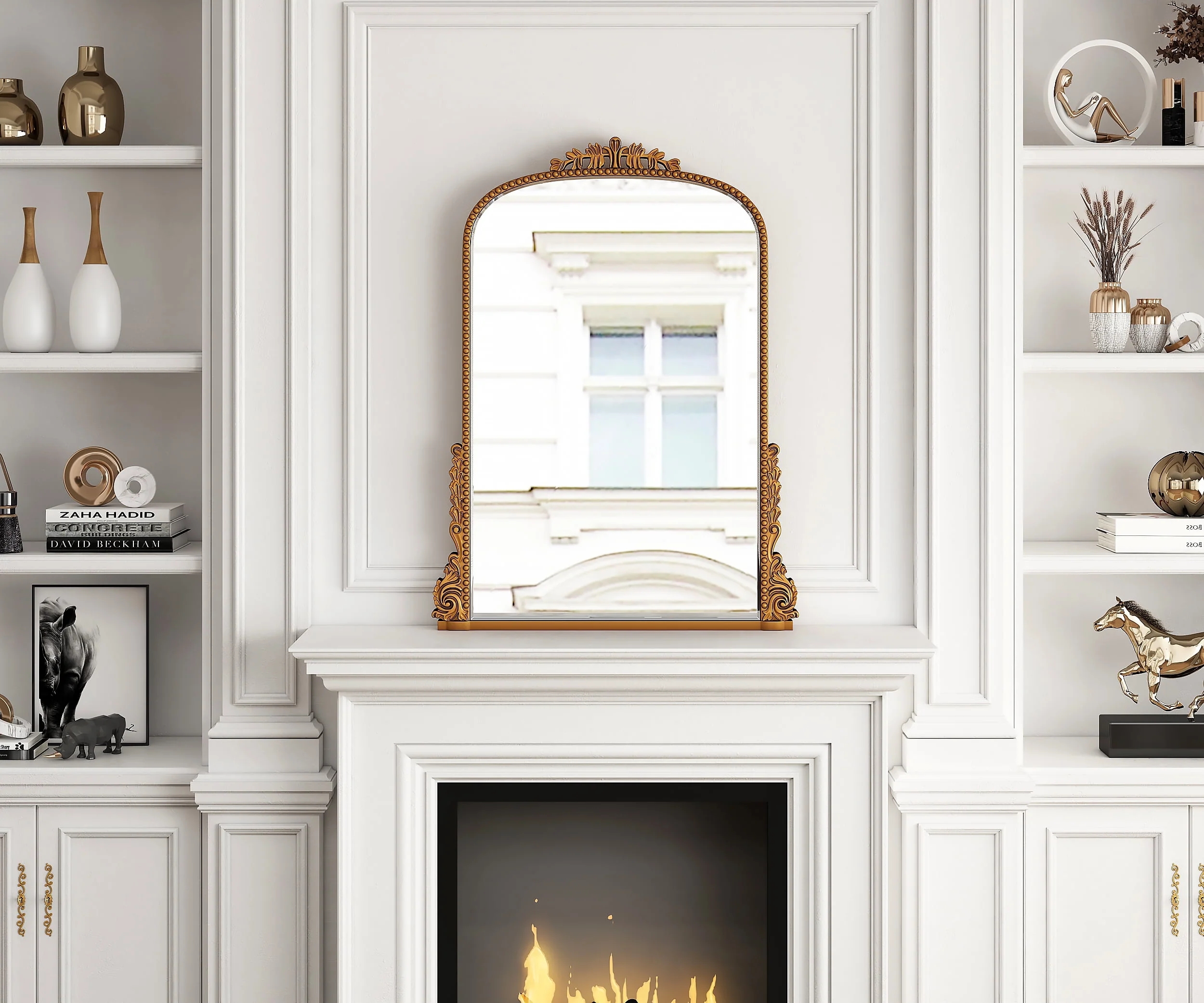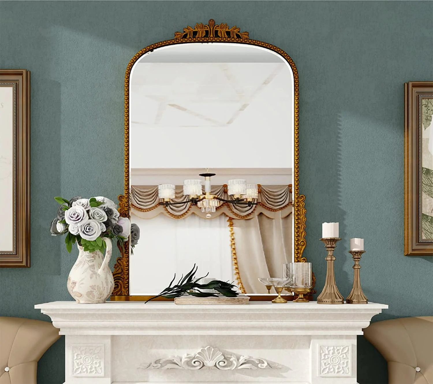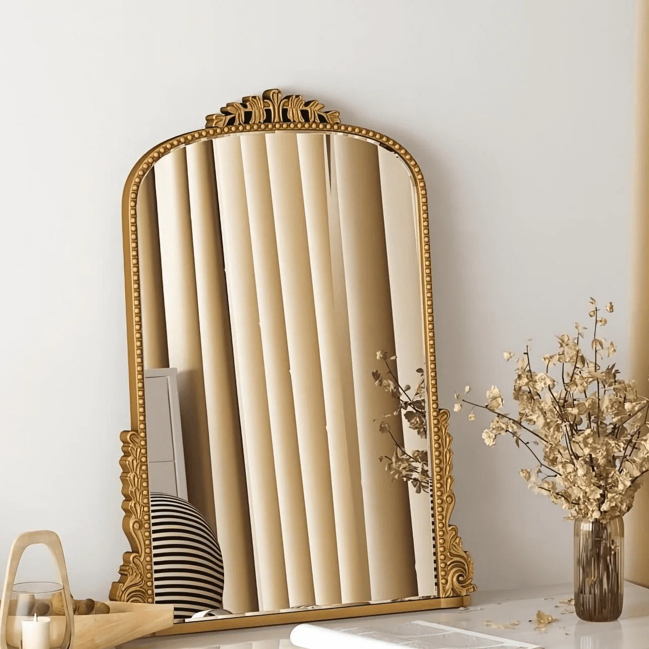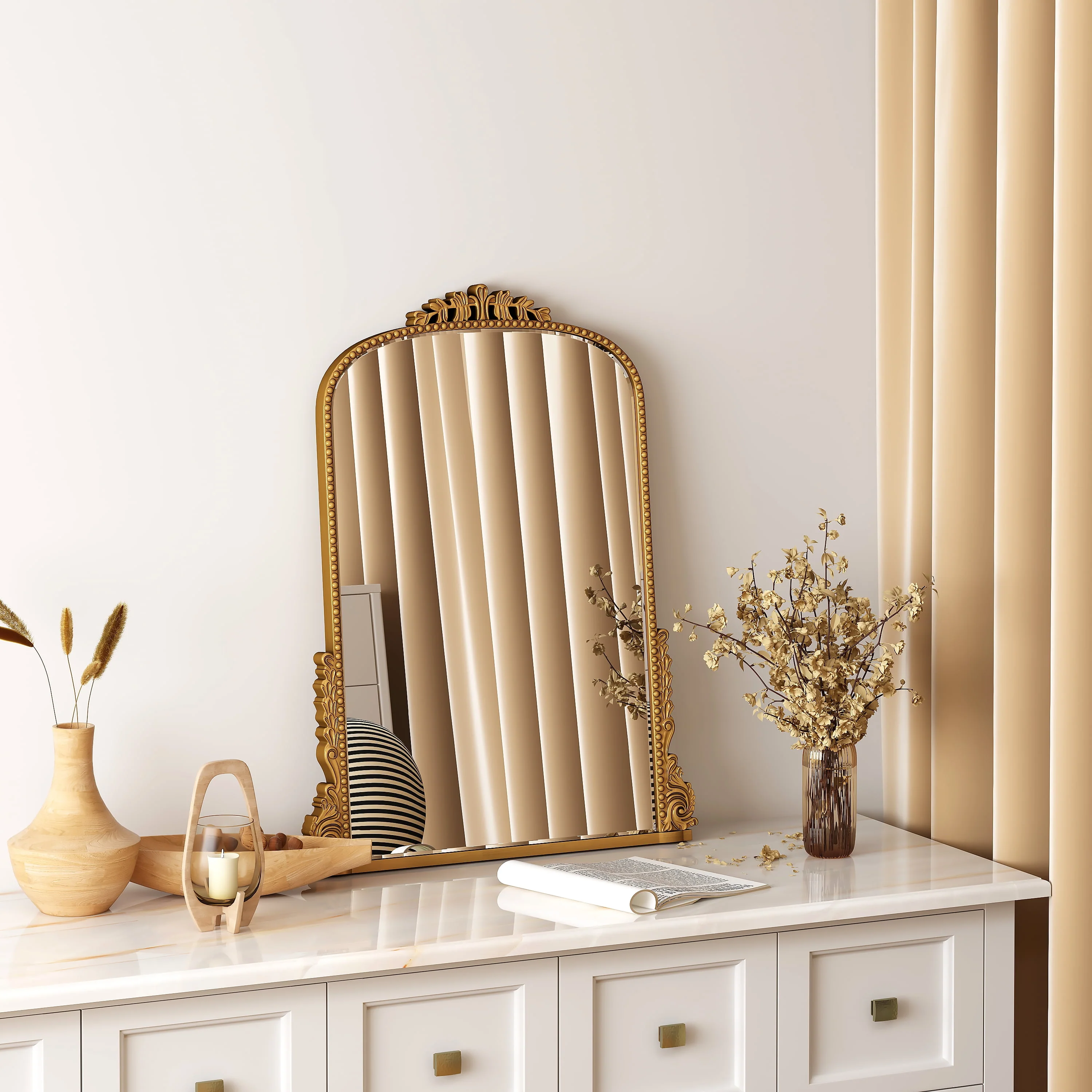 Add some vintage charm to your decor with the Traditional Baroque Arch Wall Mirror.The golden baroque style arched hanging mirror is made of strong HD glass with 5mm thickness and PU frame and back plate, the whole product is very textured but light and easy to hang on the wall.