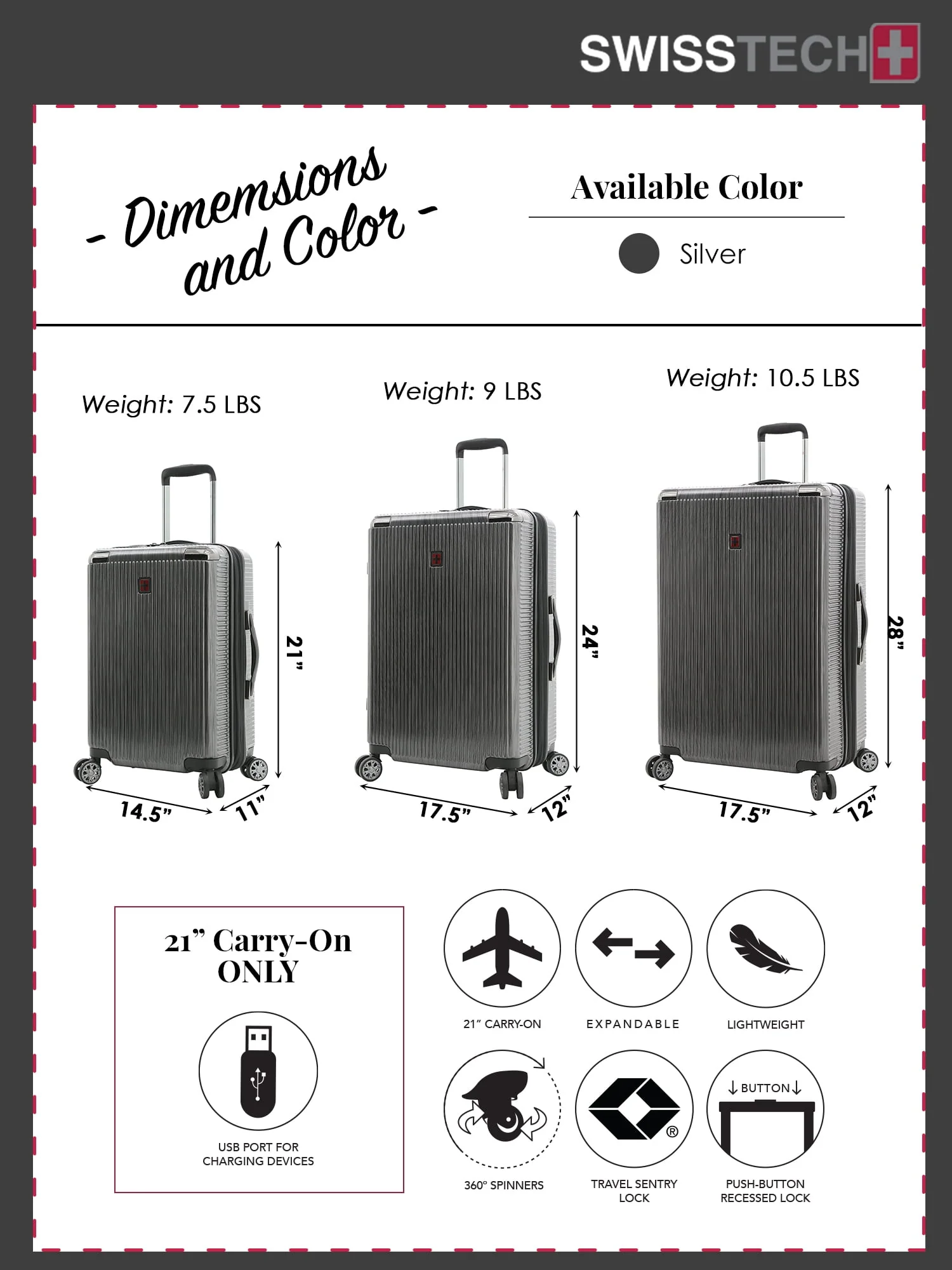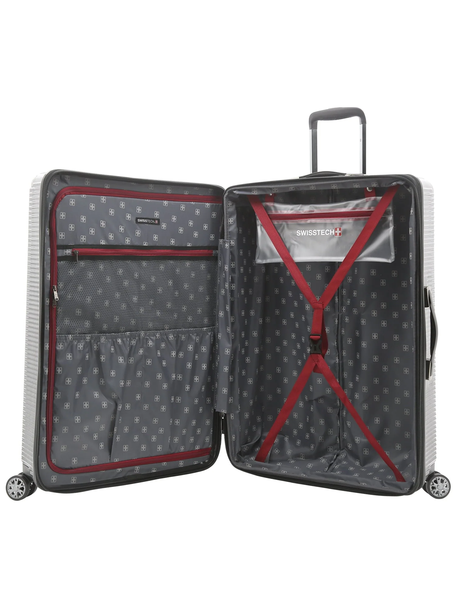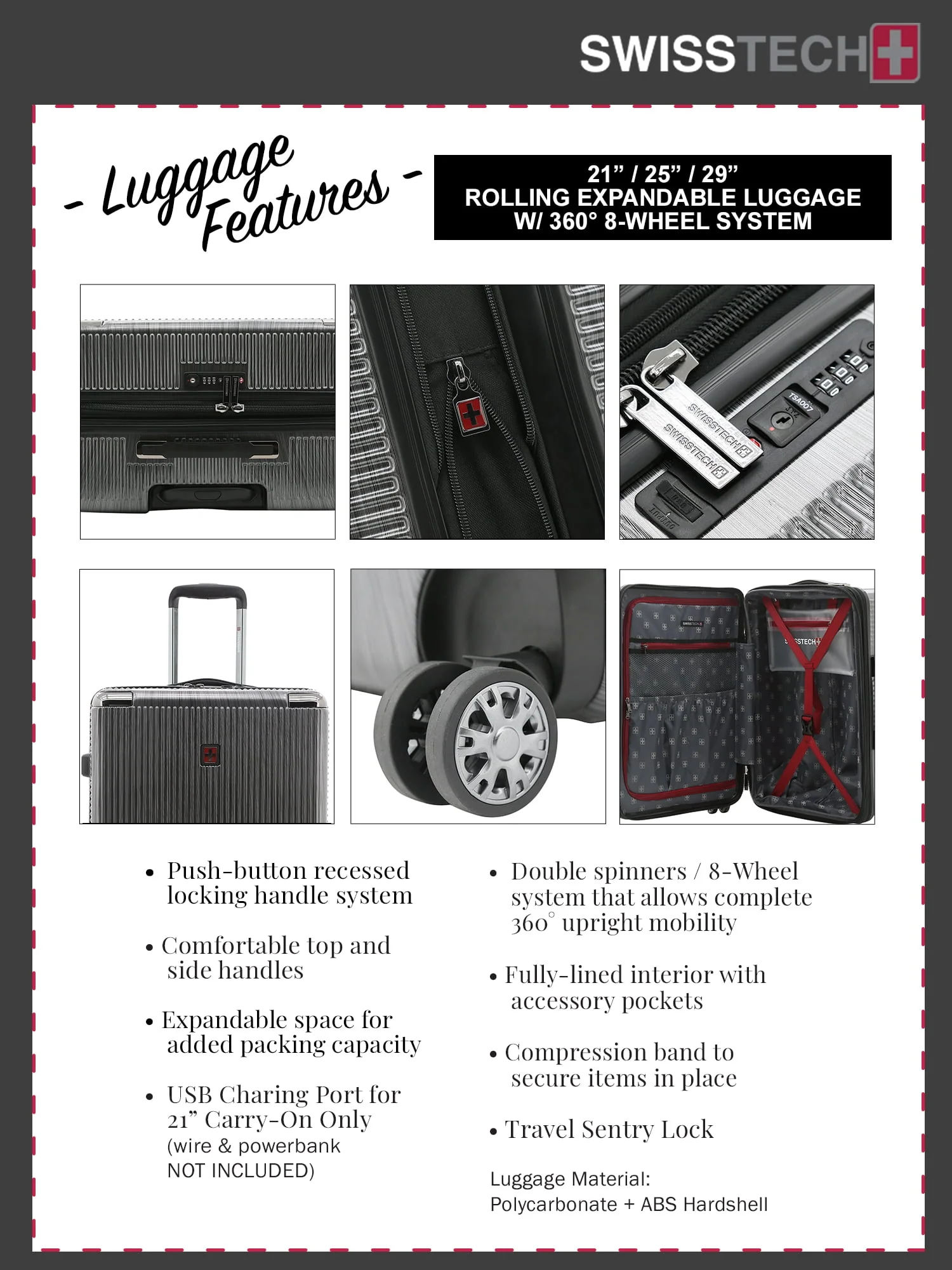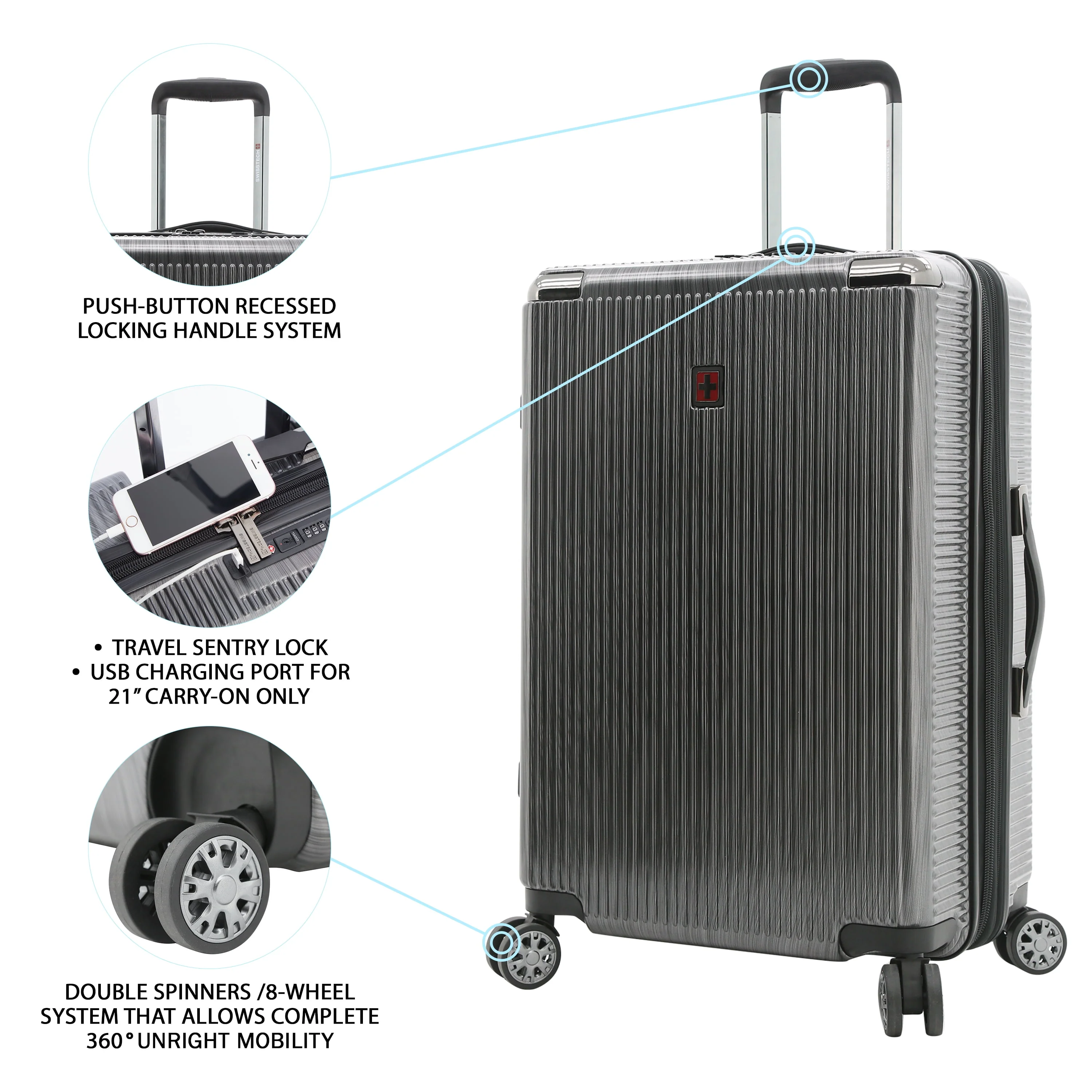This Swiss Tech 29" lightweight hard side expandable rolling checked suitcase features 8-wheel spinners, a multi-stage locking telescopic handle, with soft grip handle, and an authorized TSA combination lock with built in USB port. Made of hard side ABS and burnished with polycarbonate coating for extra protection, it will stand up to the SWISS TECH name. Additionally, it expands 2" for more packing capacity. It has both a side and top soft gel carry handles for easy carrying, ideal for removing the bag from the overhead compartments on planes. The interior has plenty of packing areas including a separate compartment, removable wet pocket, elastic shoe pockets, and sturdy tie-down compression straps that holds your items in place. This Excursion rolling upright measures 29" x 19.5" x 12", and the total height with the wheels is 31" x 19.5" x 12" and weighs 10.5 lbs. It is exclusive on Walmart.com and comes with 15-year manufacturer’s warranty.
