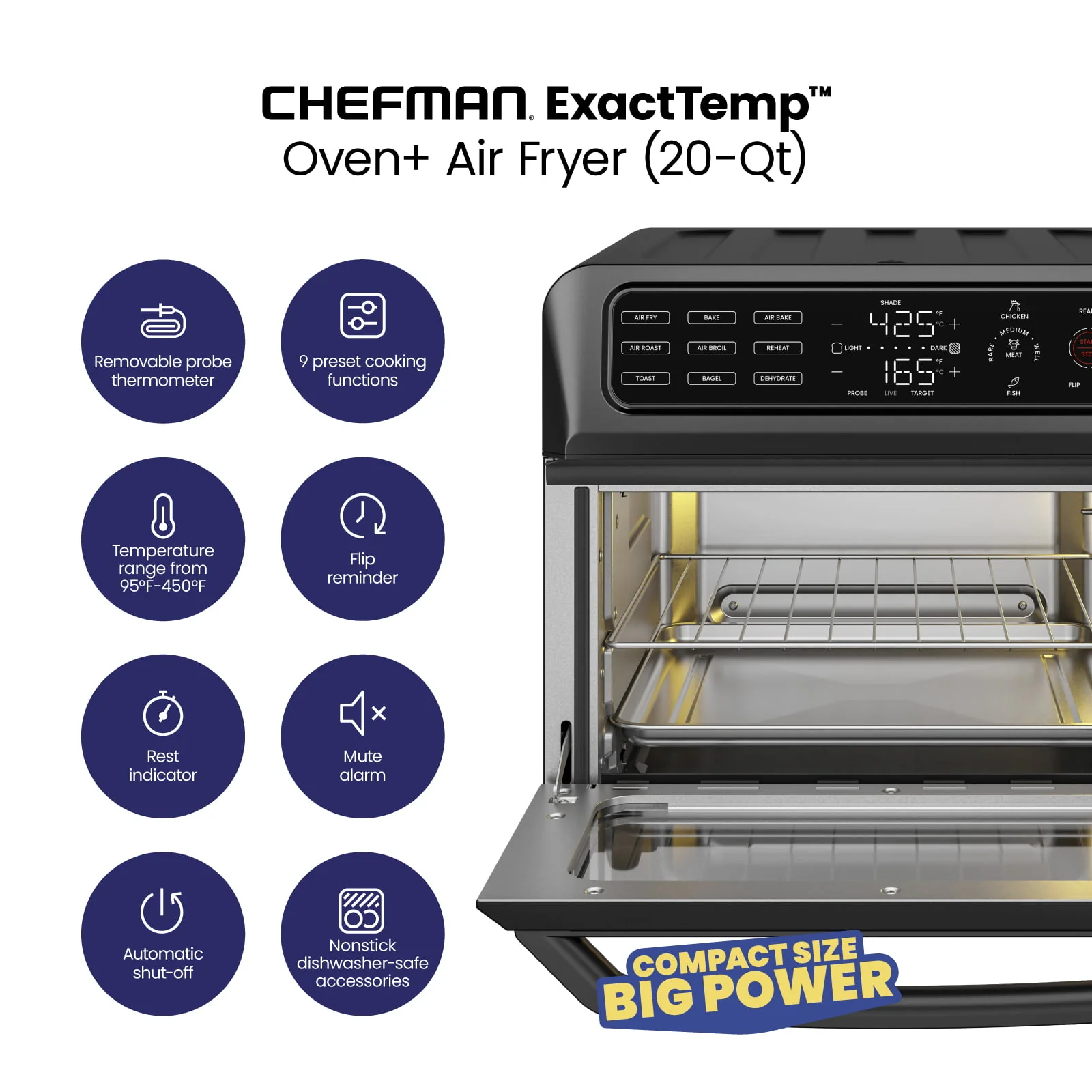 With the ExacTemp™ Chefman Oven+ Air Fryer you get compact countertop convenience with precise cooking and time-saving features. The integrated meat thermometer helps cook foods to the perfect doneness with easy presets so you never have to guess. Choose between 9 cooking functions including air fry, air roast, toast, bake air broil, bake, air bake, reheat and dehydrate. Lots of extra features including toasting shades, preset meat options, flip reminder, and more allow you to cook according to your preference. Plus, nonstick dishwasher-safe parts keep clean-up simple. Accessories included. 120V/1800W–RJ50-SST2-PB