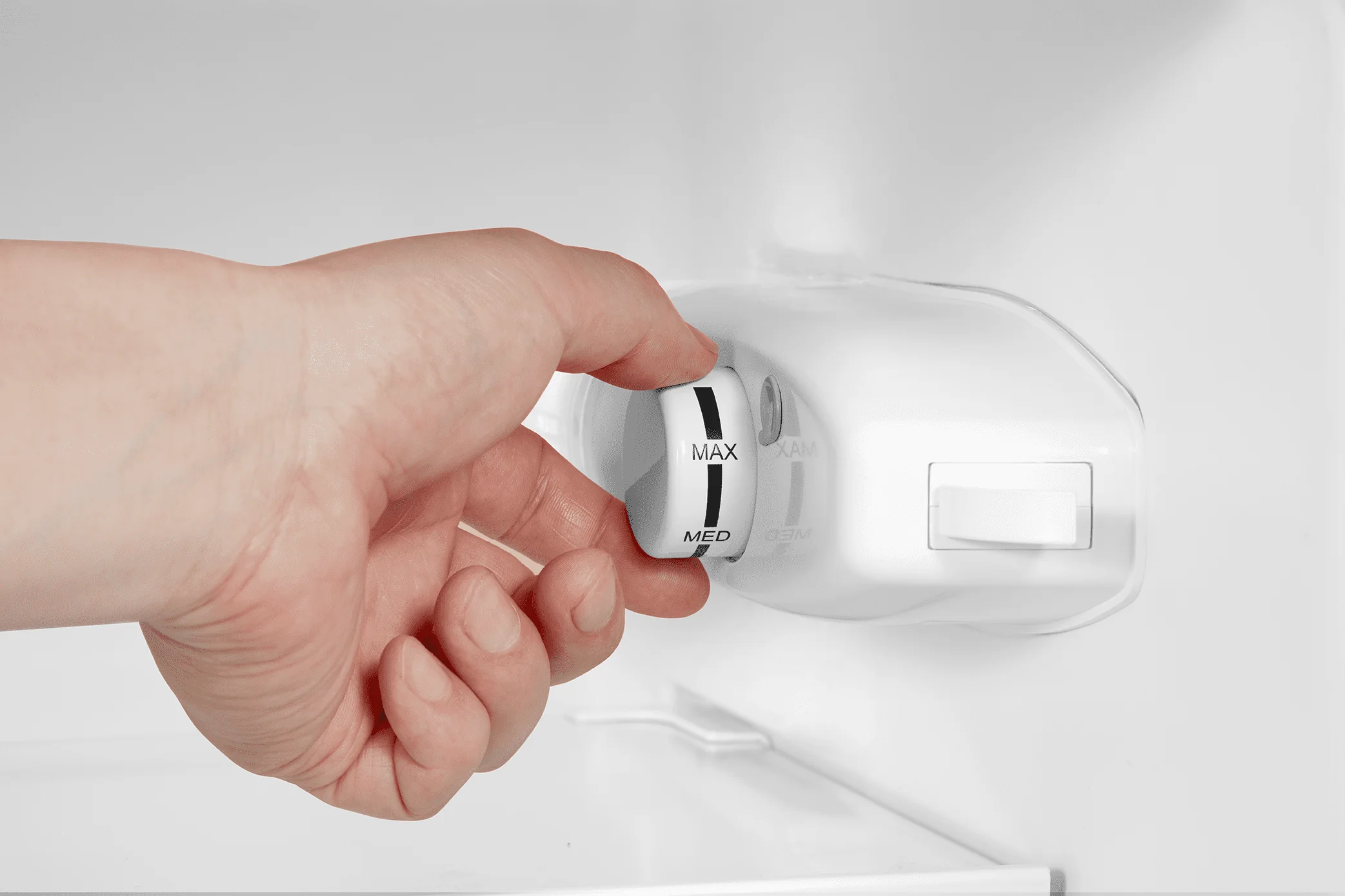 Inside, the fridge is thoughtfully organized with adjustable glass shelves, door bins, and a crisper drawer. These features offer customizable storage options, allowing you to efficiently organize and access your items.