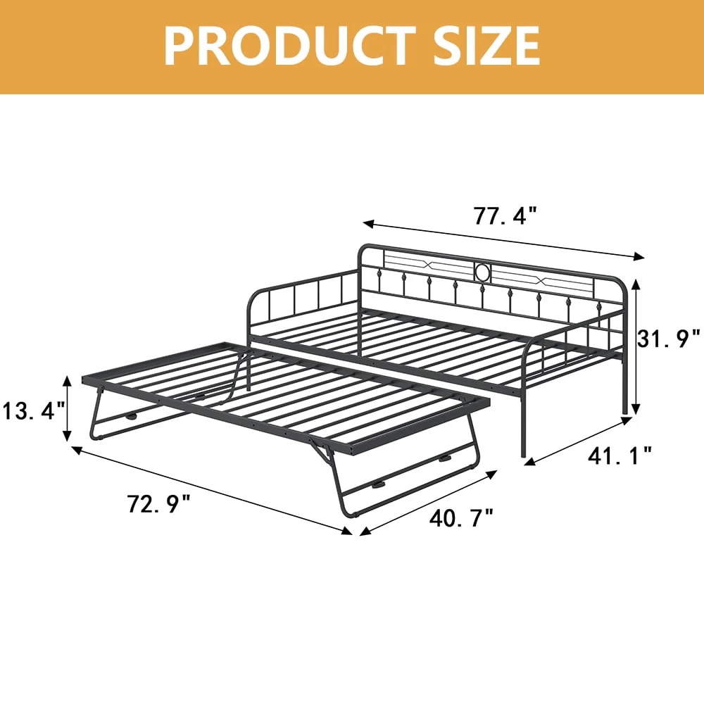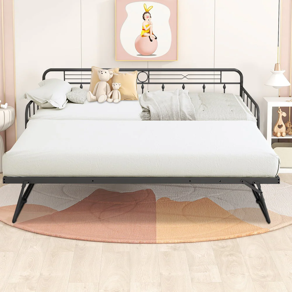 Sesslife Metal Daybed with Adjustable Trundle, Twin Size Daybed with Twin Size Pop up Trundle Bed, Heavy - Duty Sofa with Portable Folding Trundle Bed for Bedroom Living Room (Black)