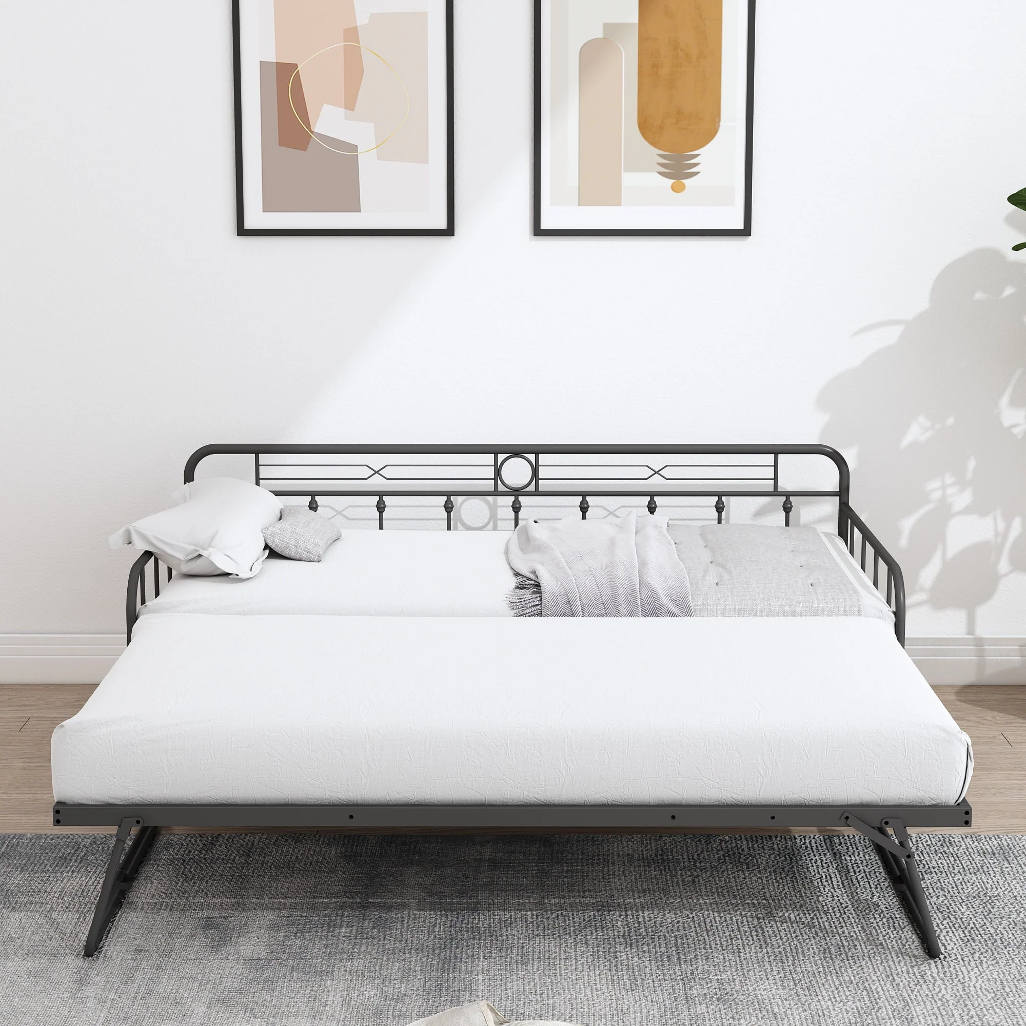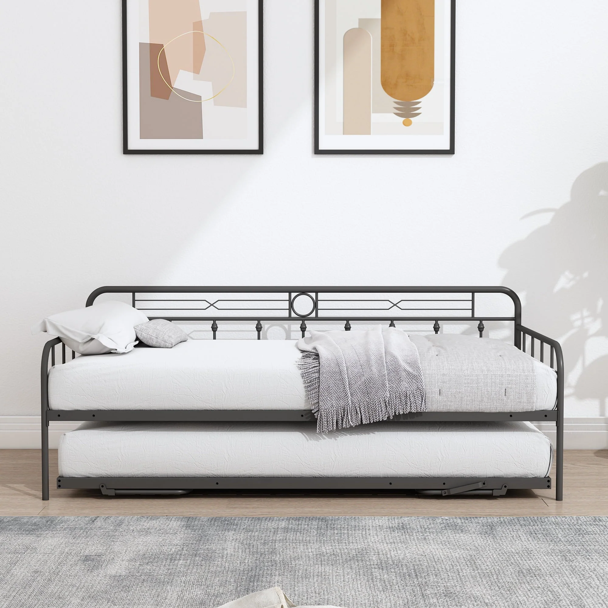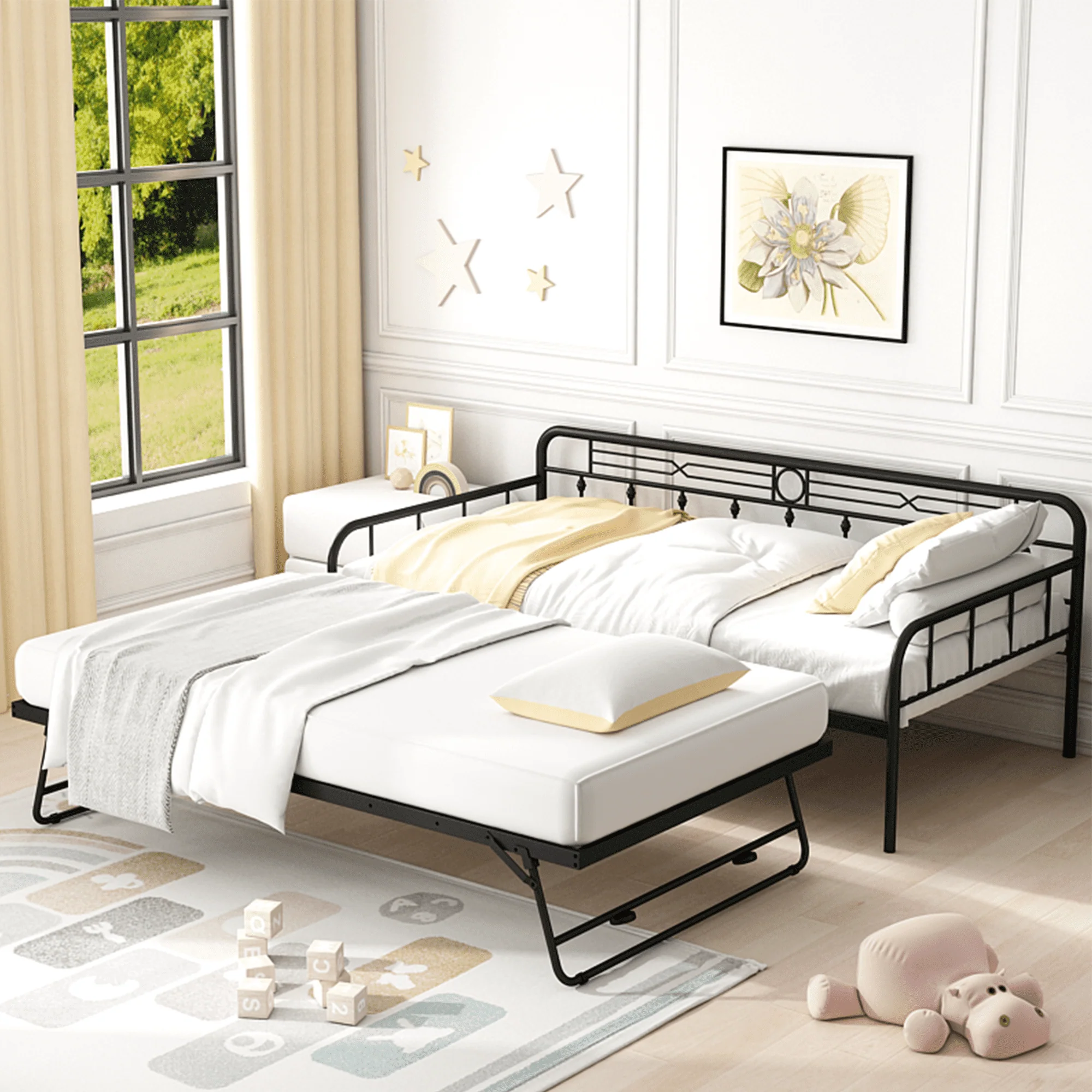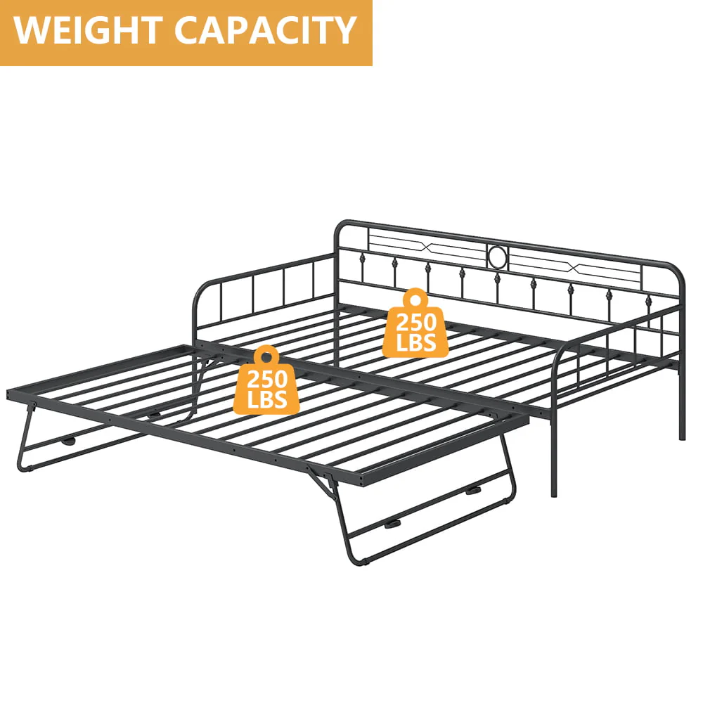 For stability and durability, the surface of this SESSLIFE steel daybed has been processed by powder coating, so it offers a comfortable touch feeling. The pull-down bed with trundle can be stood up and it has the same height as the daybed, in that case, the using area of this daybed would be double. Since the pull-down bed can be used alone, this daybed with a pull-down bed offers a minimum of three using methods for your space. The two different colors allow you to choose the options according to your preference or home style.