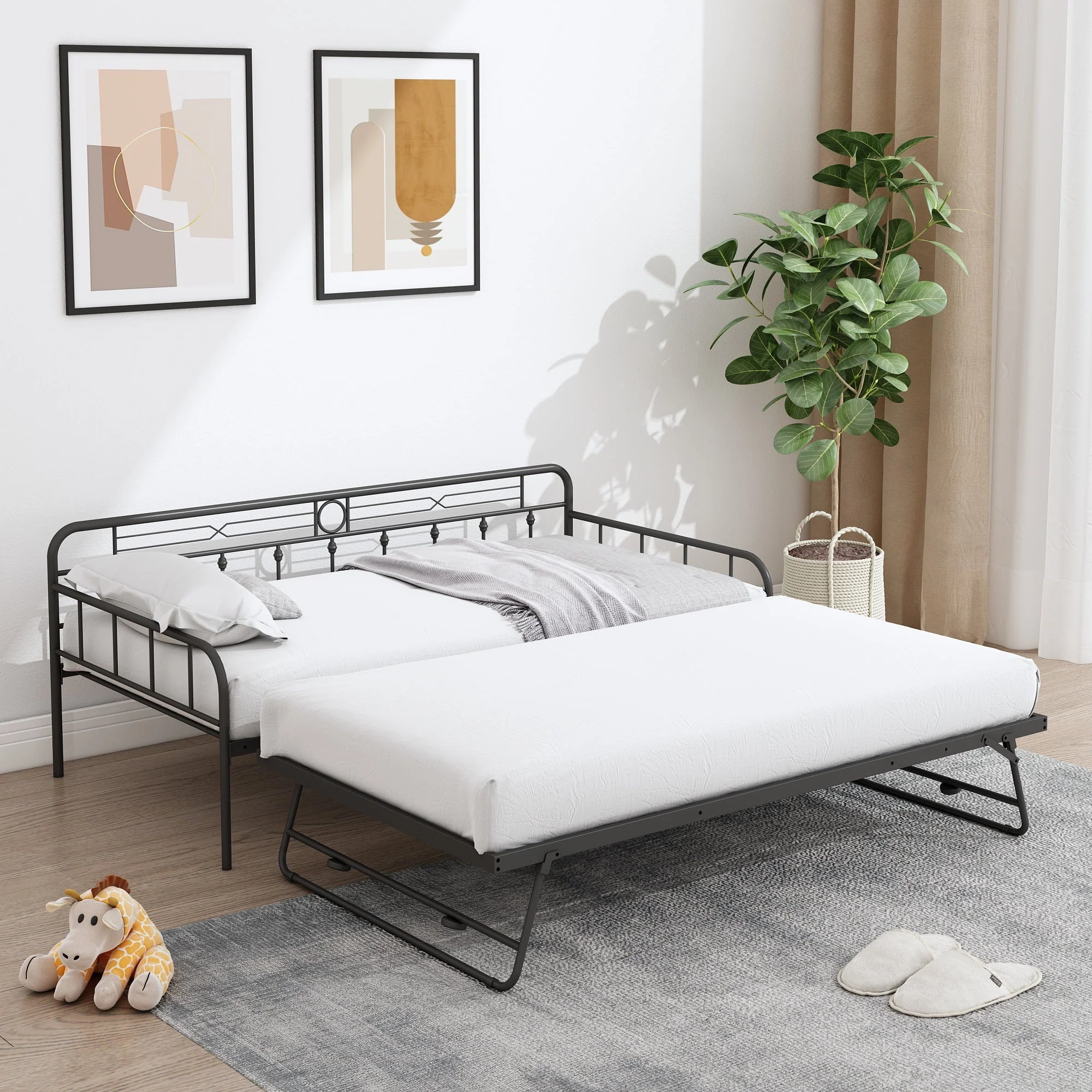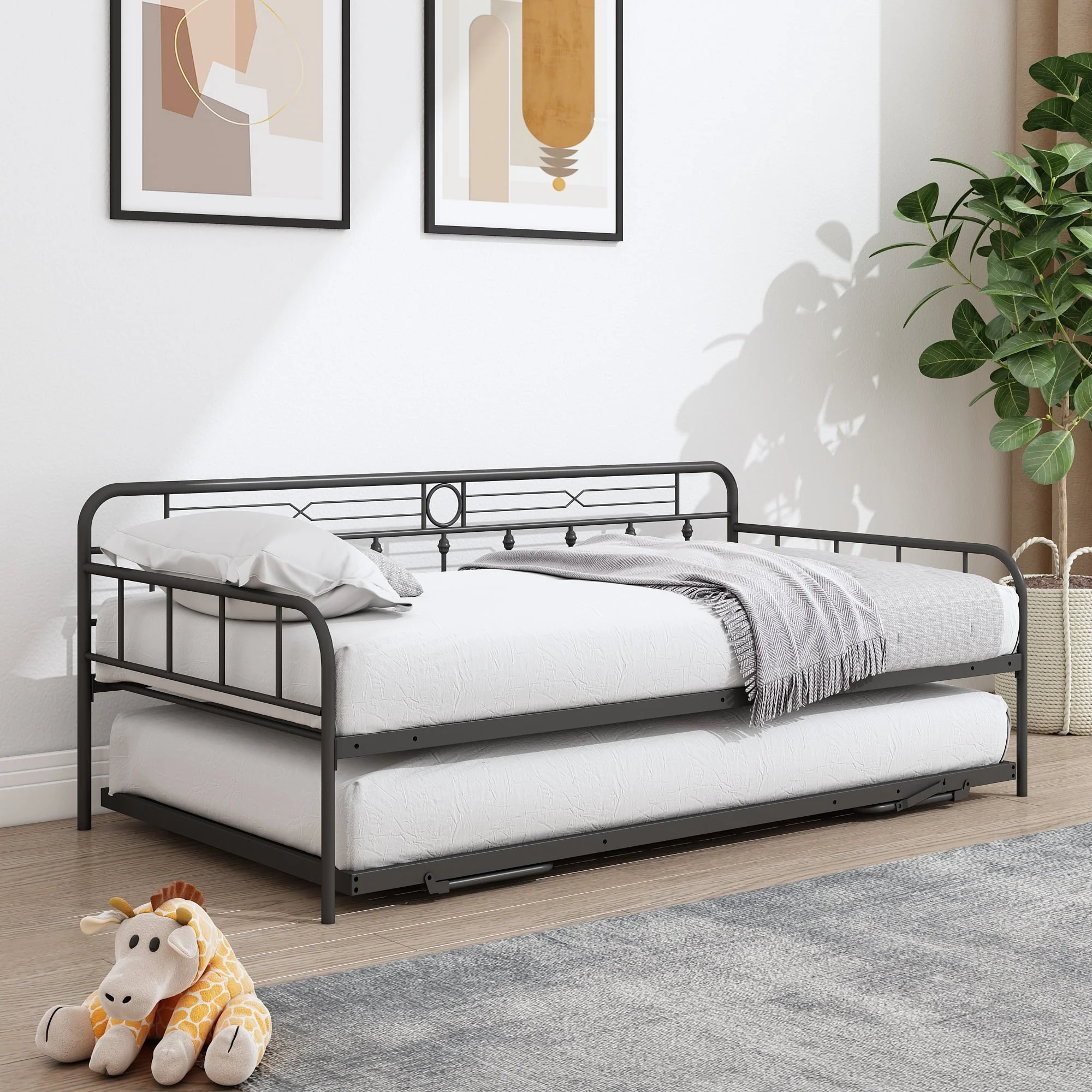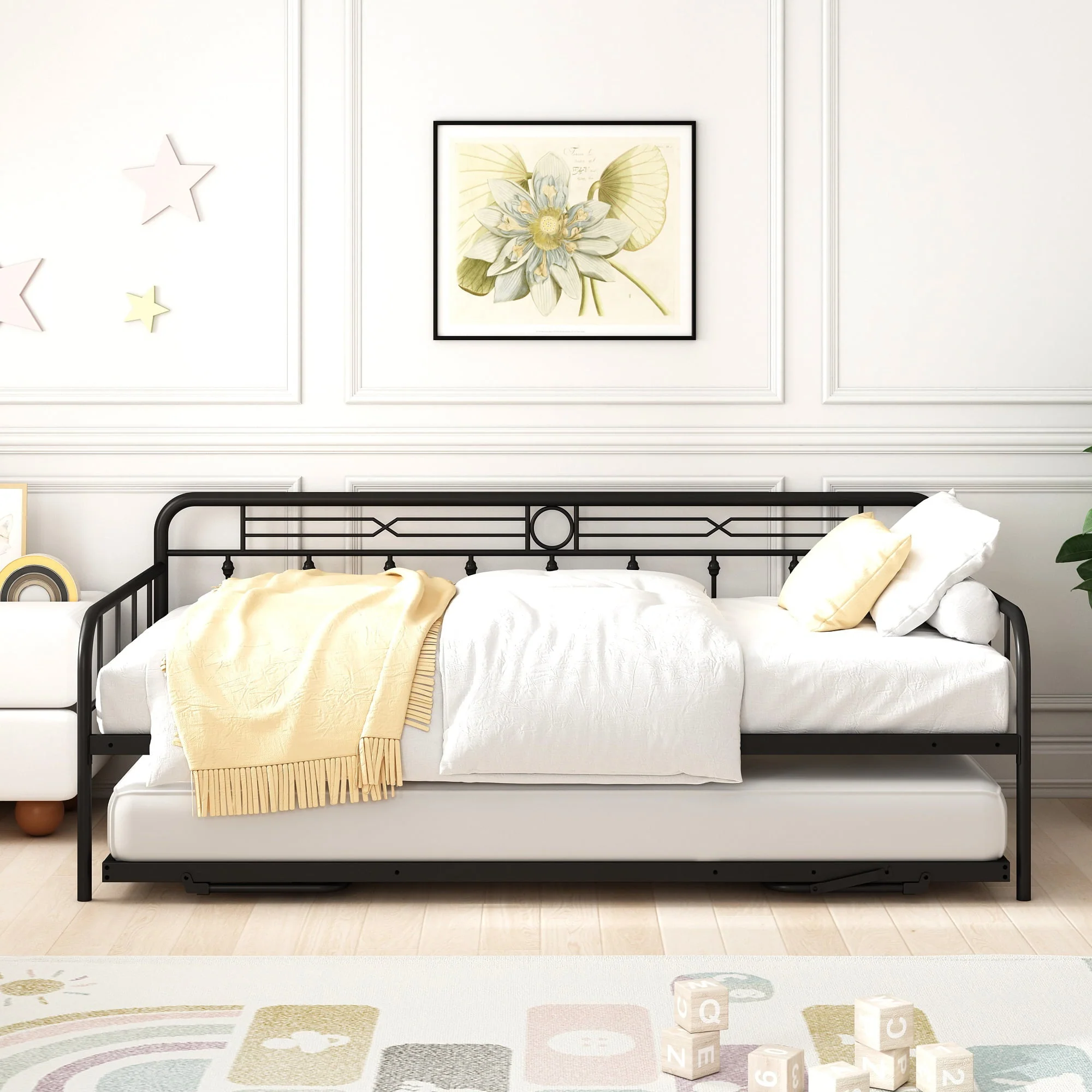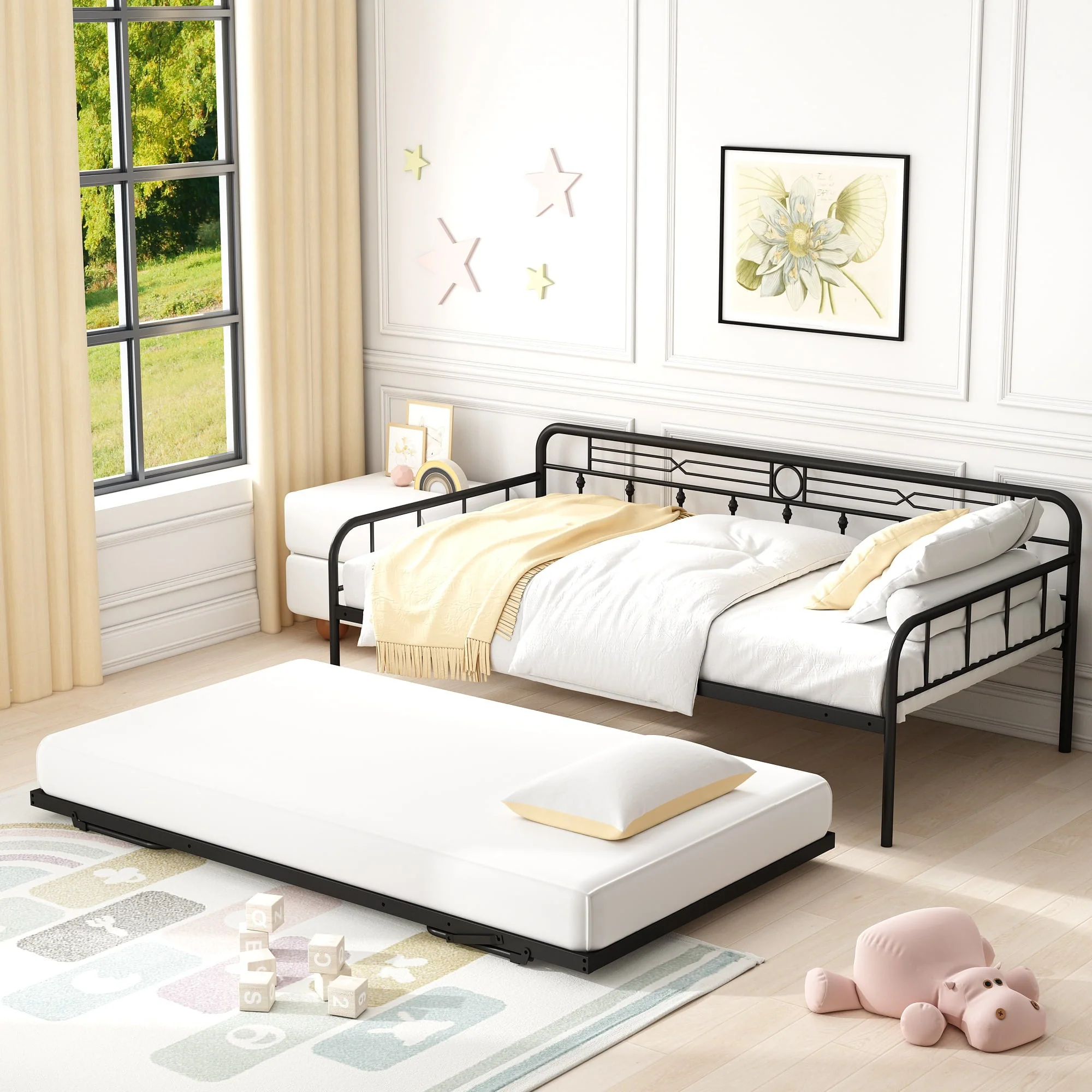 For stability and durability, the surface of this SESSLIFE steel daybed has been processed by powder coating, so it offers a comfortable touch feeling. The pull-down bed with trundle can be stood up and it has the same height as the daybed, in that case, the using area of this daybed would be double. Since the pull-down bed can be used alone, this daybed with a pull-down bed offers a minimum of three using methods for your space. The two different colors allow you to choose the options according to your preference or home style.