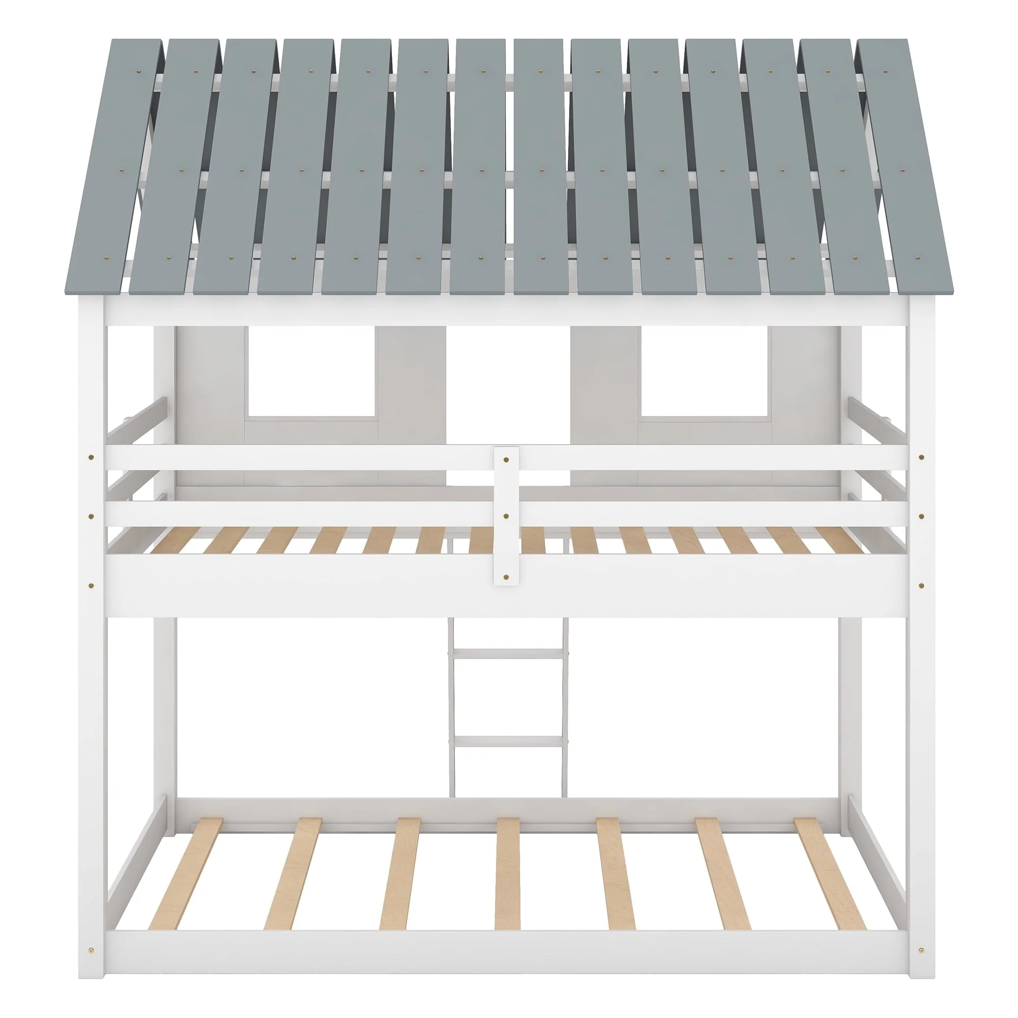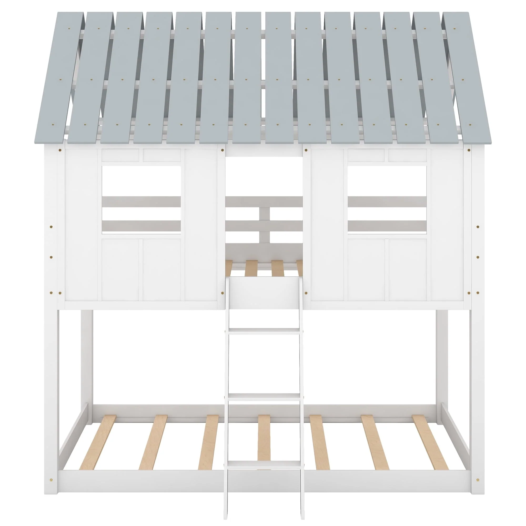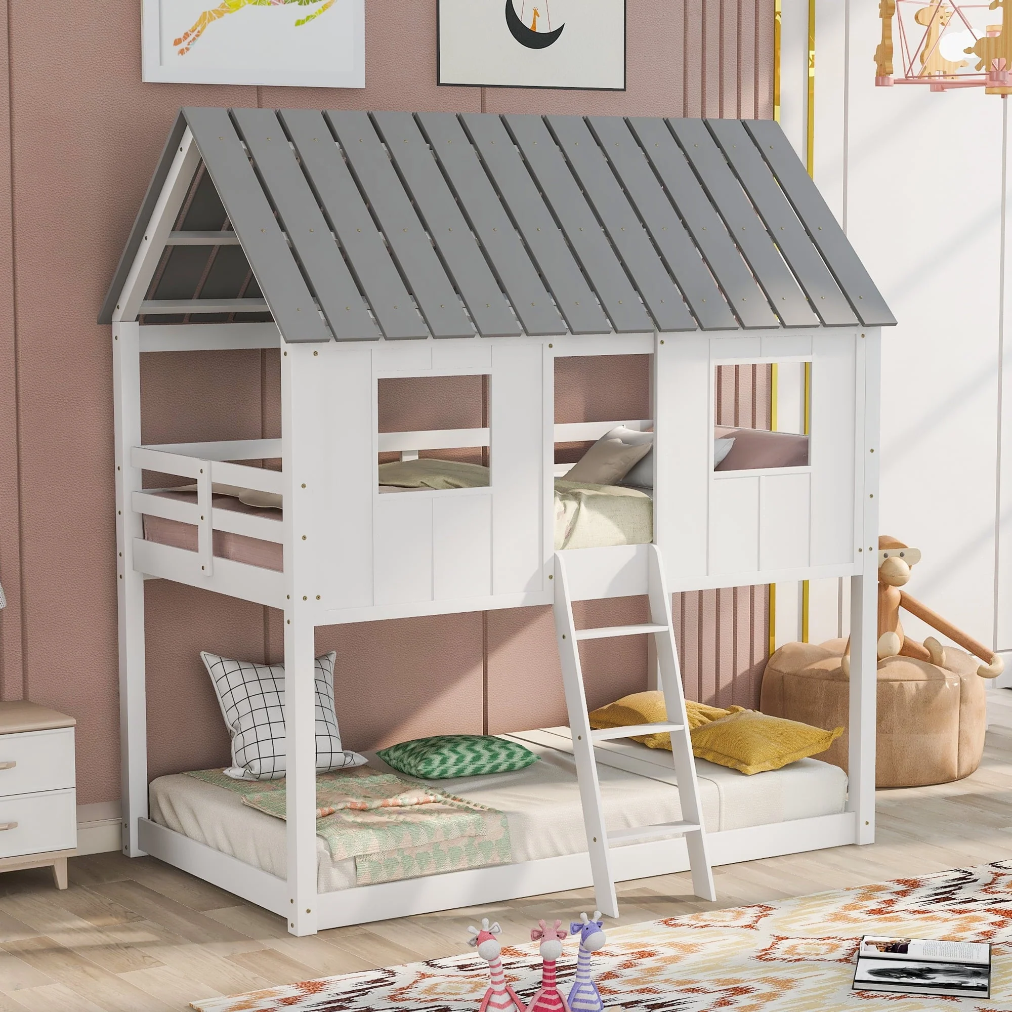Featuring a house-shaped roof and two front windows, this bed doubles as a semi-enclosed play place perfect for kids to explore their imaginations. With guardrail and a sturdy pine frame, this bed offers a safe space for your kids to get a good sleep. Take bed-time with this incredible twin over twin low bunk bed. This is a dream come true for children everywhere, and the bed is sure to transform any room into the ultimate dreamland. The bed features gray roof top with white finish throughout the whole house. The design is novel and fascinating. Indulge your children with this fabulous bed that will make it come alive and thrill them for years to come.