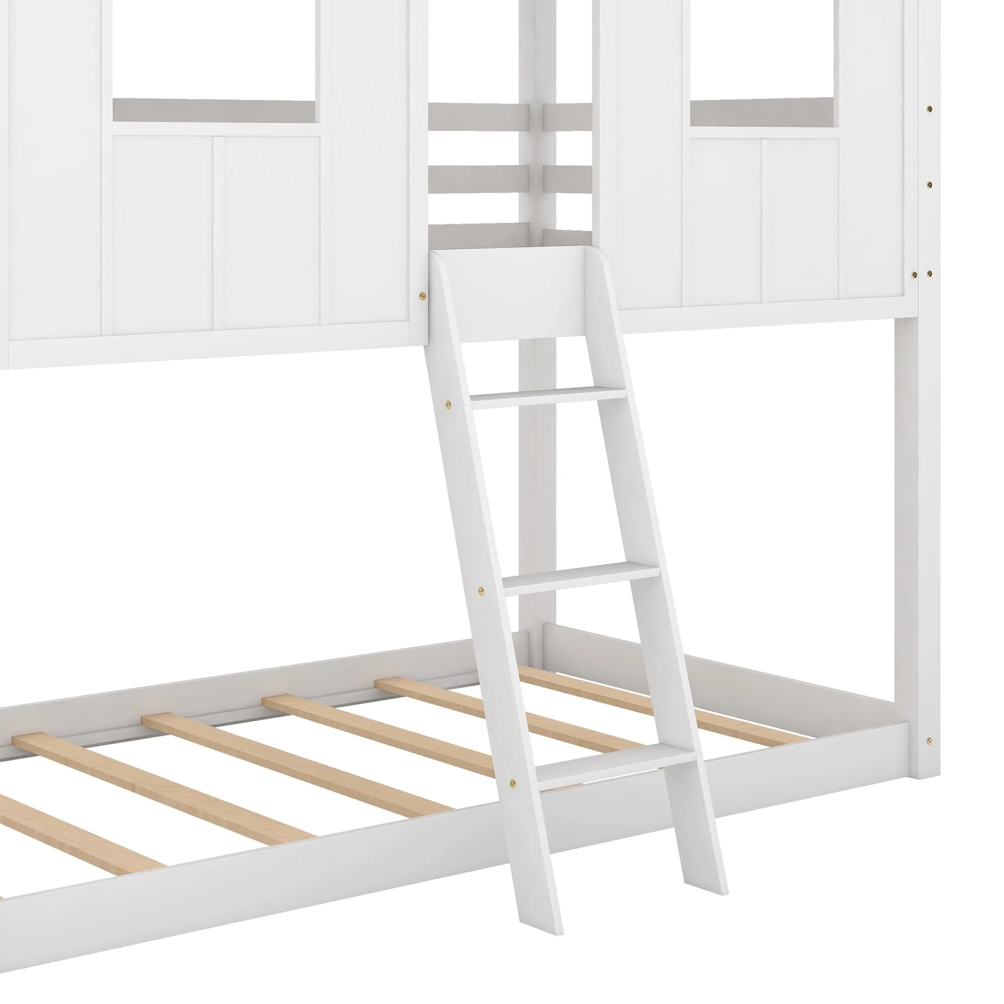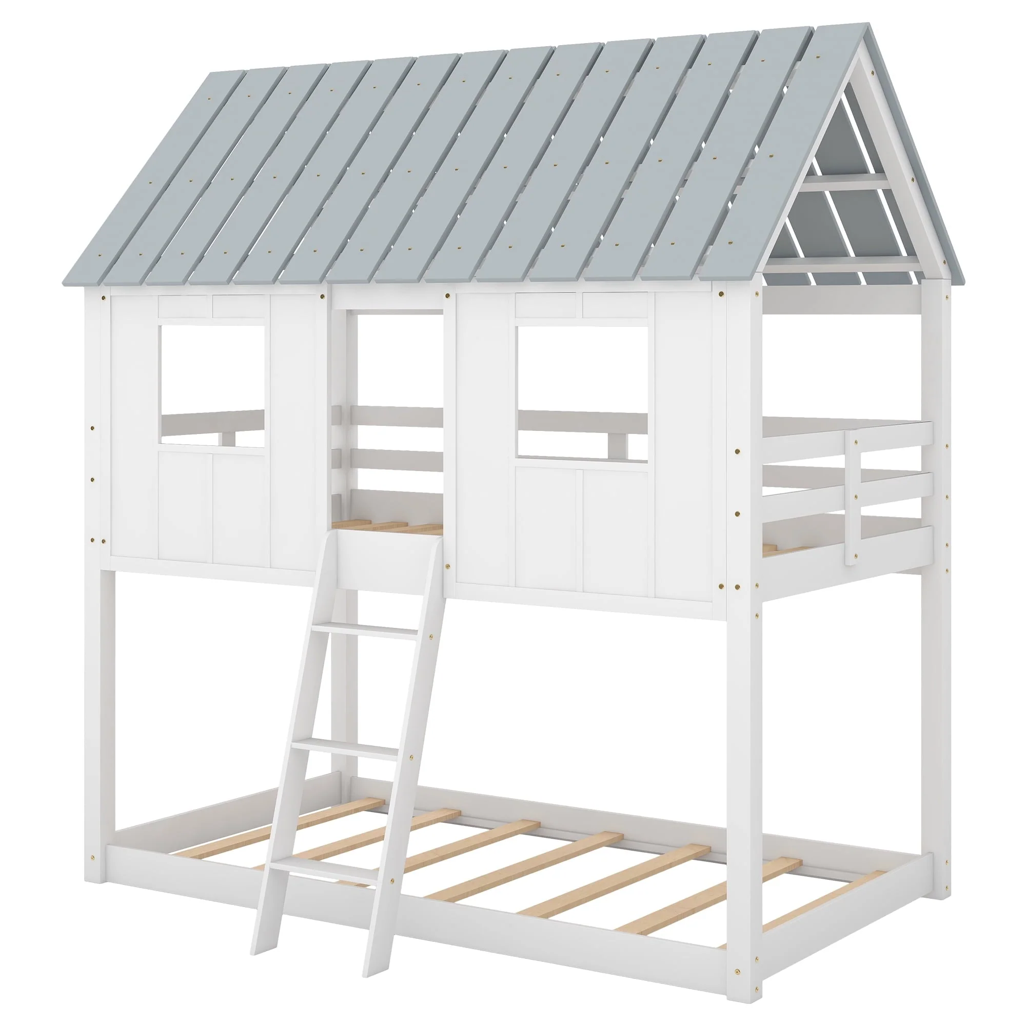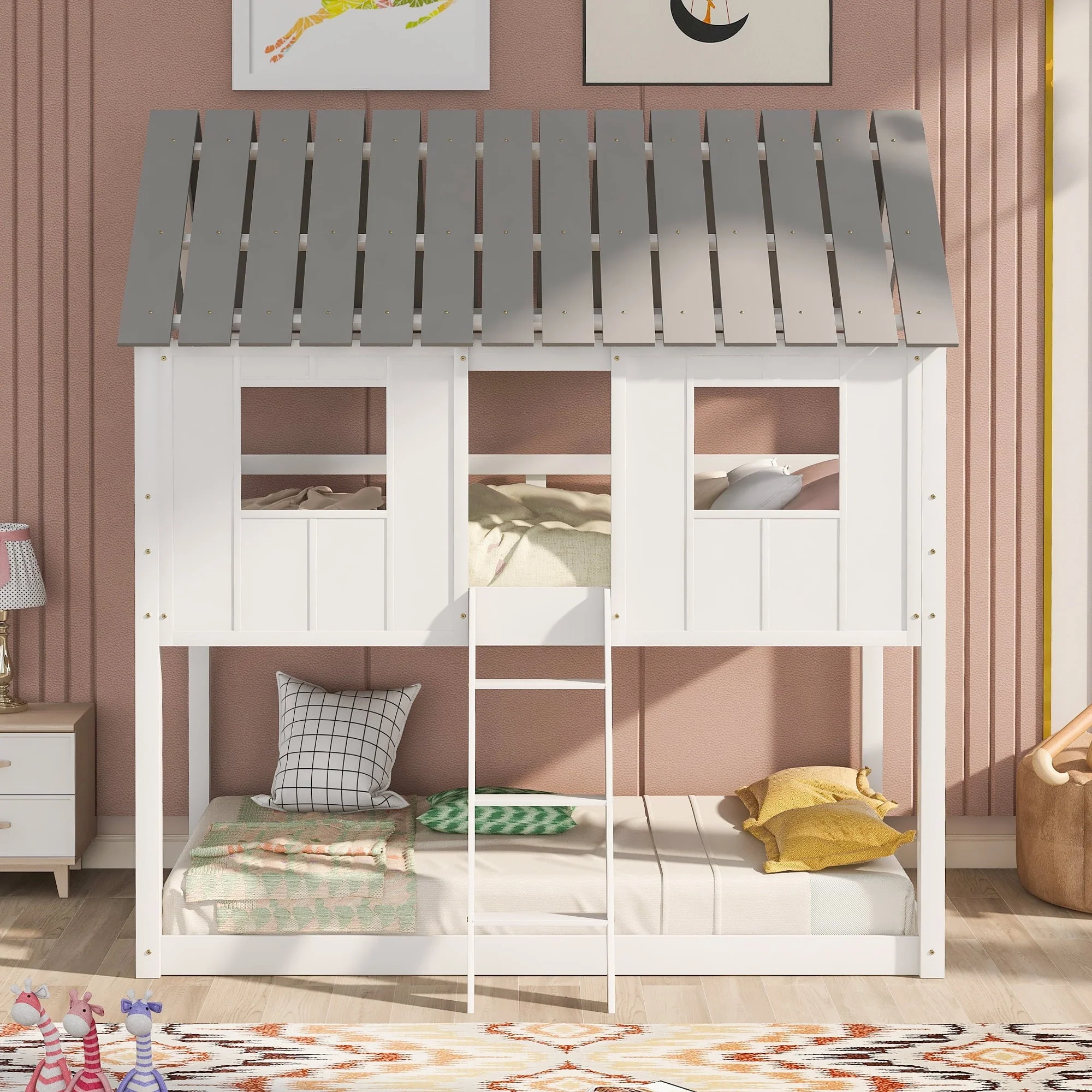 Featuring a house-shaped roof and two front windows, this bed doubles as a semi-enclosed play place perfect for kids to explore their imaginations. With guardrail and a sturdy pine frame, this bed offers a safe space for your kids to get a good sleep. Take bed-time with this incredible twin over twin low bunk bed. This is a dream come true for children everywhere, and the bed is sure to transform any room into the ultimate dreamland. The bed features gray roof top with white finish throughout the whole house. The design is novel and fascinating. Indulge your children with this fabulous bed that will make it come alive and thrill them for years to come.