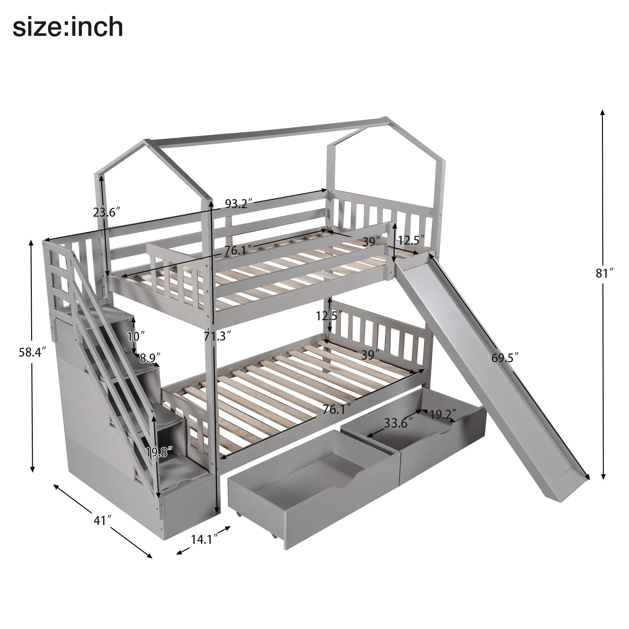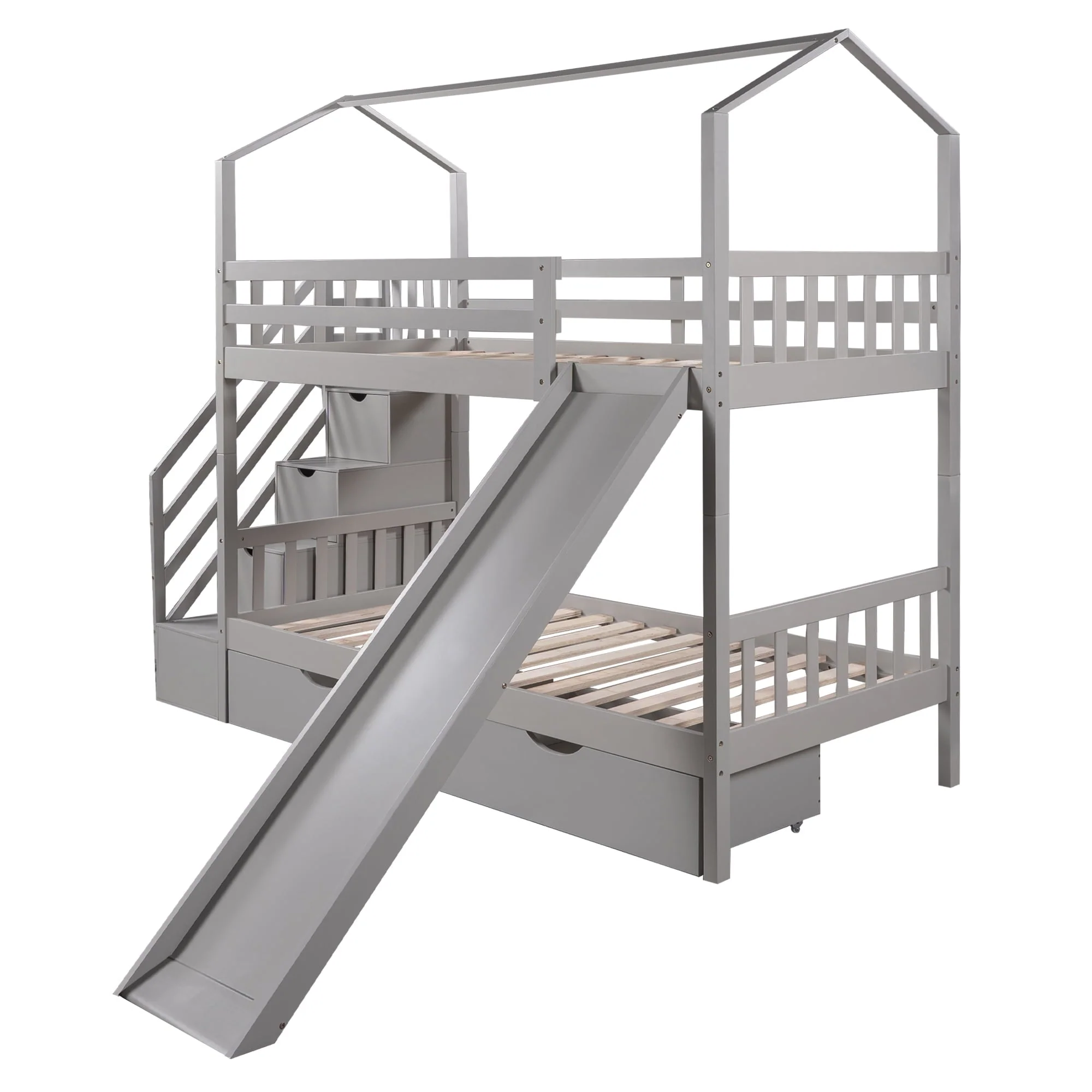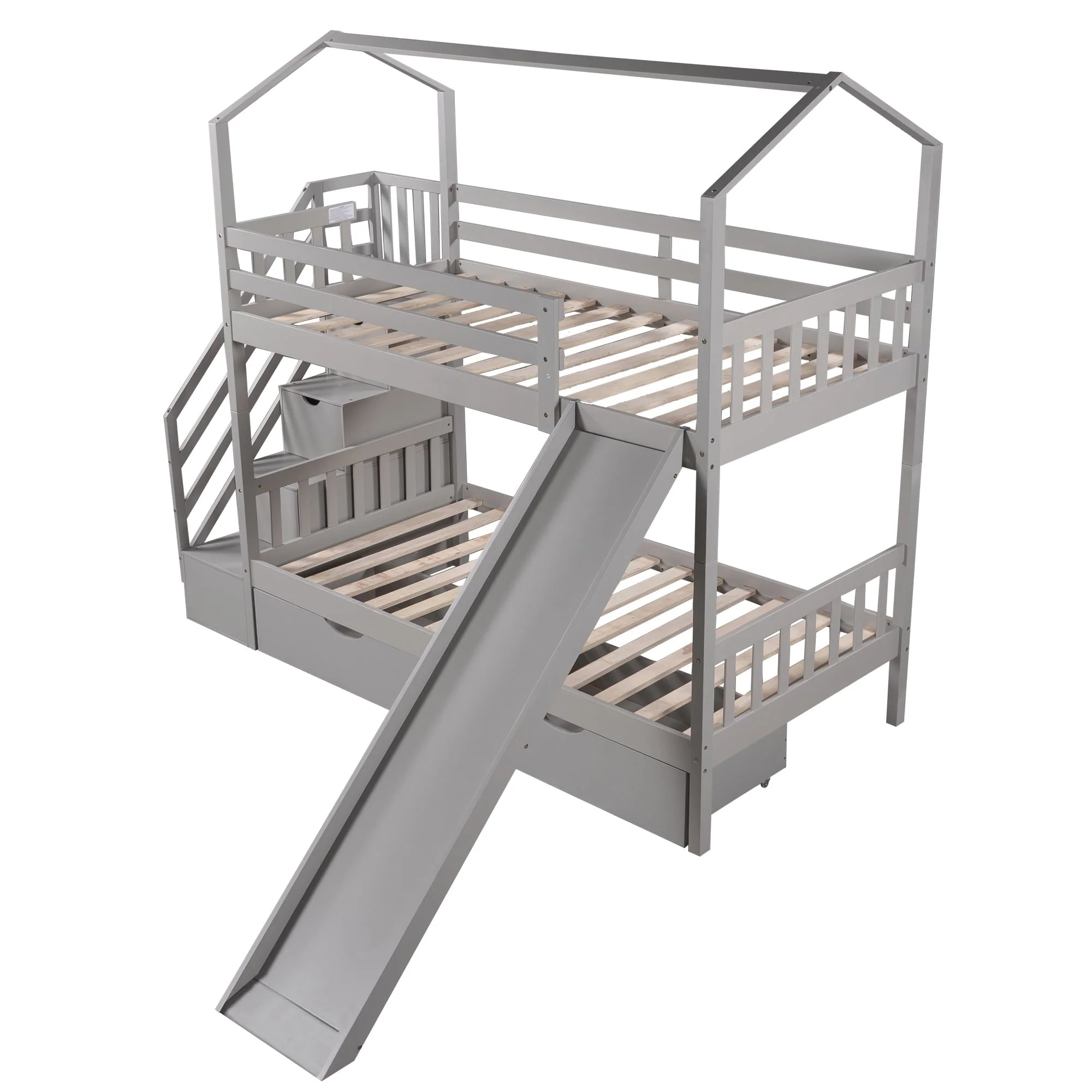 Perfect for hours of entertainment and relaxation,our bunk bed twin over twin the perfect centerpiece for any child’s bedroom.This house bunk bed comes with a smooth slide, bringing extra fun for your kid’s bedroom.In addition,there are 3 compartments hide underneath the stairs of this bunk bed and two drawers underneath the bed which are perfect for you to store quilts,bed sheets,or your little ones’ toys. It is made of solid pine and MDF with a neutral finish of your choice.Sturdy enough,suitable for boys and girls,without squeaking and sliding sound,ideal for any living environments,like children’s bedrooms, dorms,universities,residential treatment facilities,and bunkhouses. This twin size house bunk bed combining entertainment and practicality,perfect for families with 2 kids!