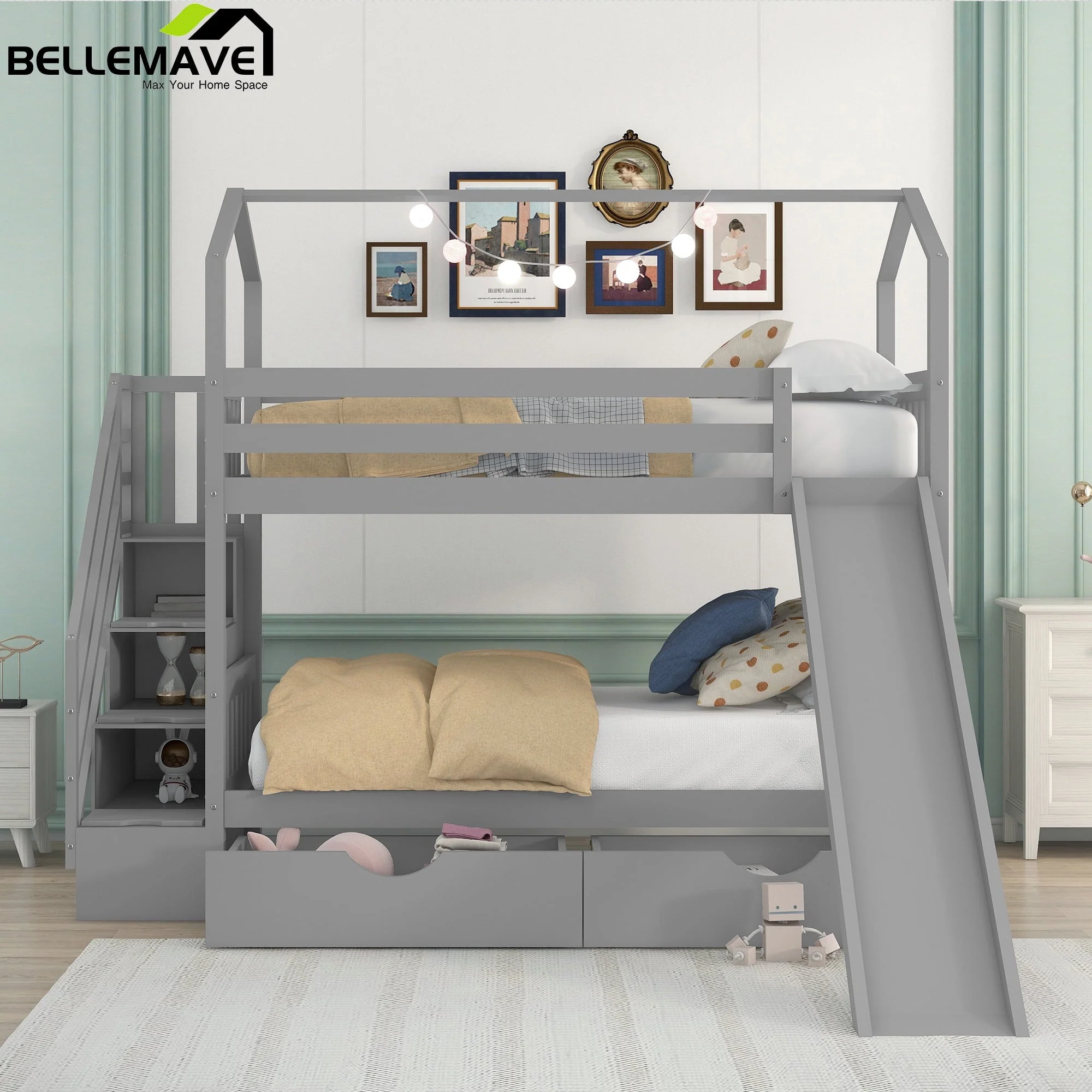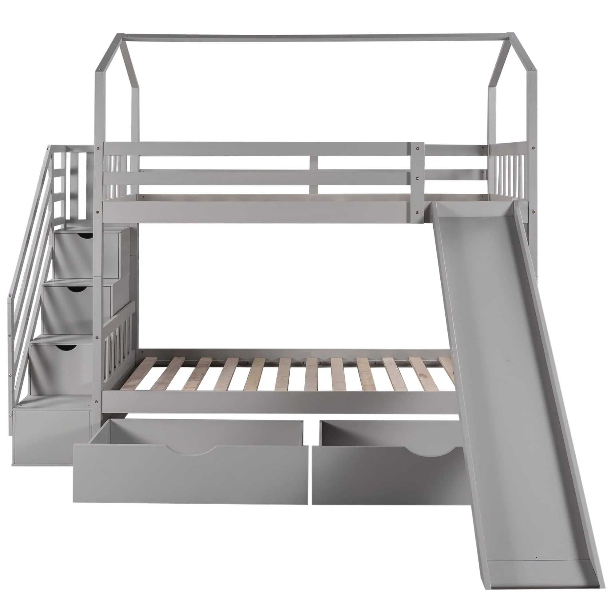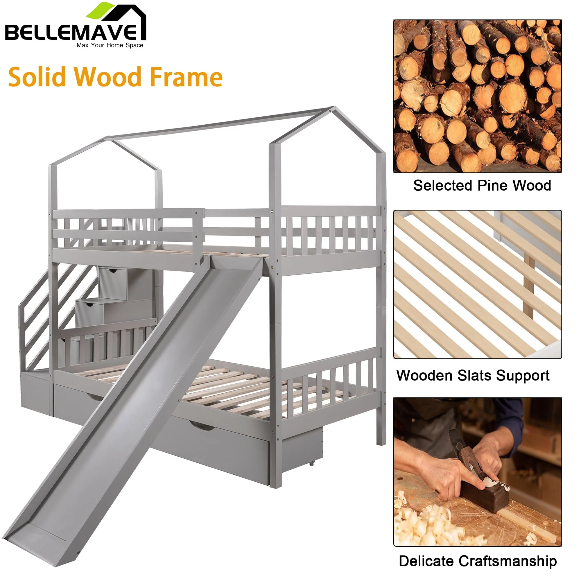 Perfect for hours of entertainment and relaxation,our bunk bed twin over twin the perfect centerpiece for any child’s bedroom.This house bunk bed comes with a smooth slide, bringing extra fun for your kid’s bedroom.In addition,there are 3 compartments hide underneath the stairs of this bunk bed and two drawers underneath the bed which are perfect for you to store quilts,bed sheets,or your little ones’ toys. It is made of solid pine and MDF with a neutral finish of your choice.Sturdy enough,suitable for boys and girls,without squeaking and sliding sound,ideal for any living environments,like children’s bedrooms, dorms,universities,residential treatment facilities,and bunkhouses. This twin size house bunk bed combining entertainment and practicality,perfect for families with 2 kids!