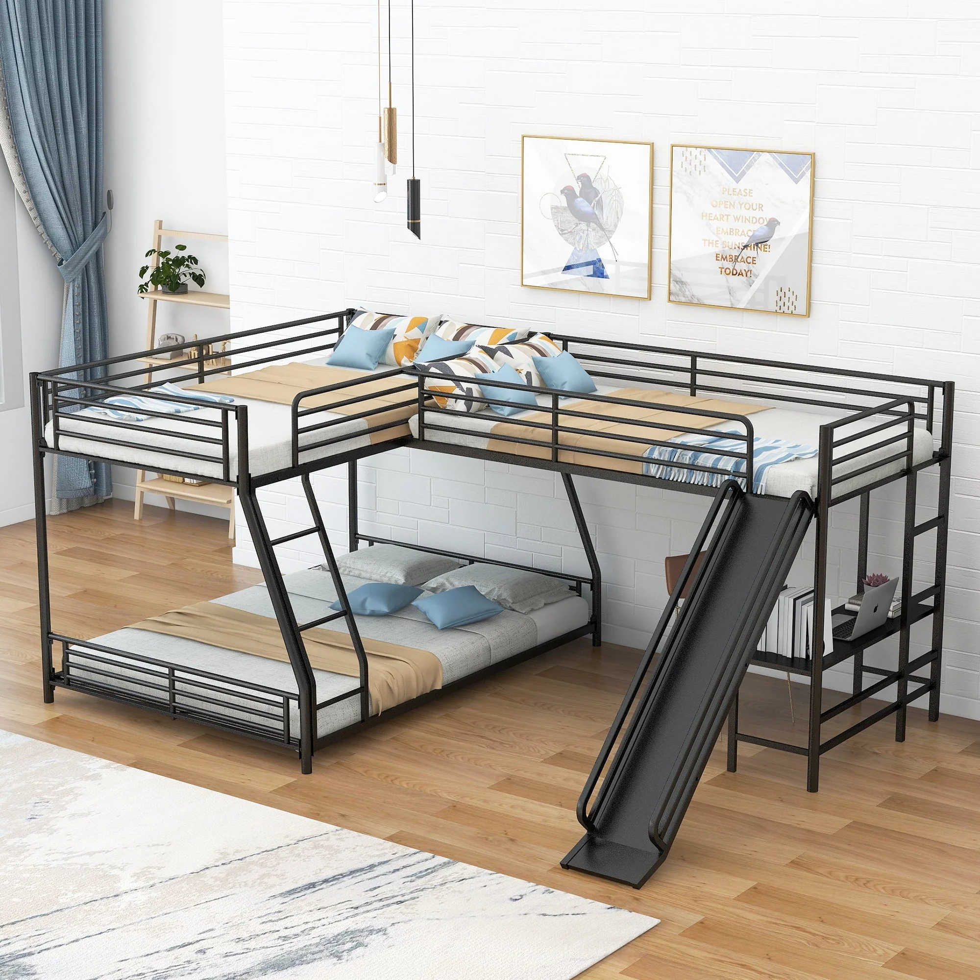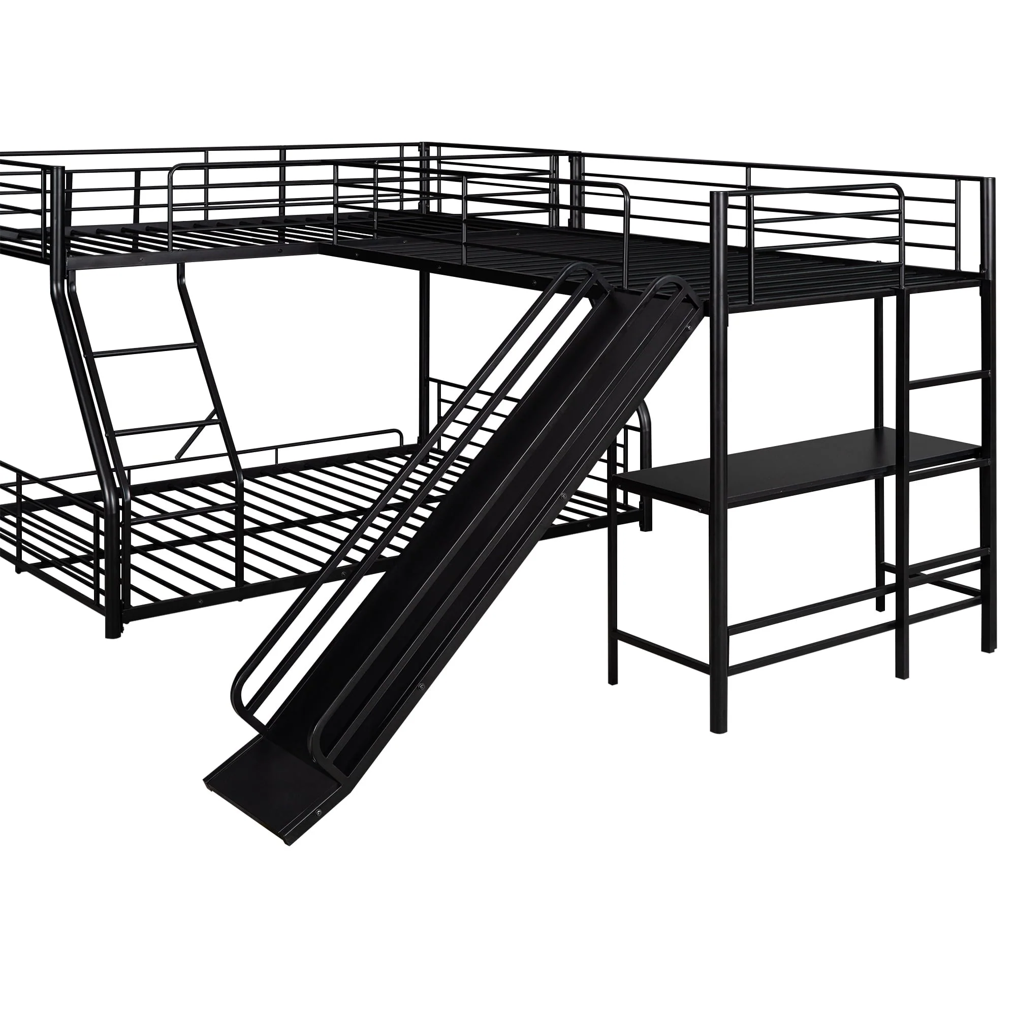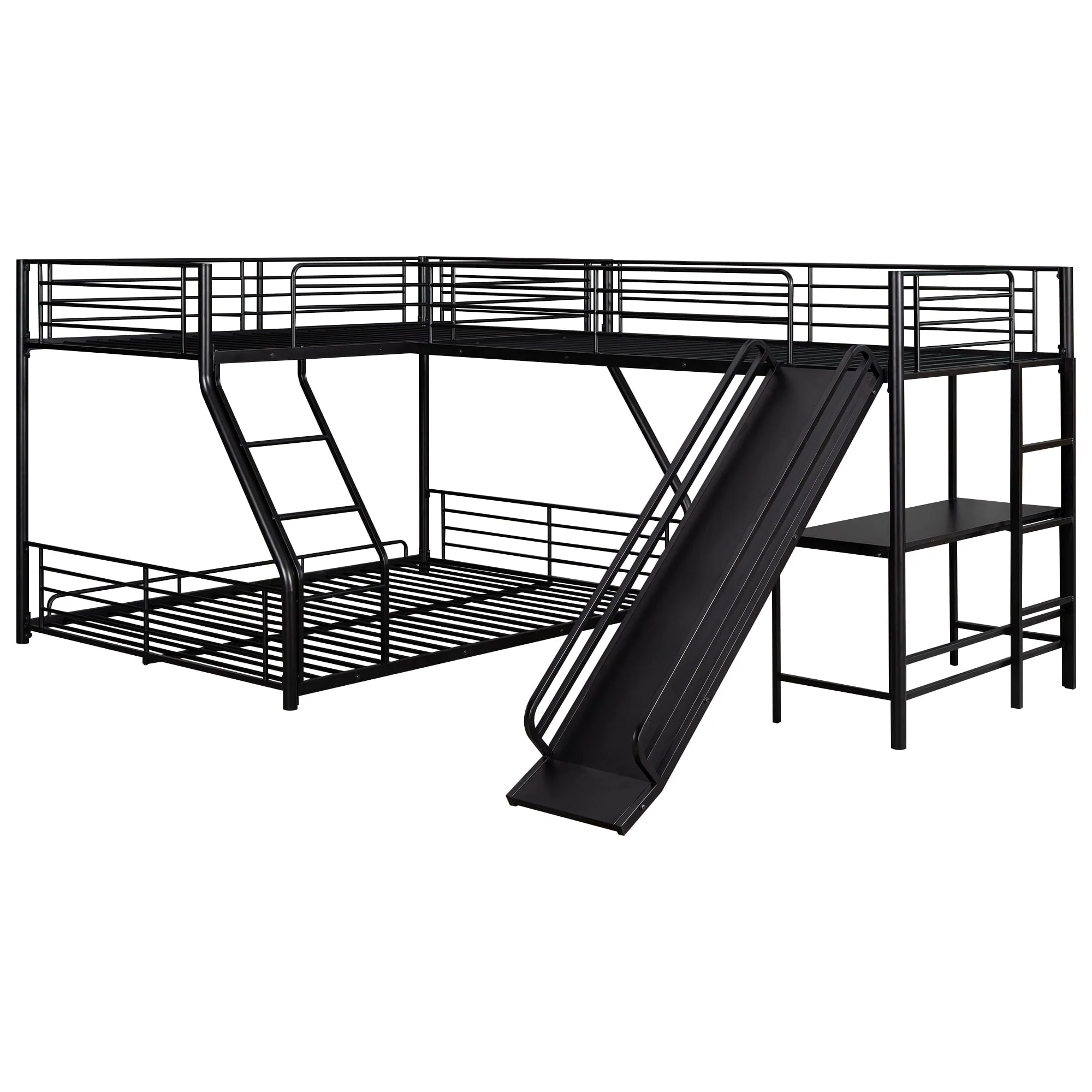 This is a versatile, mission style bunk bed. Metal made, this bunk bed is stylish and durable enough for more kids. Equipped with a twin over full bunk bed and a twin size loft bed, this 3 in one l-shaped bed is perfect for your family, sleepovers or your extra guest sleeping at your lake house getaway. Built in desk and slide can provide your child with studying place and playground for rest. There are two ladders for your kids to enter the upper bed. High-quality, solid metal legs and a strong, durable frame ensure stability and durability for long-term use.
