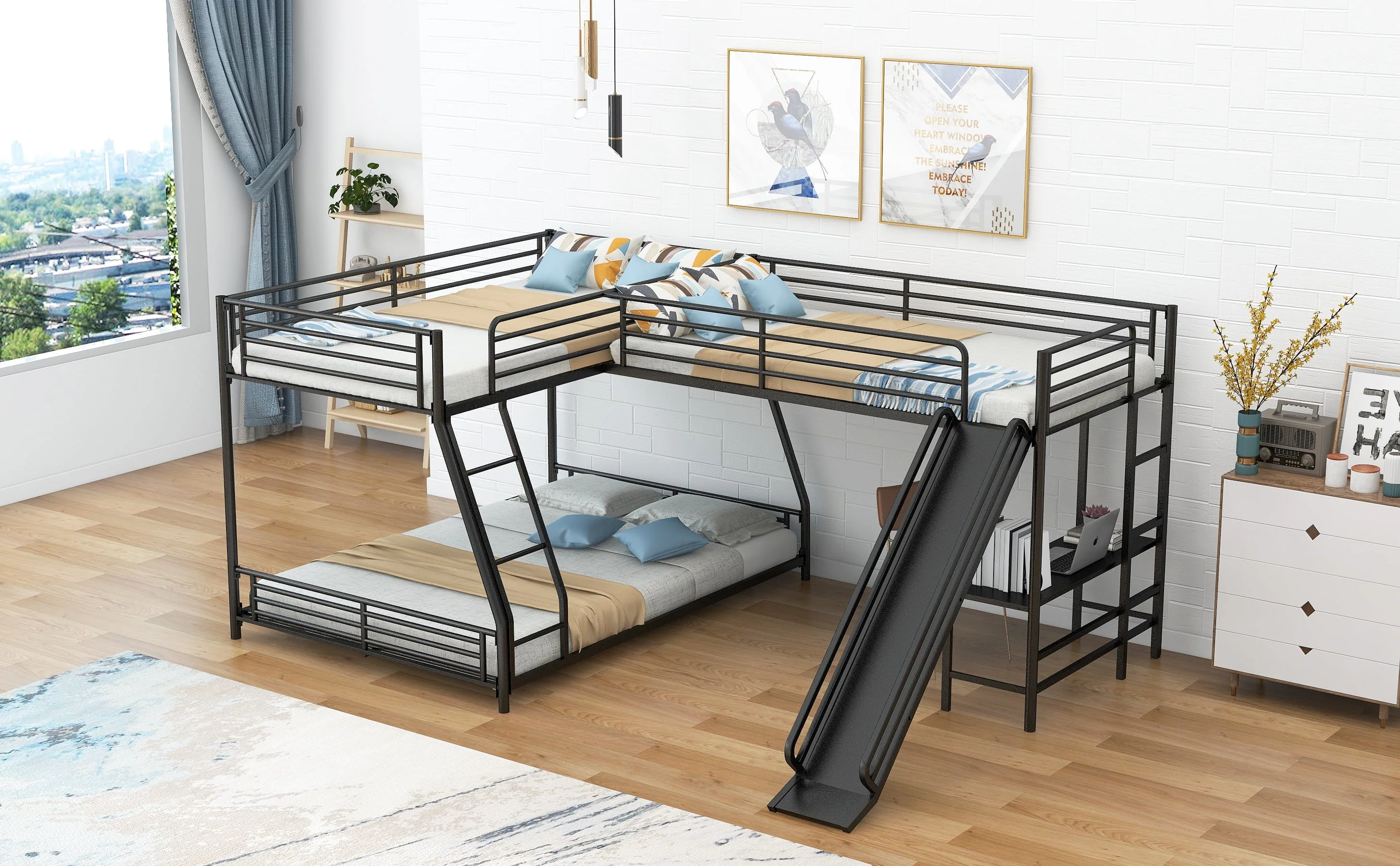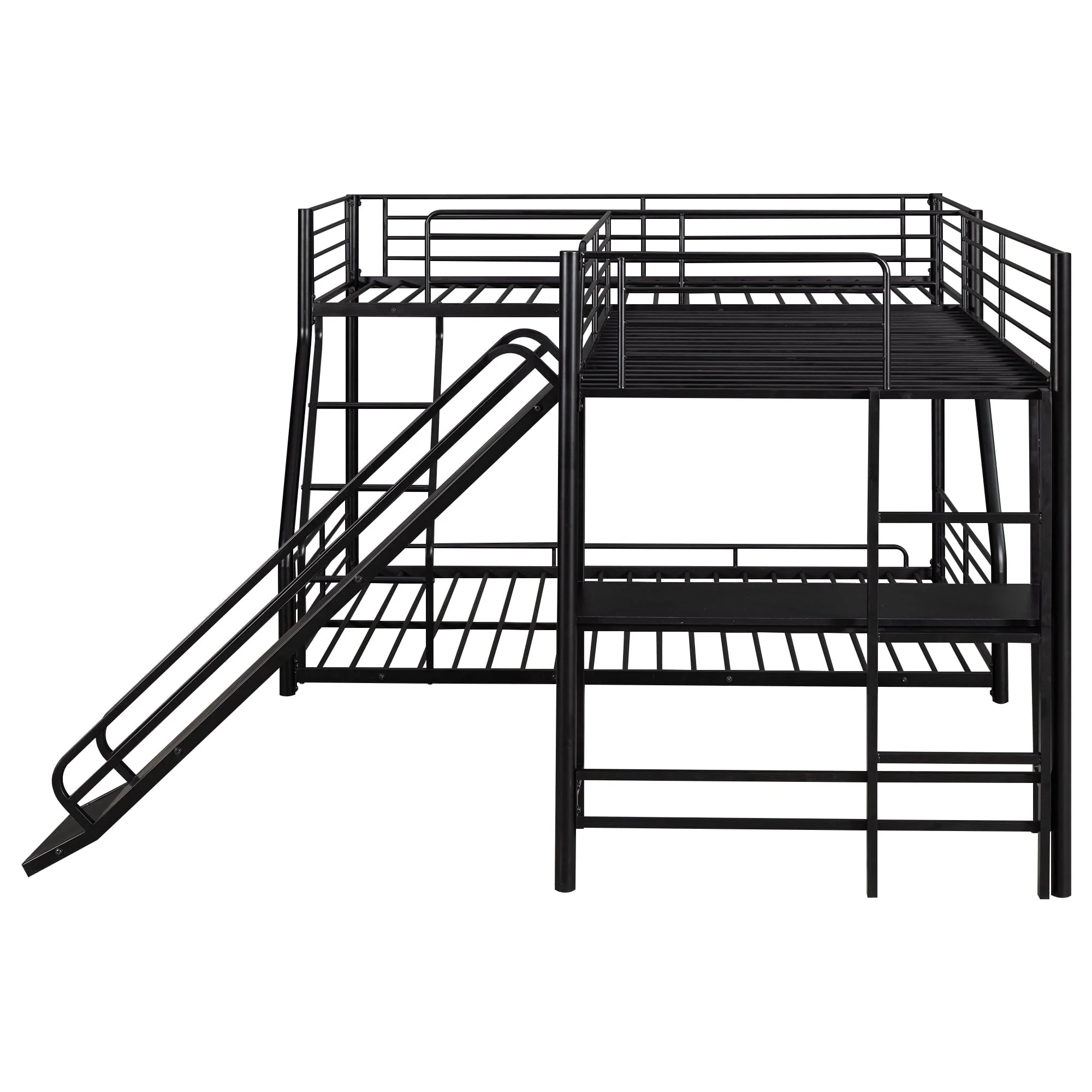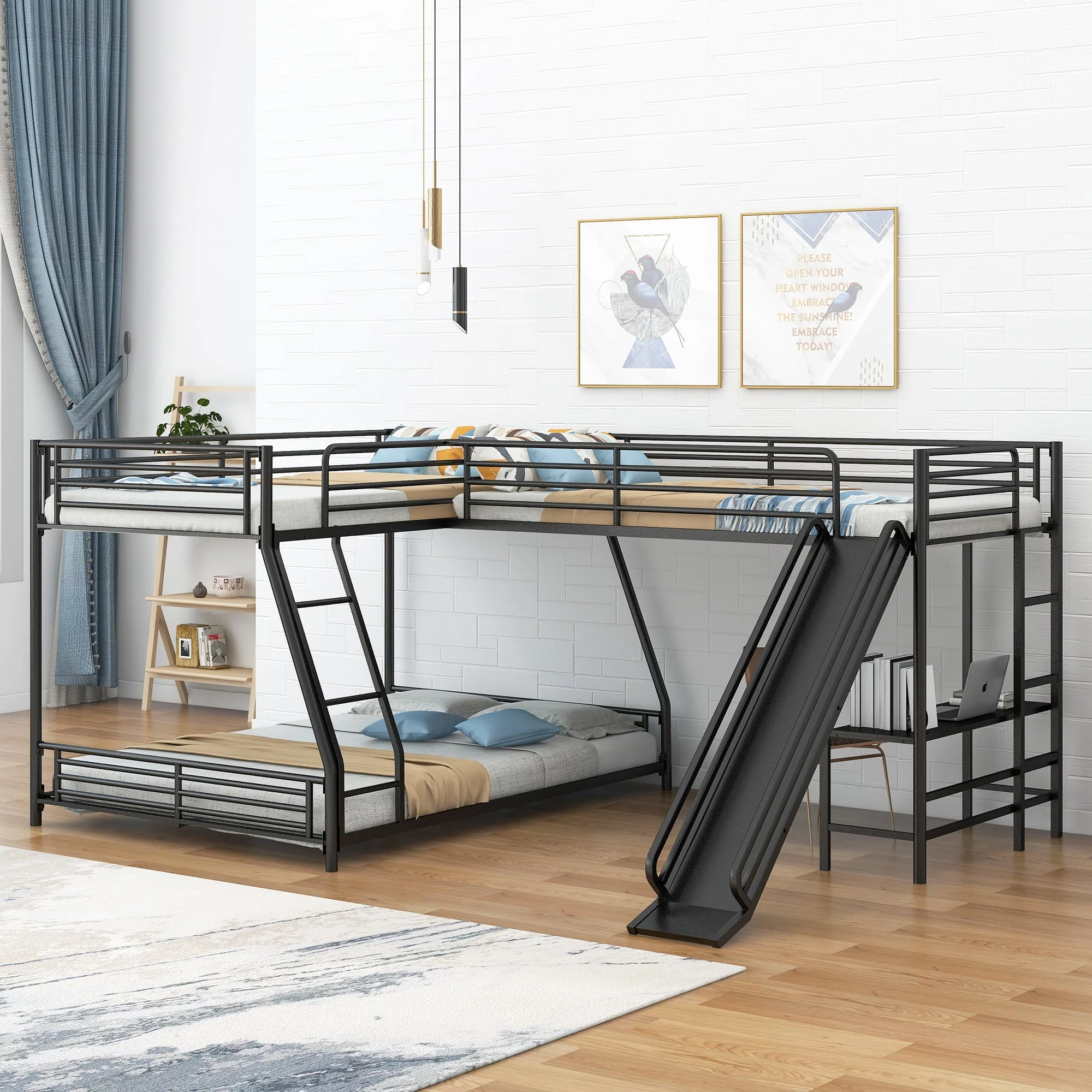 This is a versatile, mission style bunk bed. Metal made, this bunk bed is stylish and durable enough for more kids. Equipped with a twin over full bunk bed and a twin size loft bed, this 3 in one l-shaped bed is perfect for your family, sleepovers or your extra guest sleeping at your lake house getaway. Built in desk and slide can provide your child with studying place and playground for rest. There are two ladders for your kids to enter the upper bed. High-quality, solid metal legs and a strong, durable frame ensure stability and durability for long-term use.