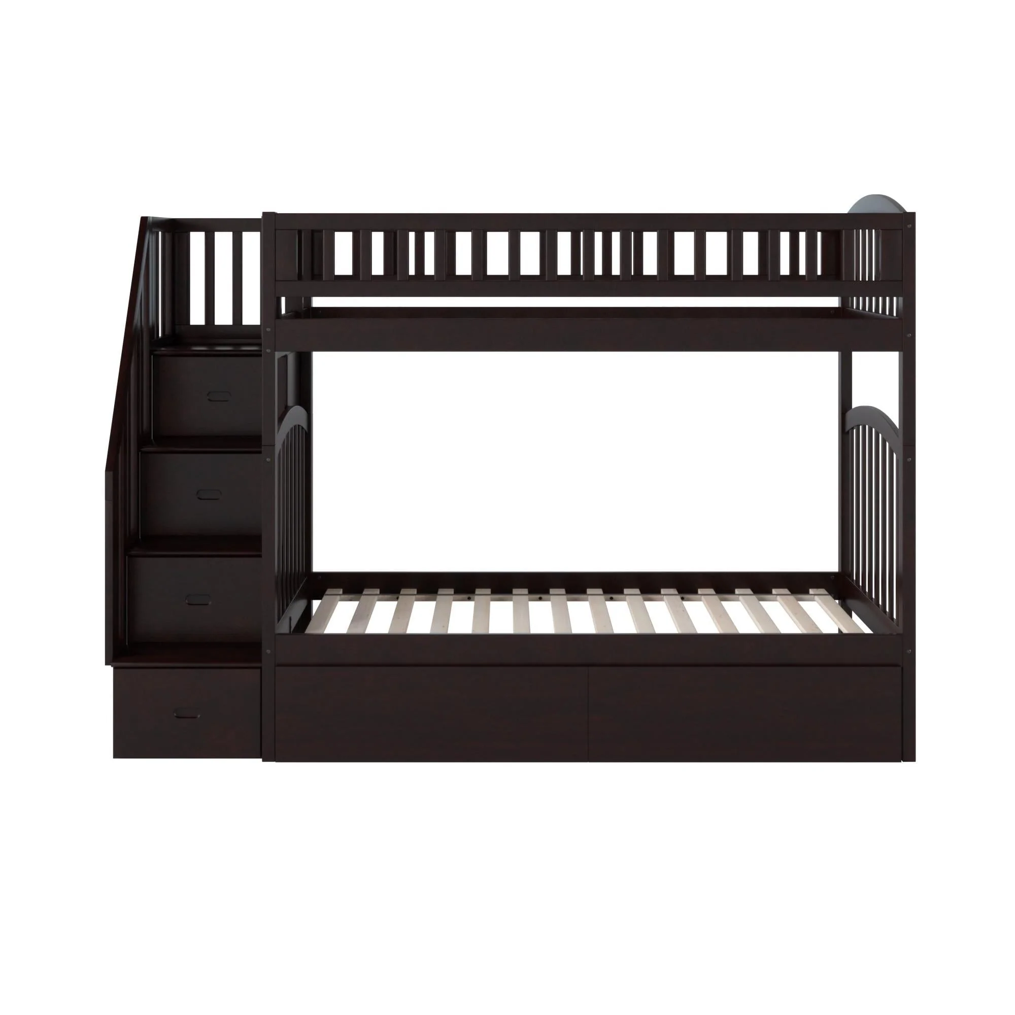There is no shortage of storage options with the Westbrook Staircase Bunk. The staircase features three rectangular bookshelves while the four steps double as storage drawers. With two spacious, under bed drawers as a bonus, there will never be an excuse for a messy room again! The five-step finishing process leaves the bunk with a smooth, satin finish and rich color while durable and eco-friendly hardwood ensures safety for you and the environment. Still need more storage? These beds can accommodate up to four drawers with additional sets sold separately.