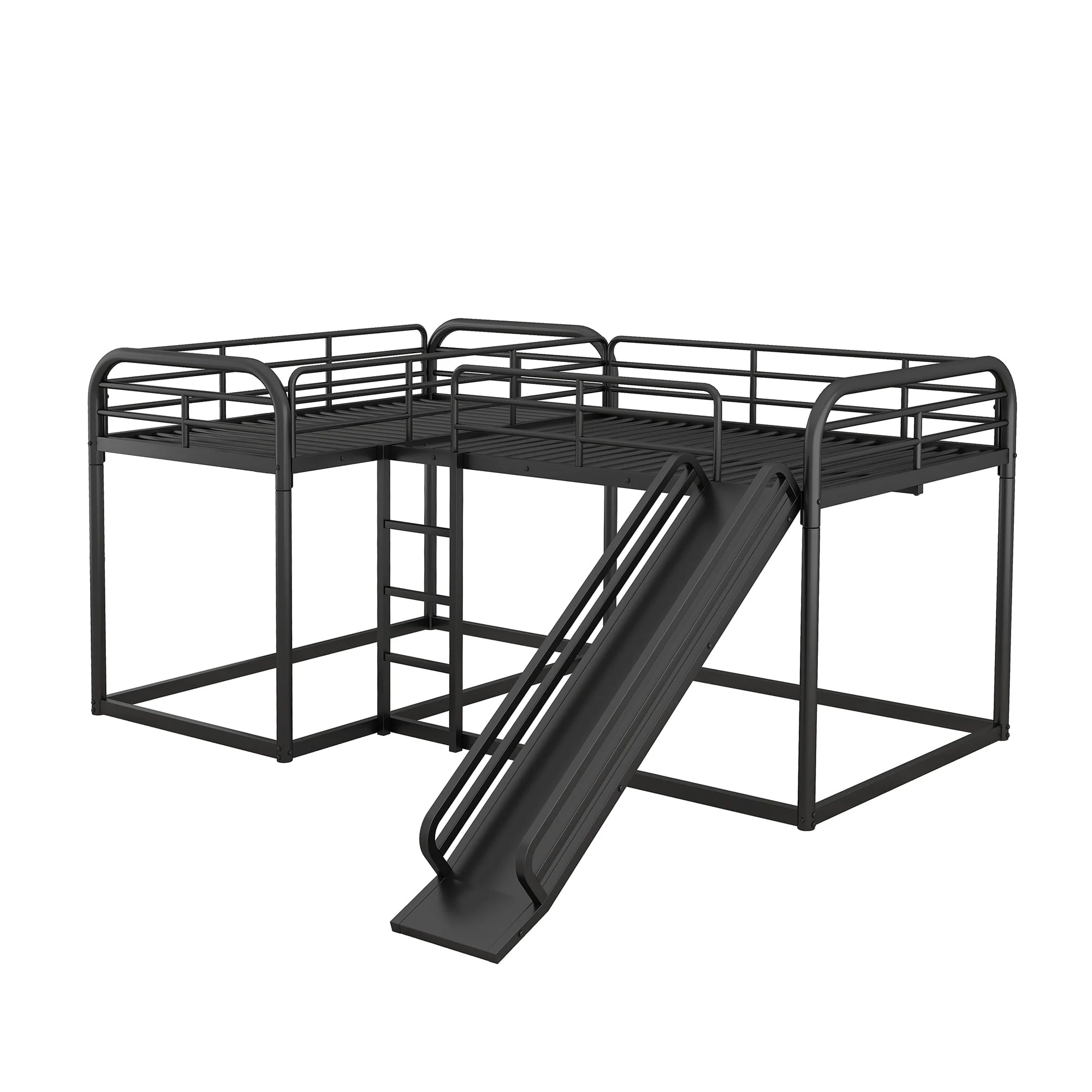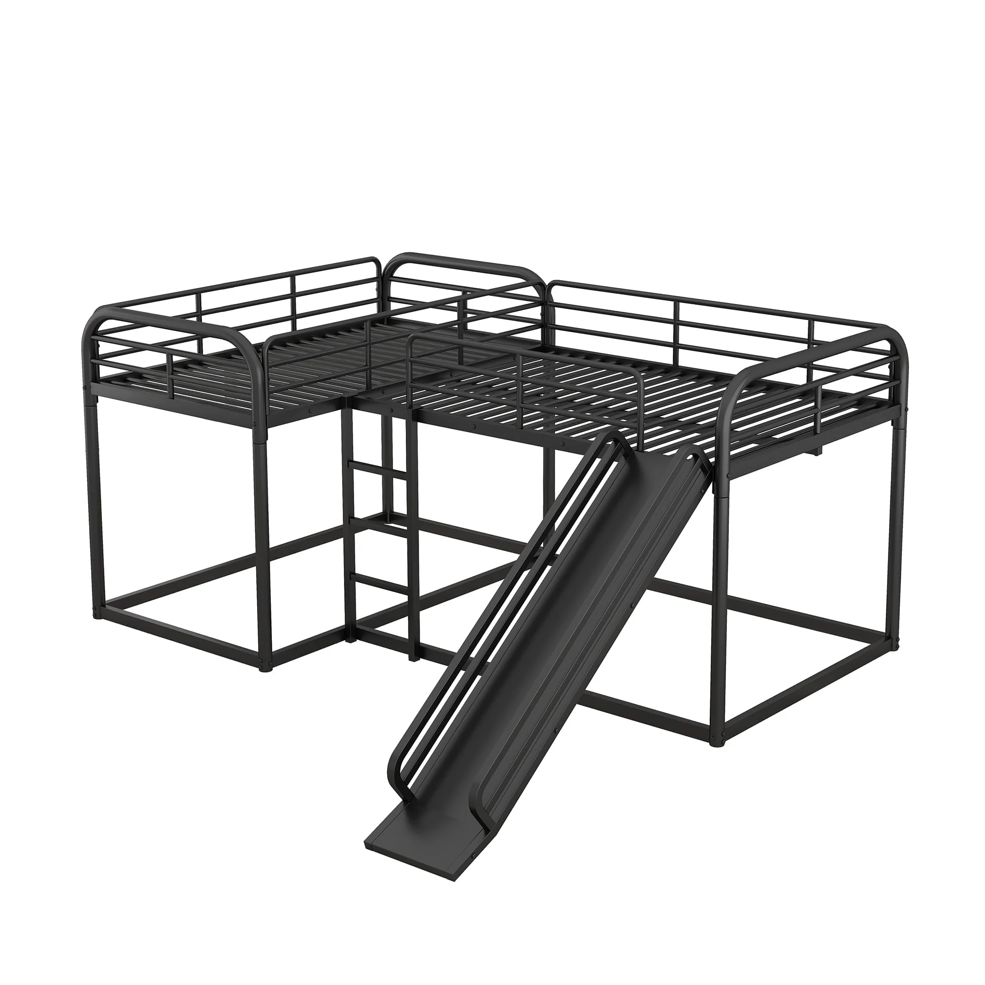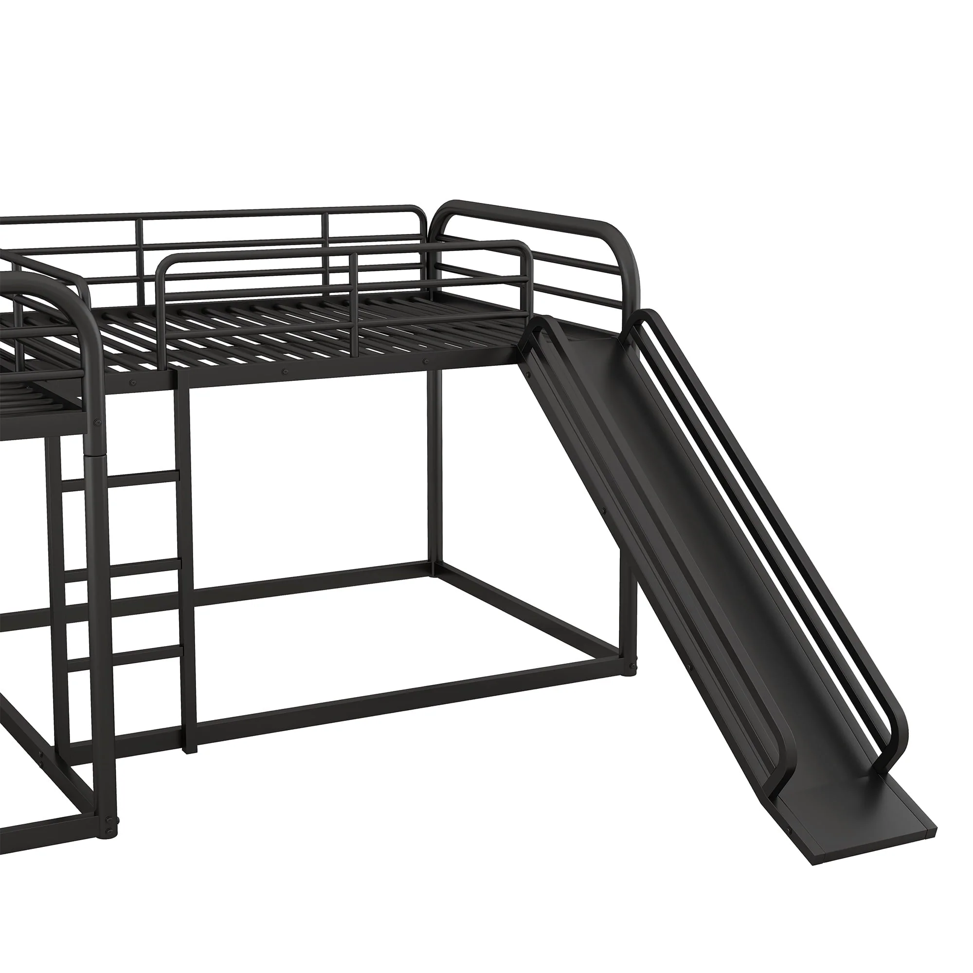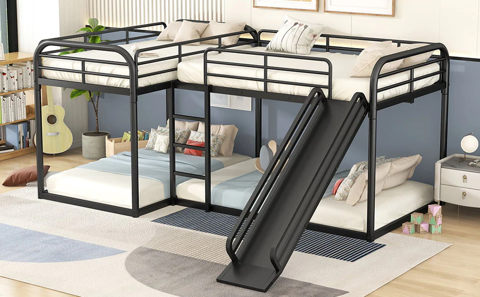 Our metal l-shaped quadruple bunk bed is a versatile, mission style bunk bed for kids. Constructed of solid metal, these beds are both stylish and durable. This bunk bed with slide is perfect for your family, sleepovers or your extra guest sleeping at your lake house getaway. High-quality, solid metal legs and a strong, durable frame ensures stability and durability for long-term use. This twin and full size bunk bed is designed with a clean silhouette and a hue of elegance. It suits all styles of home decorations, and completes the look of any bedroom. Attached slide and ladder will provide easy and safe access to the upper bunk.