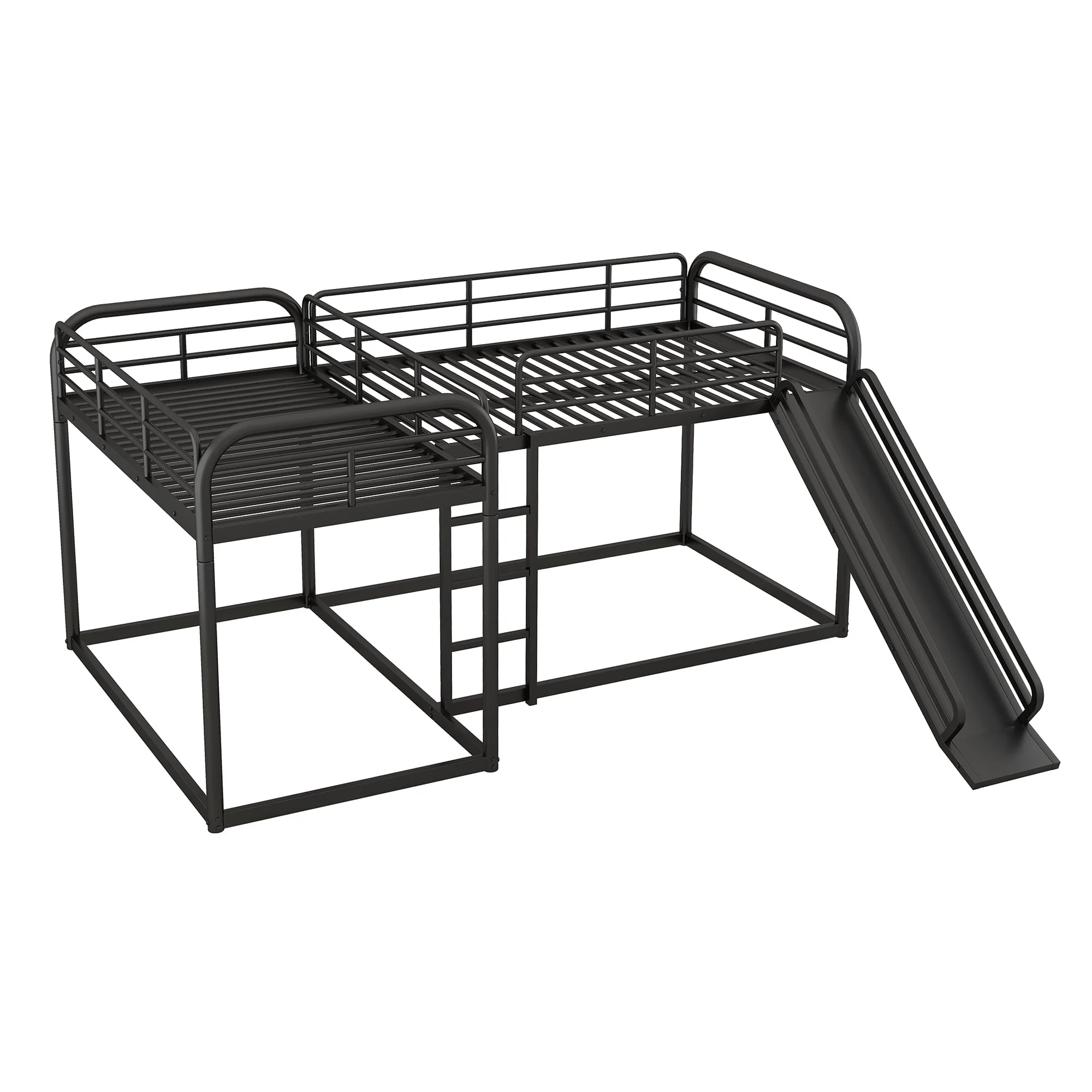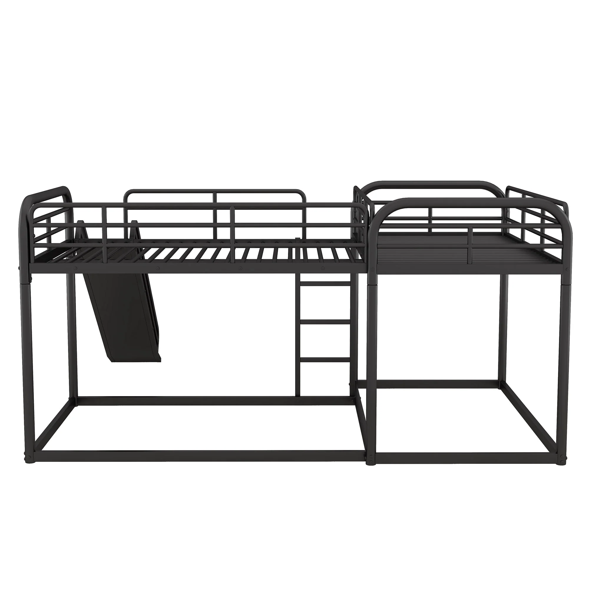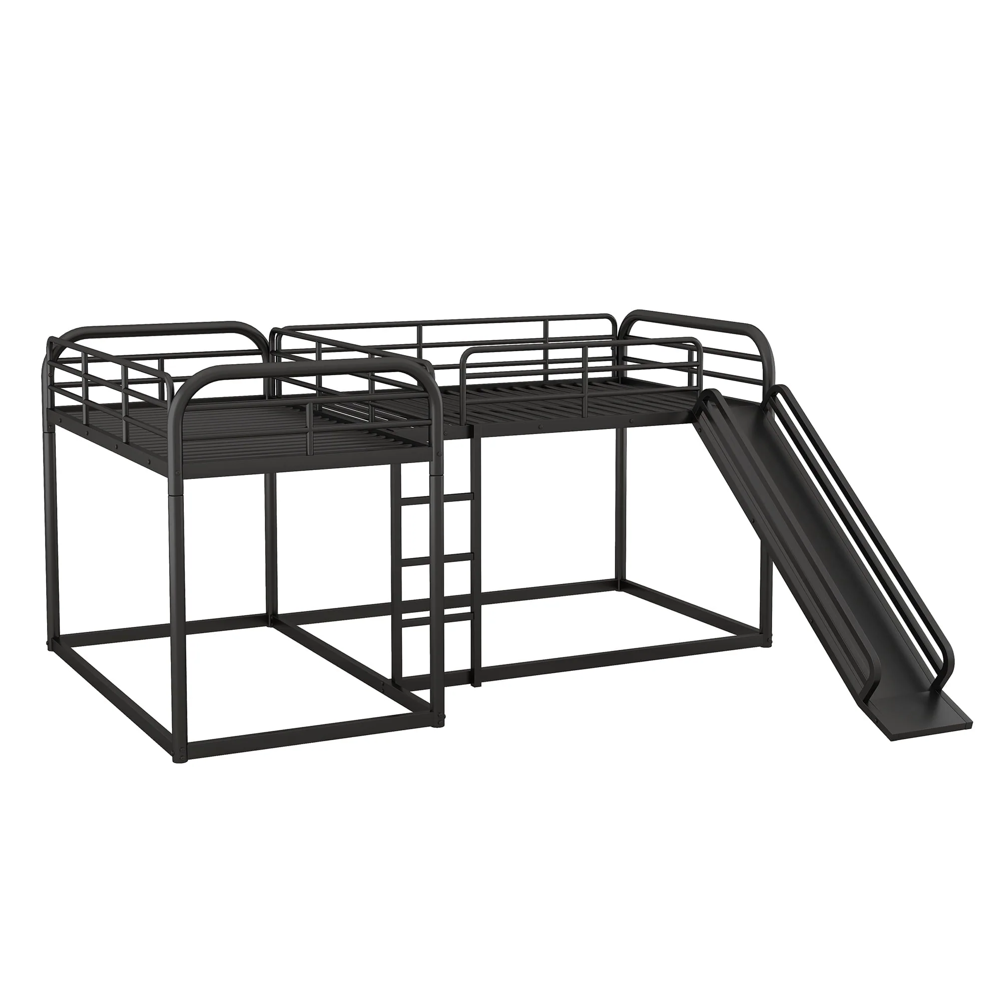 Our metal l-shaped quadruple bunk bed is a versatile, mission style bunk bed for kids. Constructed of solid metal, these beds are both stylish and durable. This bunk bed with slide is perfect for your family, sleepovers or your extra guest sleeping at your lake house getaway. High-quality, solid metal legs and a strong, durable frame ensures stability and durability for long-term use. This twin and full size bunk bed is designed with a clean silhouette and a hue of elegance. It suits all styles of home decorations, and completes the look of any bedroom. Attached slide and ladder will provide easy and safe access to the upper bunk.