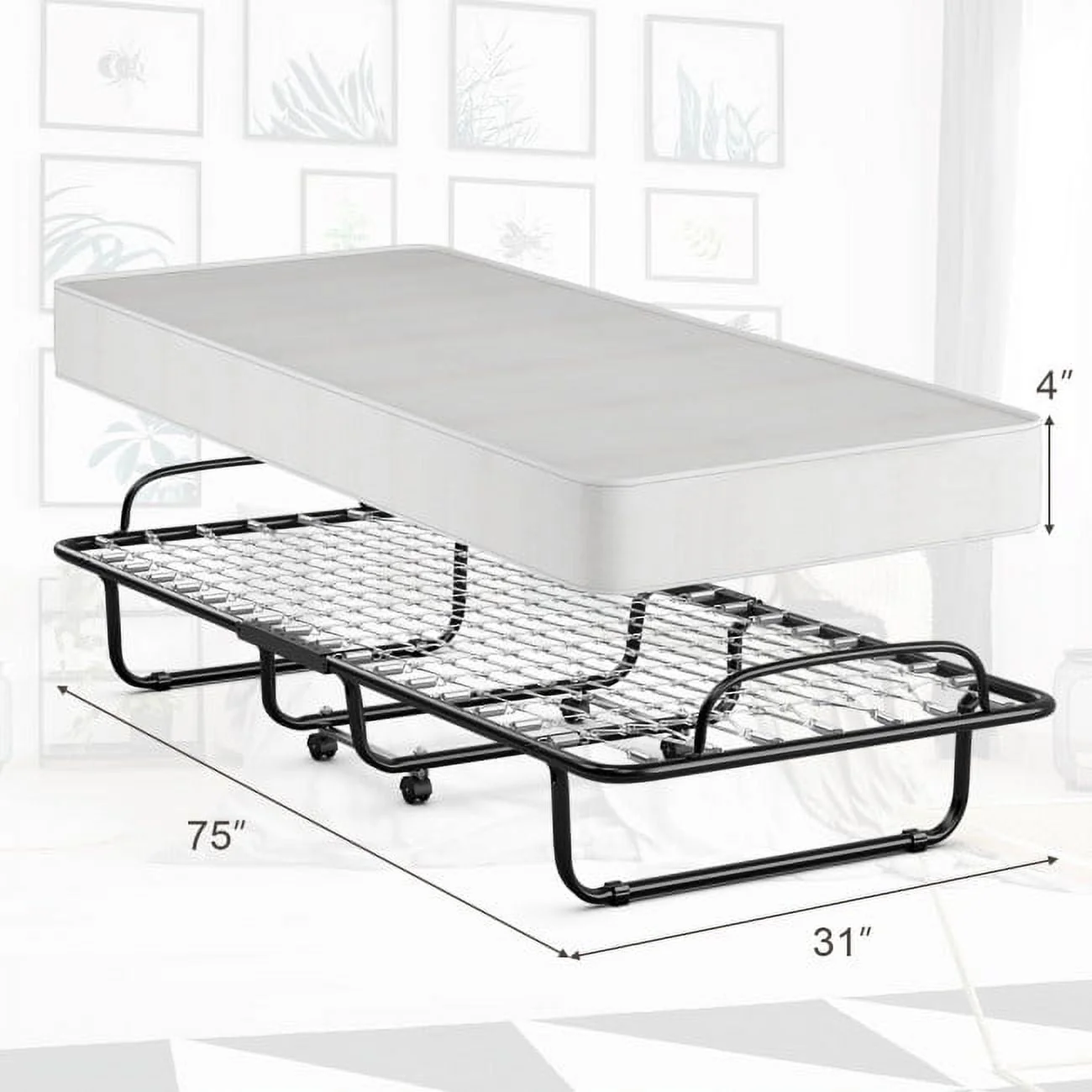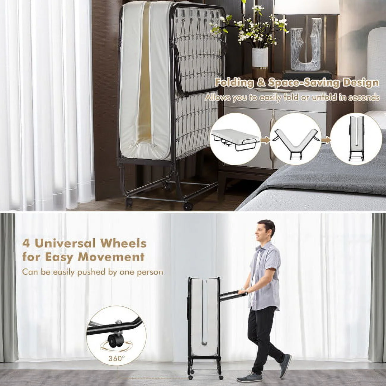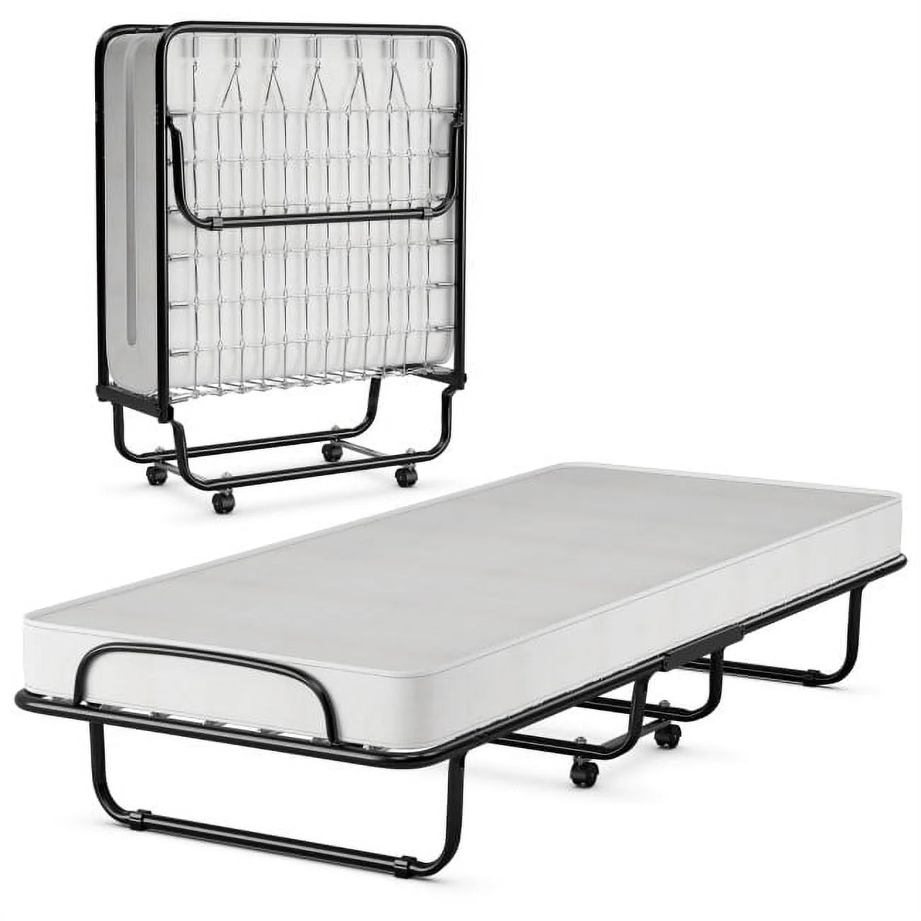 This folding bed with mattress is a good choice for you! The sturdy frame is made of powder-coating steel, which is durable and rust-proof. Besides, dense steel wire and heavy-duty legs can provide powerful support with good load capacity for long term use. Meanwhile, the soft memory foam mattress can offer a comfortable experience for you or your guests. The foldable design allows the bed to be quickly folded into a compact size for storage when not in use. In addition, 4 smooth wheels can be moved anywhere you want by one person. The installation can be assembled in a short time with detailed instruction.